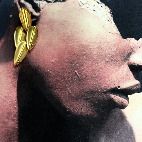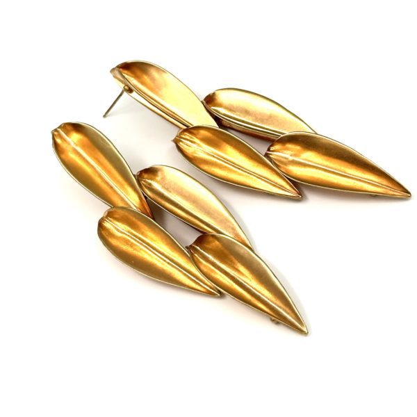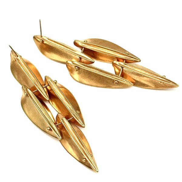 These Robert Lee Morris Large 4 Dart Drop Earrings are from the early 1980’s and reflect the fashion attitude that was growing during that era. There was a demand for bigger and more glorious gold dearrings to be shot on models for magazine covers, and beauty shoots. Cosmopolitan magazine was the leader in va va voom covers, and big earrings were critical to the attitude. These golden earrings were part of the large family of Dart designs. Based on the 4 feather design of a throwing dart, this shape was created into a link for necklaces bracelets, and belts. The Dart earrings were born shortly after the 1981 Calvin Klein fall show which featured the Morris golden leaves hanging from ears of famous models. This earing moves, as seen in the pinned method, each section moving in two ways. 14k posts for pierced ears.