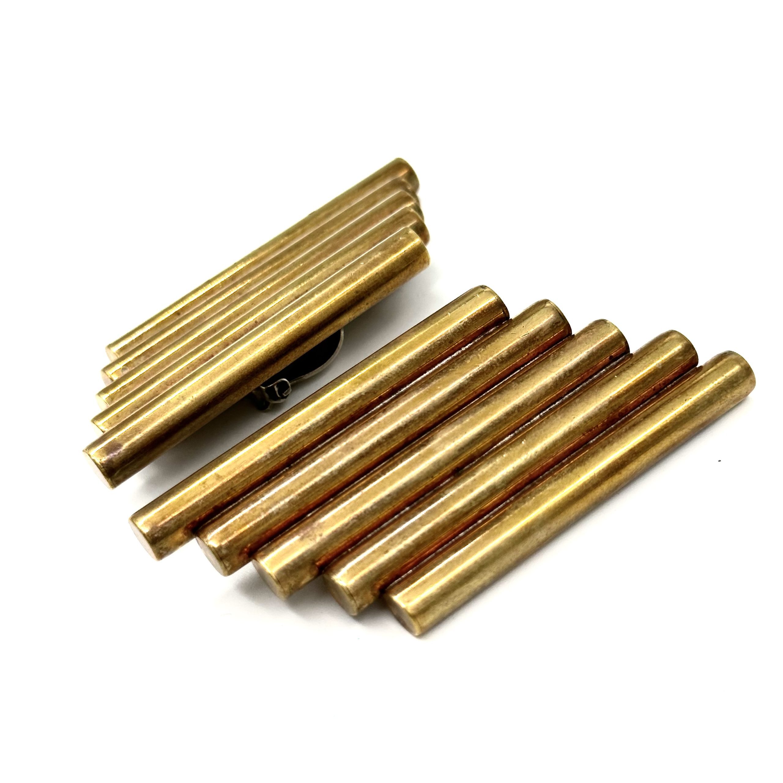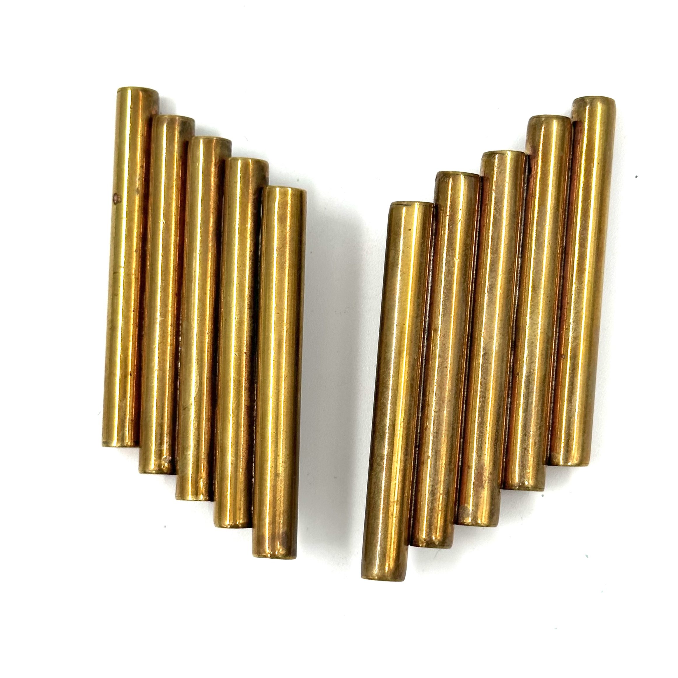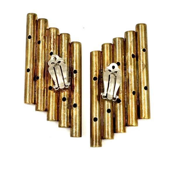 These clip-on Robert Lee Morris Large Brass Helix Earrings were made in collaboration with Karl Lagerfeld in 1985. Karl was doing his first USA collection called KL Sport, and he asked Morris to create the jewelry and belts for his runway show, the fall ’85. These very bold, architectural, and severe designs were in perfect synch with this collection’s direction. Modern, space age and dynamic, the jewelry was almost more hardware than typical jewelry. The Helix name came from an early design of Morris’ where brass tubing was strung at an angle so that when the entire piece bent around the neck or wrist, a beautiful concave curve appeared, like the DNA MOLECULE twists.