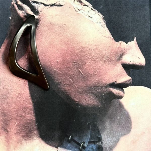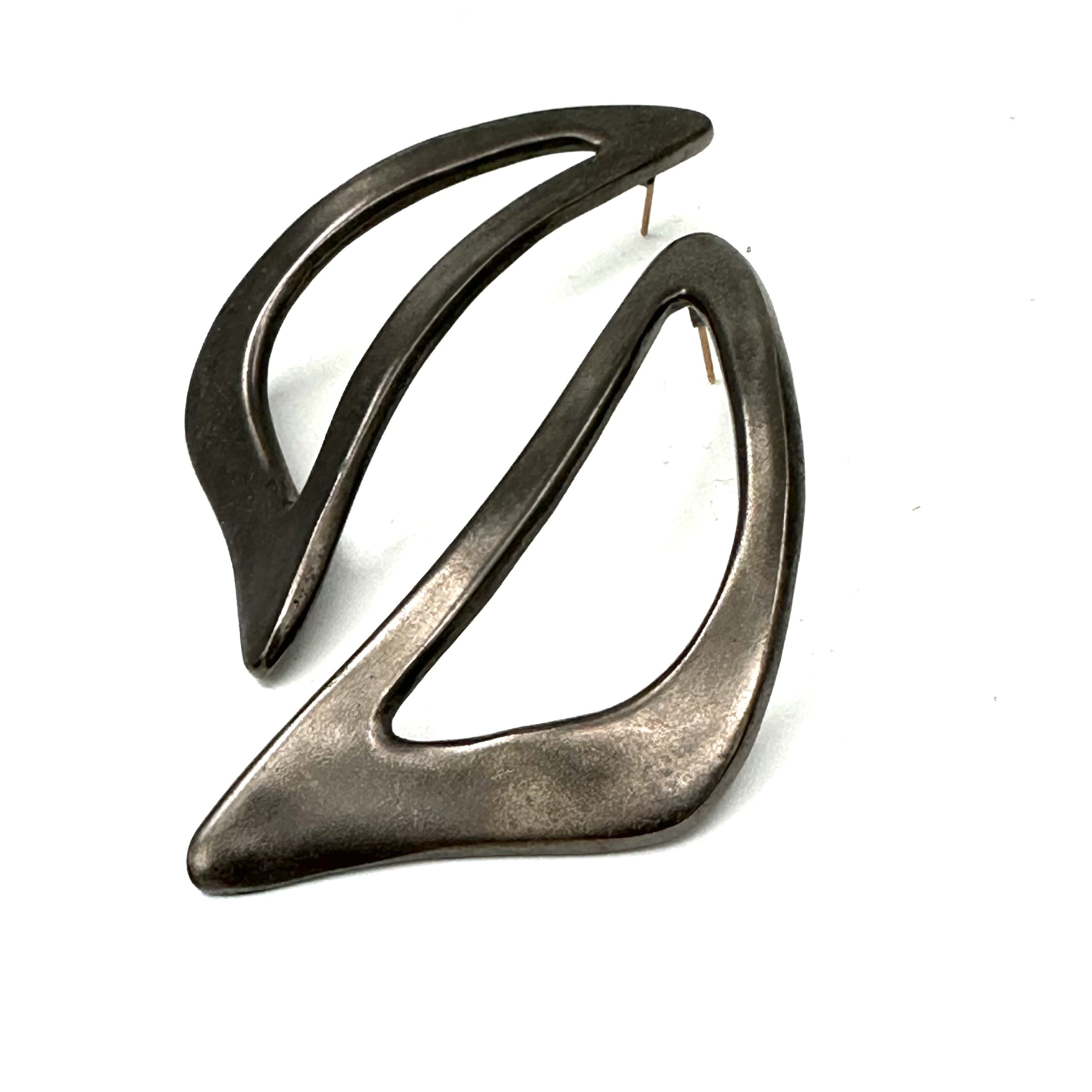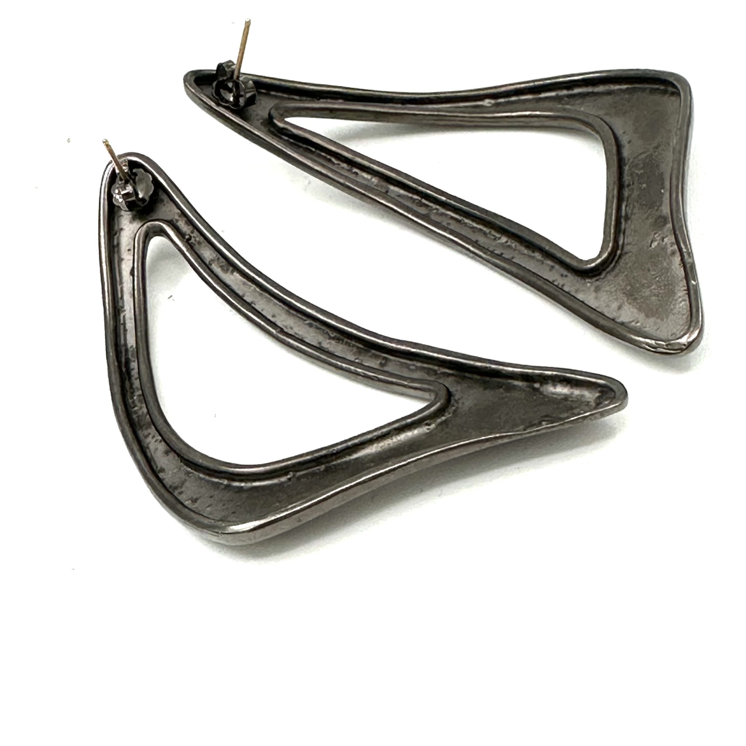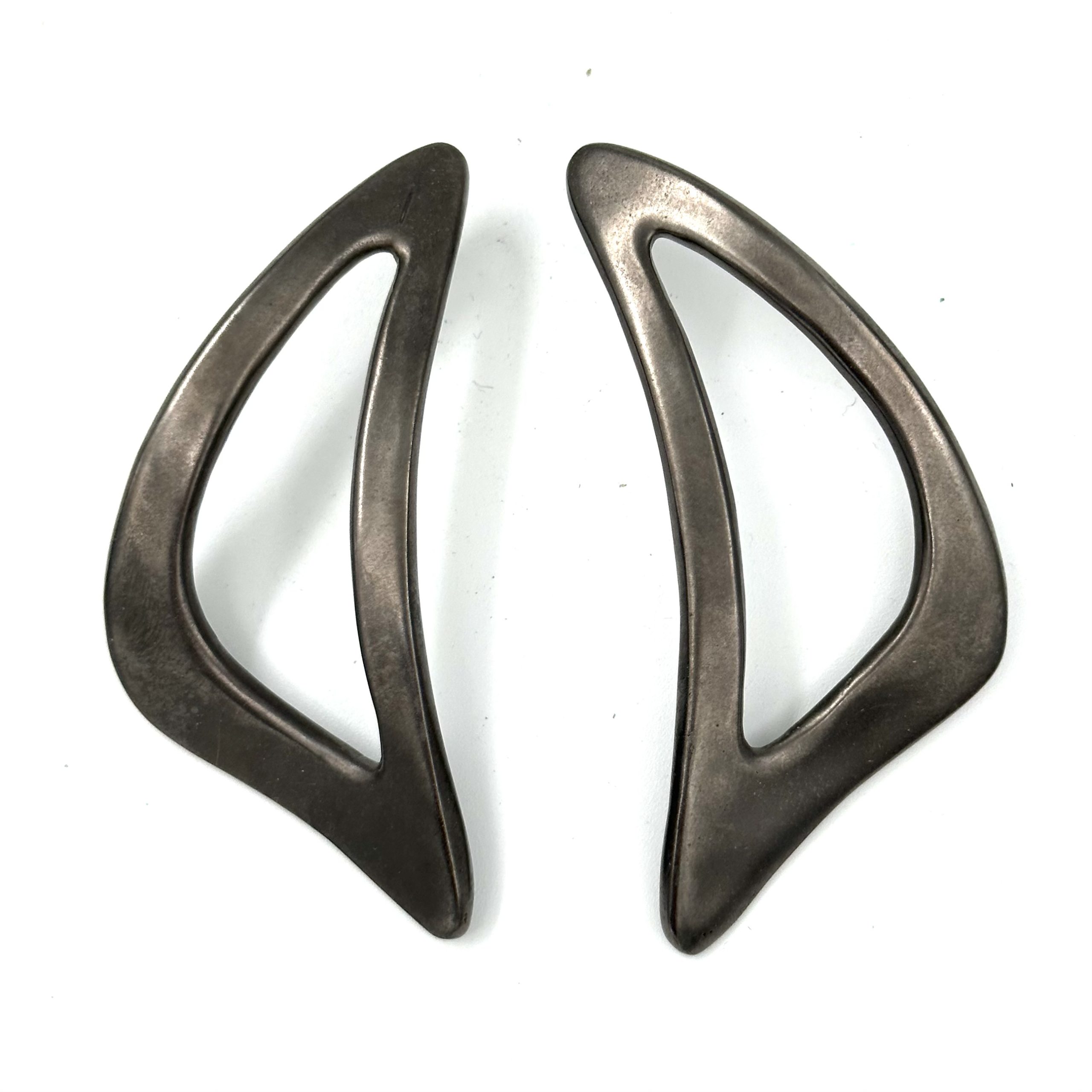 This pair of Robert Lee Morris Large Charcoal Grey Fairy Wing Earrings is bold and stunning. The soft dark charcoal color and the matte surface with just enough glow to reflect light, are one of the many colorations Morris experimented with during his fashion jewelry career. Pierced with 14k posts. These are lightweight enough wear for hours, and yet have a thickened edge which gives iconic volume to the design.