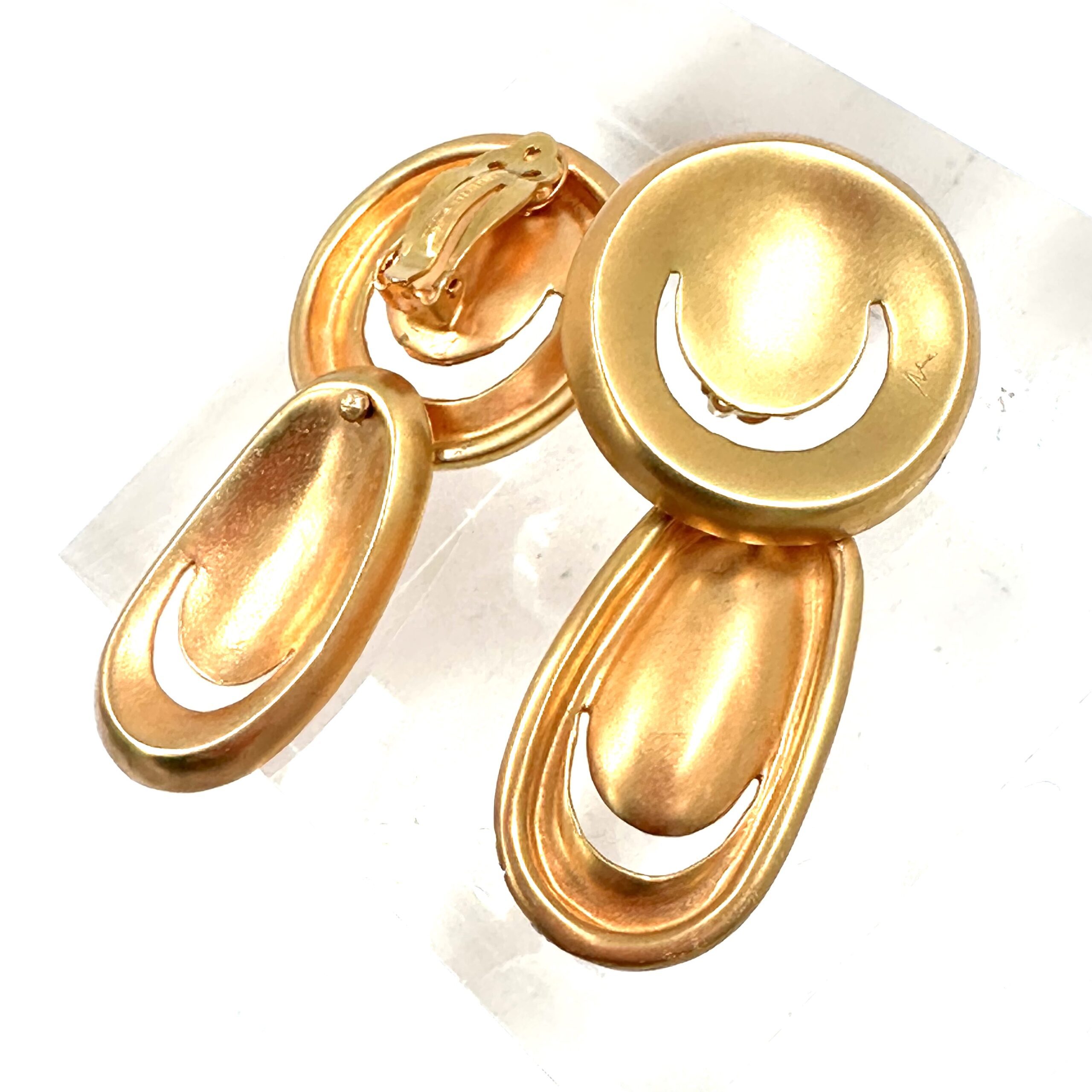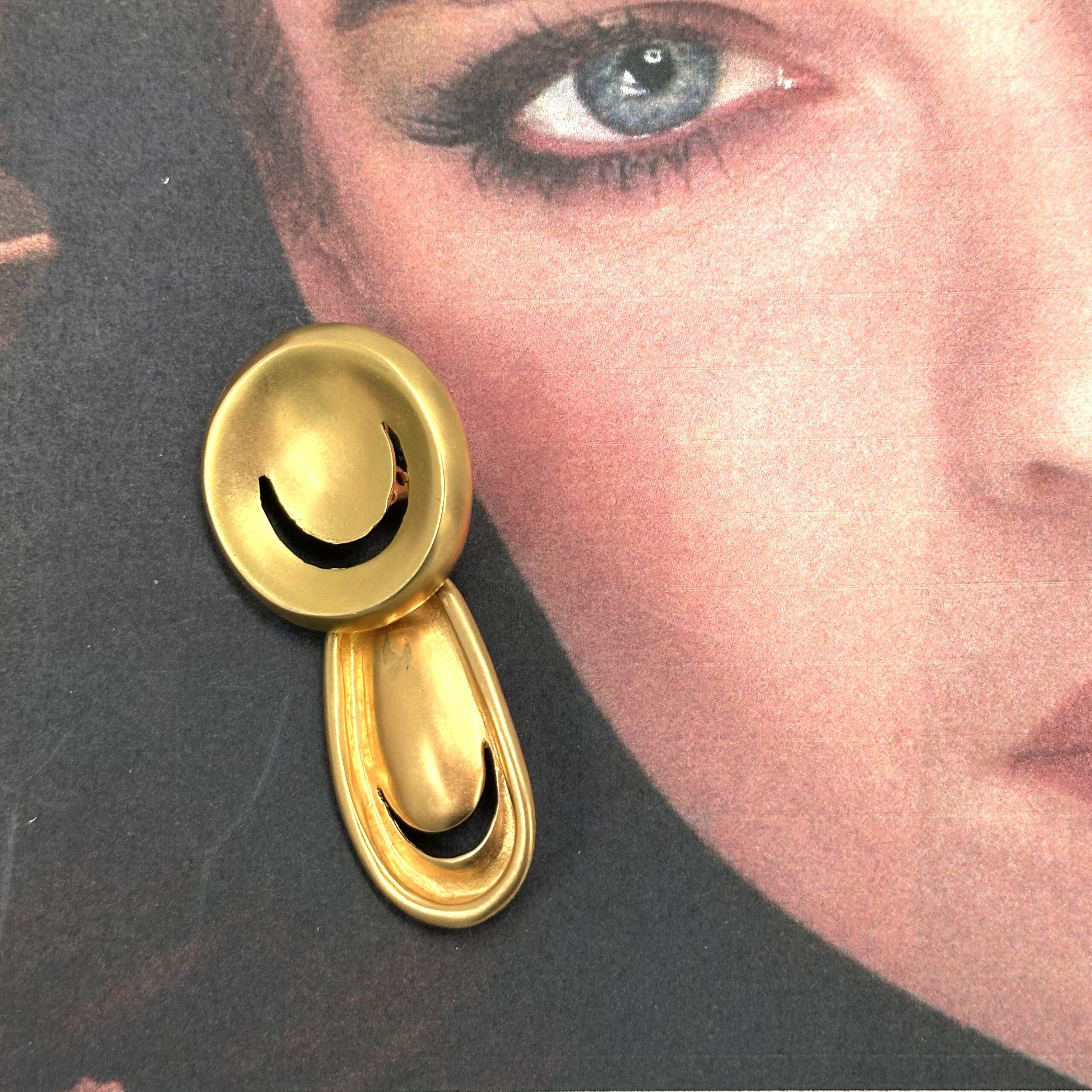 Told Gold Robert Lee Morris Large Dangles w/ Smiles Earrings were the normal size of fashion/runway earrings during the decade of the 80’s. The editors and stylists were devouring all the new big porportions, and the matte gold finish was electric. These are clips and are lightweight and very easy to wear, for the sheer size of them…gold plated brass.