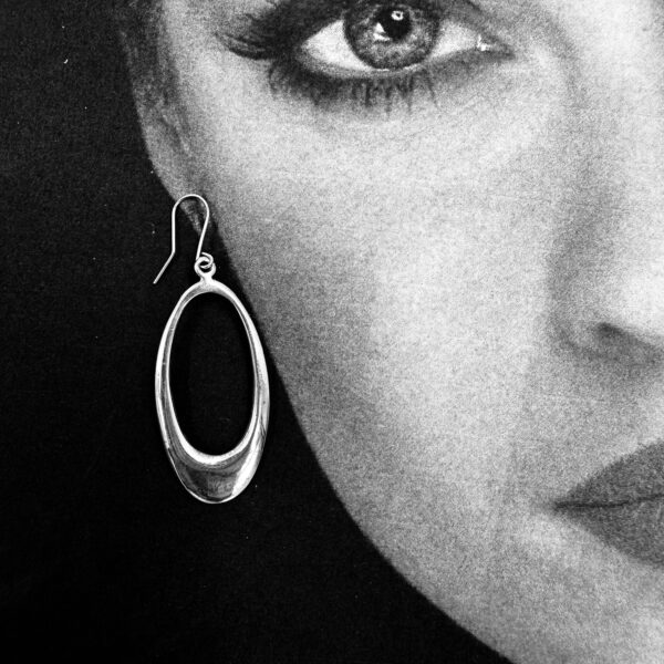 These simple Robert Lee Morris Large Oval Hoop Earrings hang from 14k shepherd hooks Long and lightweight, but dramatic every day wear type earrings. This look is often defined as a minimal cool look.