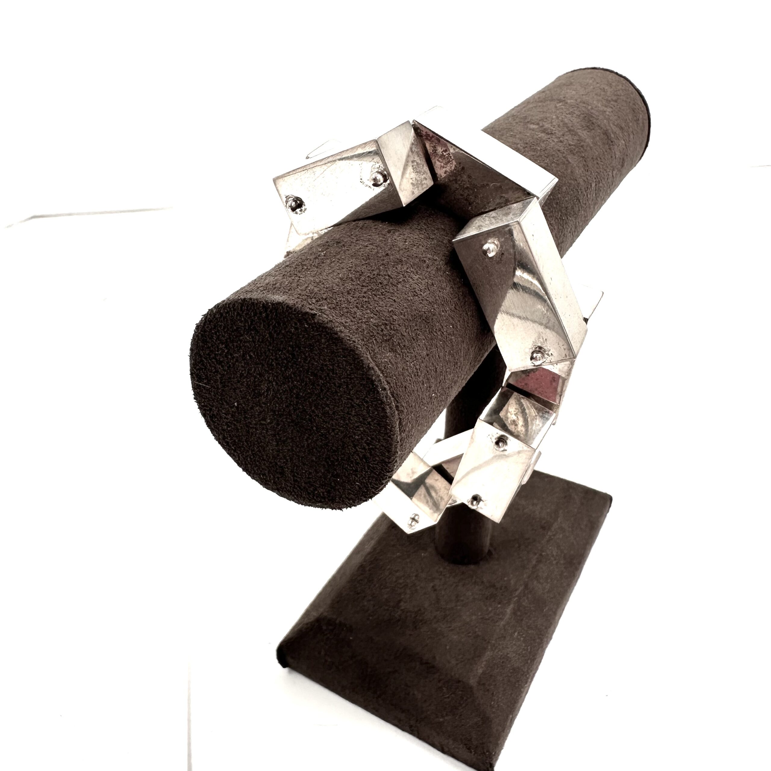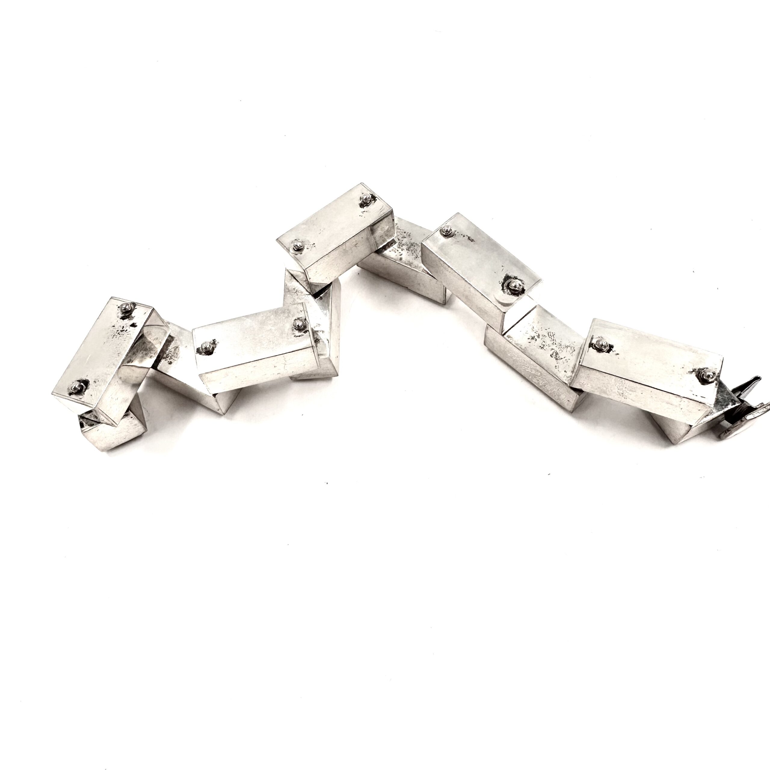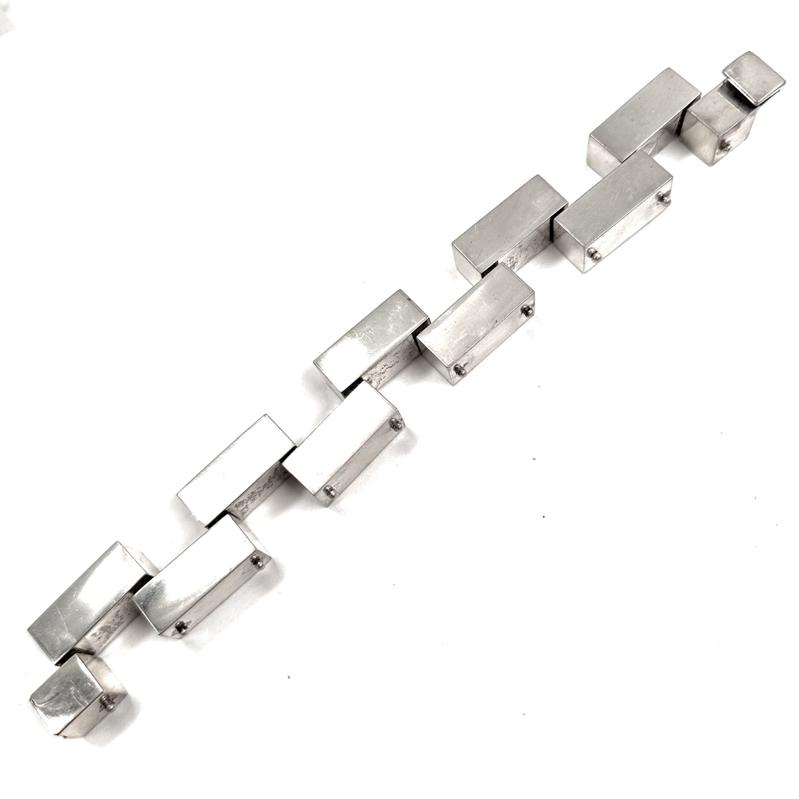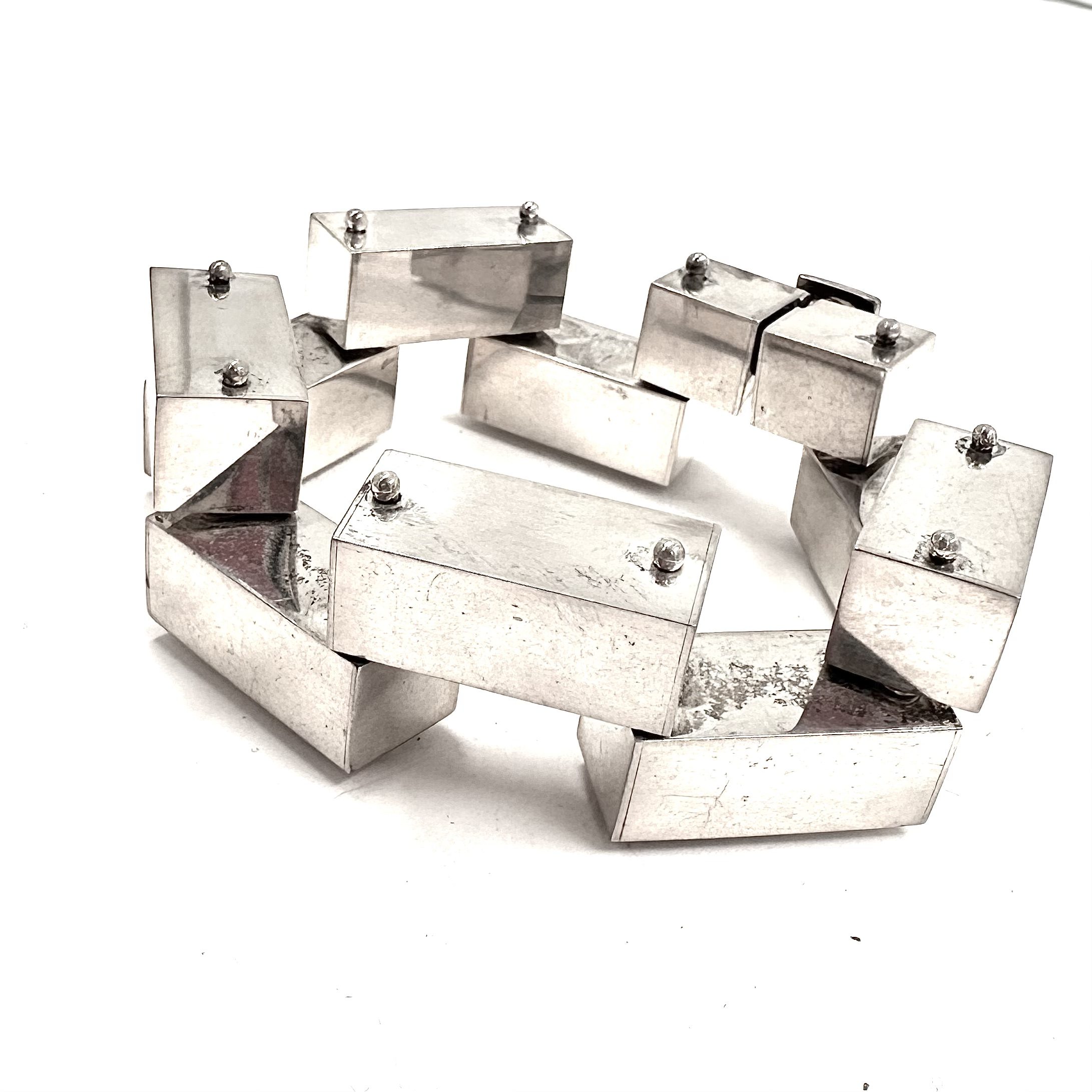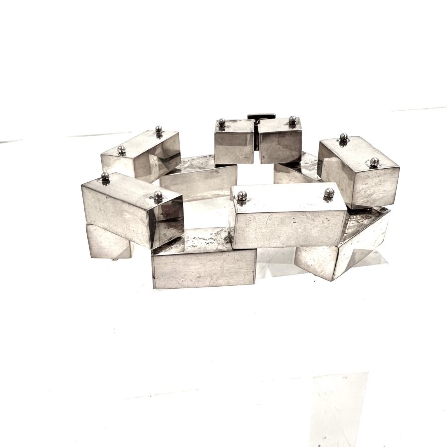 this luscious Robert Lee Morris Large Silver 1×1 Brick Bracelet is a museum piece. The sterling silver bricks are hollow and perfectly polished to look as modern and architecturally beautiful as can be. the bricks are all pinned, or riveted to one another allowing for movement in all directions. Box catch. this is an oversized version of the iconic brick collection Morris did in 1983.