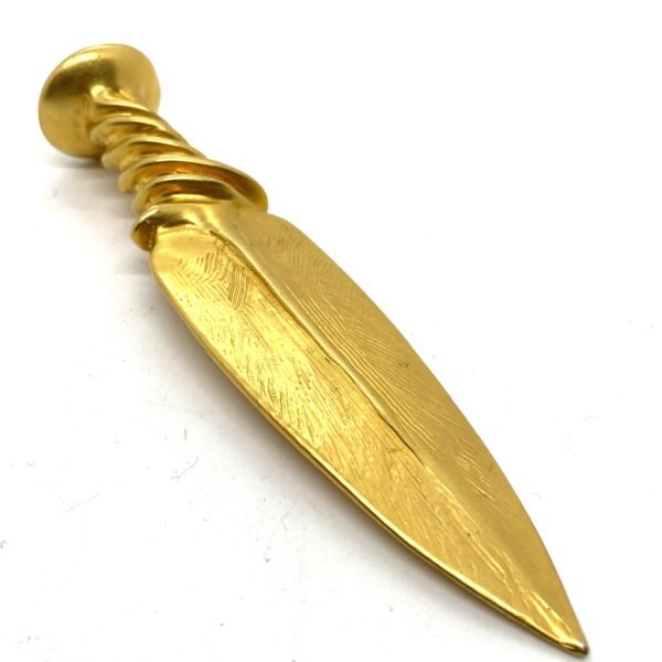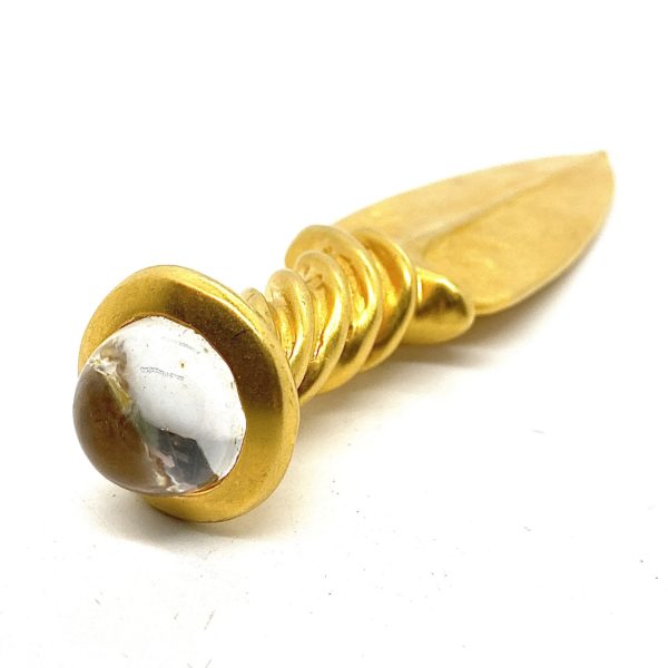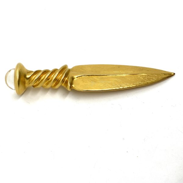 This unique dagger, a “letter opener” with a rock crystal cabochon set into the handle is glorious object for one’s bookcase or desk. Created in late 80’s as part of the growing home accessory collection, this piece is solid gold plated brass.