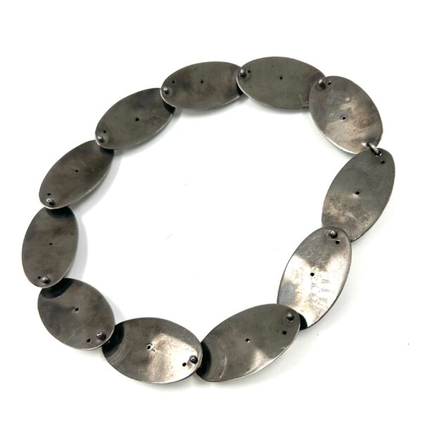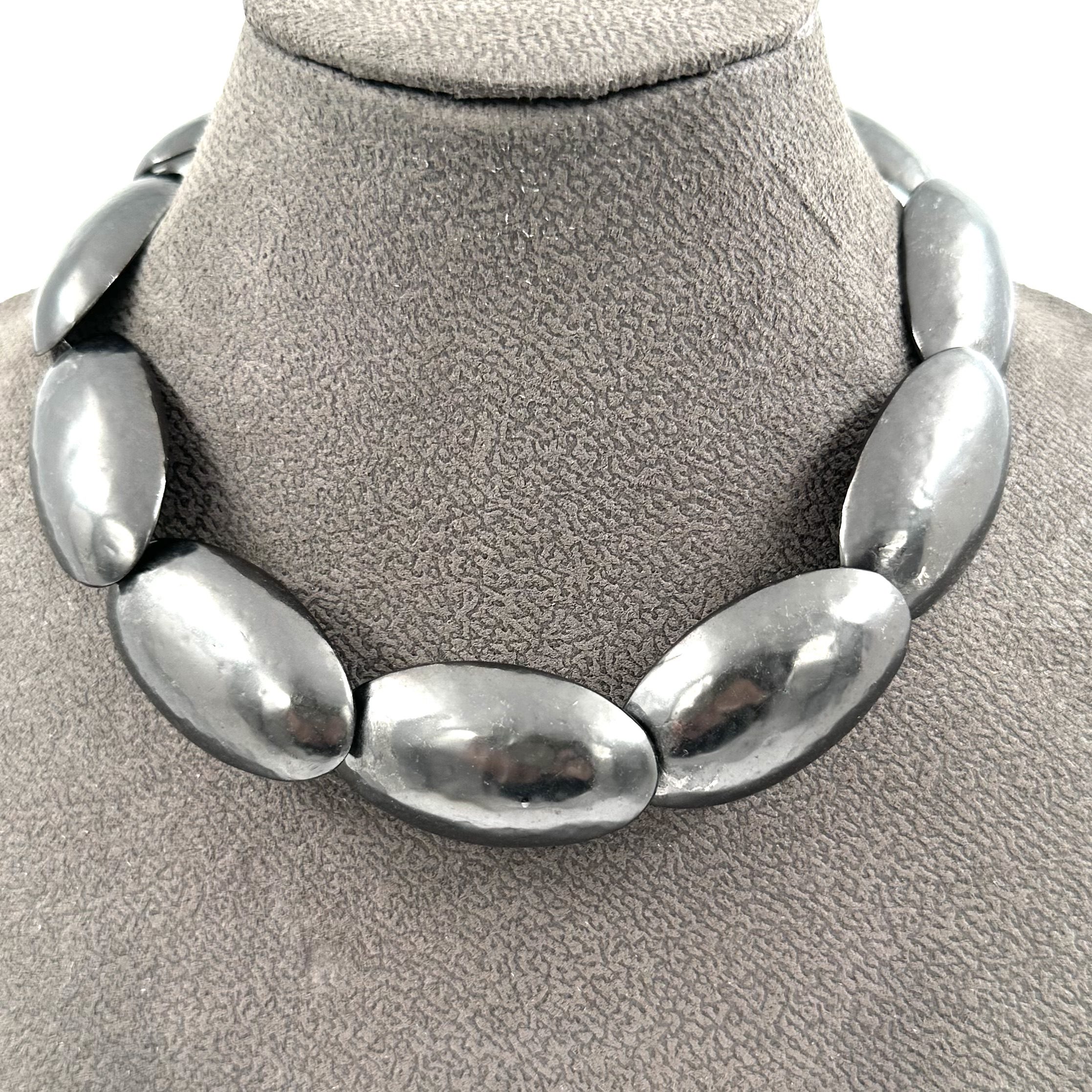 This Robert Lee Morris Large Gunmetal Egg Necklace, is part of the Egg series which preceded the Pebble collection in the mid 1980’s. Moving away from the architectural direction in the early 1980’s, Morris pursued the Egg form. Here is a spectacular short necklace that packs a visual punch! The eggs were hollow castings from wax carvings, joined with a rivet system underneath, and then the brass was electro plated with a luscious metallic gunmetal coating. This finish was very avant-garde and popular in the constructivist time of the early 80’s in fashion. As usual, this design was bold and powerful while also being classic and forever modern.