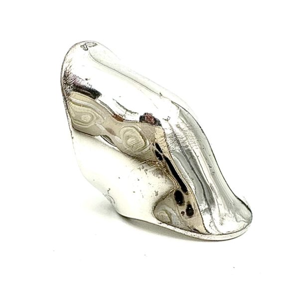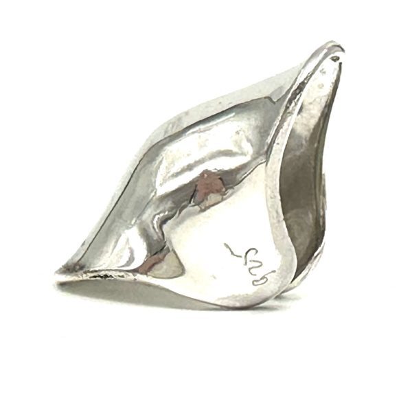This LONG knuckle ring, is next in line to being the longest and sleekest of the knuckle rings family.. These bold unusual and striking rings literally helped secure an iconic look, and a mythical image for Morris at the very beginning of his career. These have been copied all over the world by rip off artists, and have been selling in street markets since the mid 1970’s, but always an inferior product. These rings are sterling silver, made in New York City, and are flexible enough to open up in the back to allow for variable sizing, depending on one’s finger shape and desire to wear it either on the knuckle or below it if possible. Janet Jackson memorialized these rings when she launched her album Velvet Rope where she was interviewed wearing ten rings, one on each finger. Each ring is signed by Morris and marked .925 which is the mark for sterling silver. In the photo of the white hand, it is the ring on the ring finger.