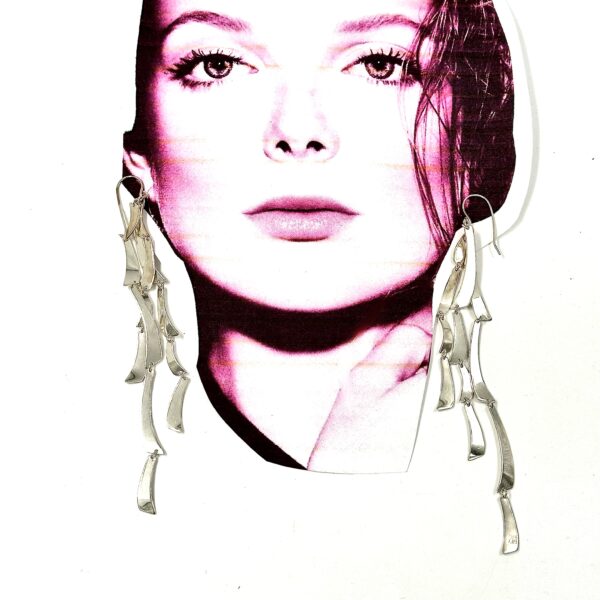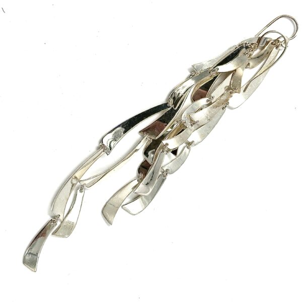 These Robert Lee Morris Long Silver Petals Chandelier Earrings are silver plated but gloriously gorgeous and exaggeratedly long at 5.5 inches. Made of connecting long curved petal forms, this earring catches the light and moves beautifully.