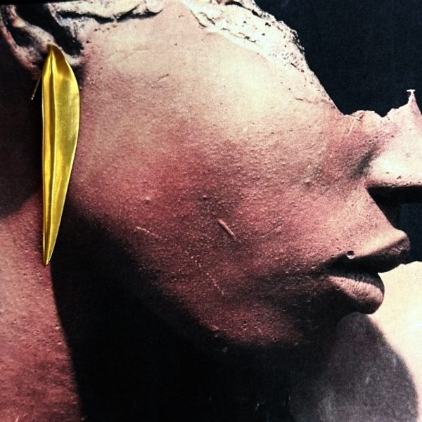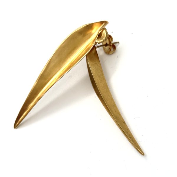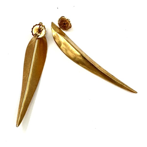 These Robert Lee Morris Medium Gold Plated Blade Earrings were created in 1980-81 for the Calvin Klein fall collection. The theme of gold leaves was a portion of this Coty Award-winning collection of fashion jewelry. Inspired by ancient gold jewelry in a Japanese museum in Kyoto, Morris created his version which became an enormously popular earring across the country. It also comes in clusters of two and three using various sizes of the “blades of grass”. Pierced.