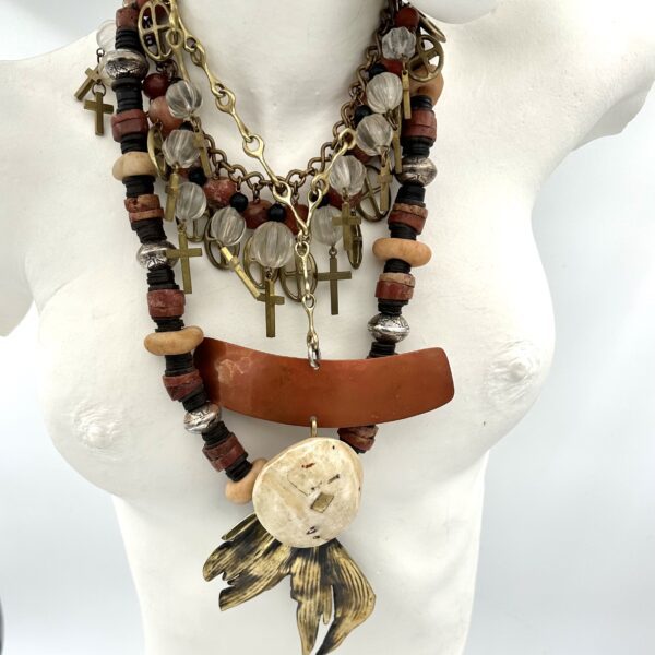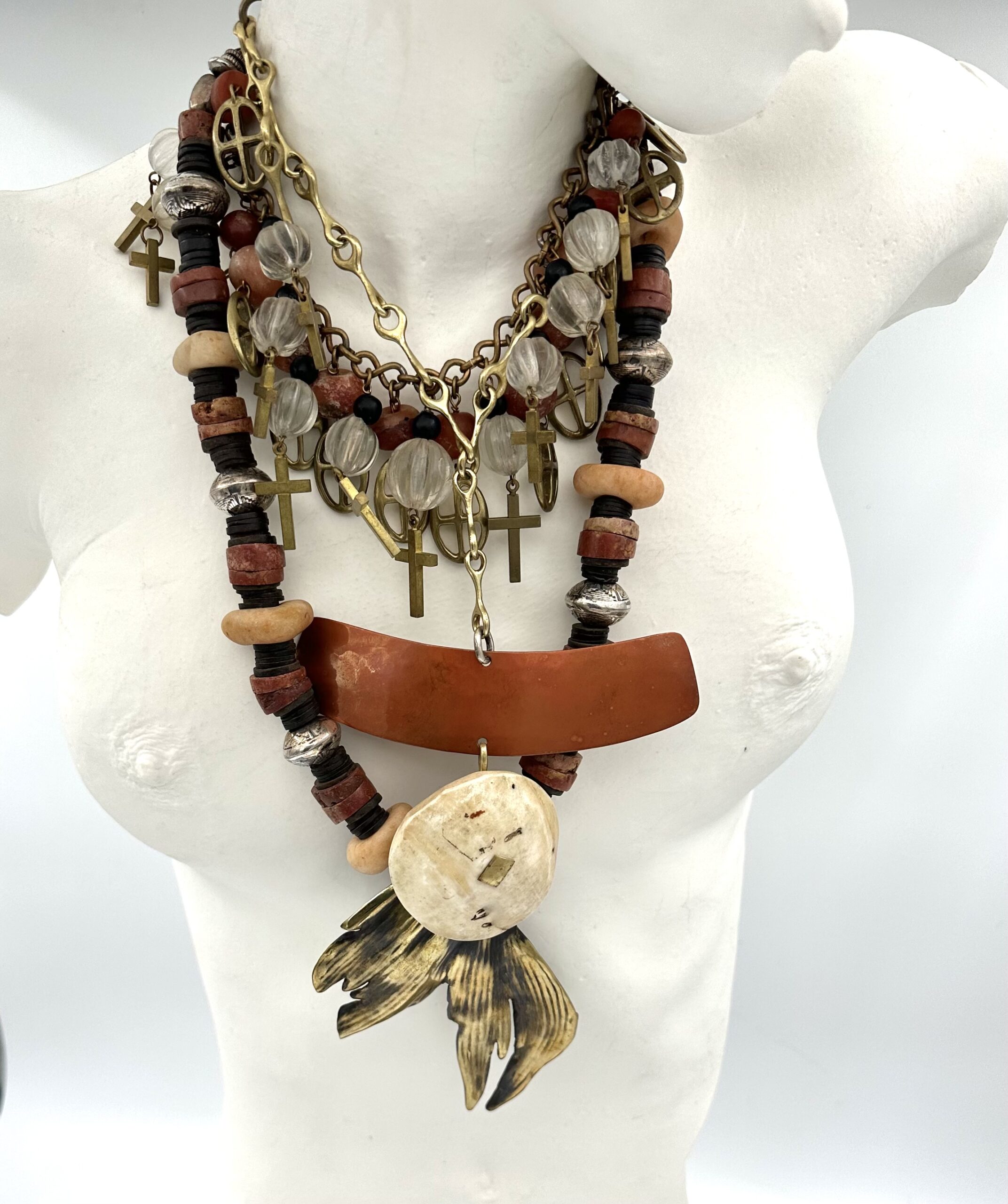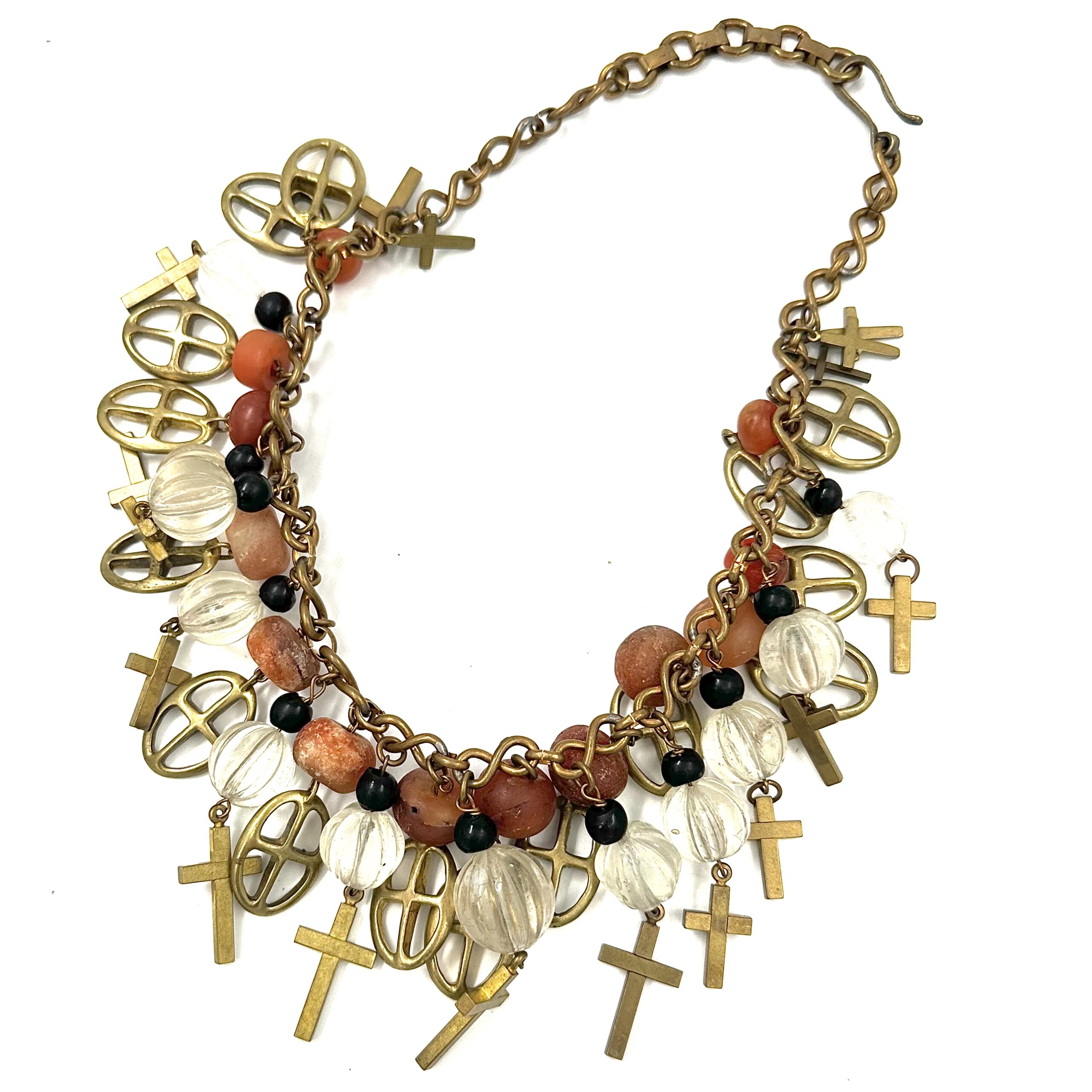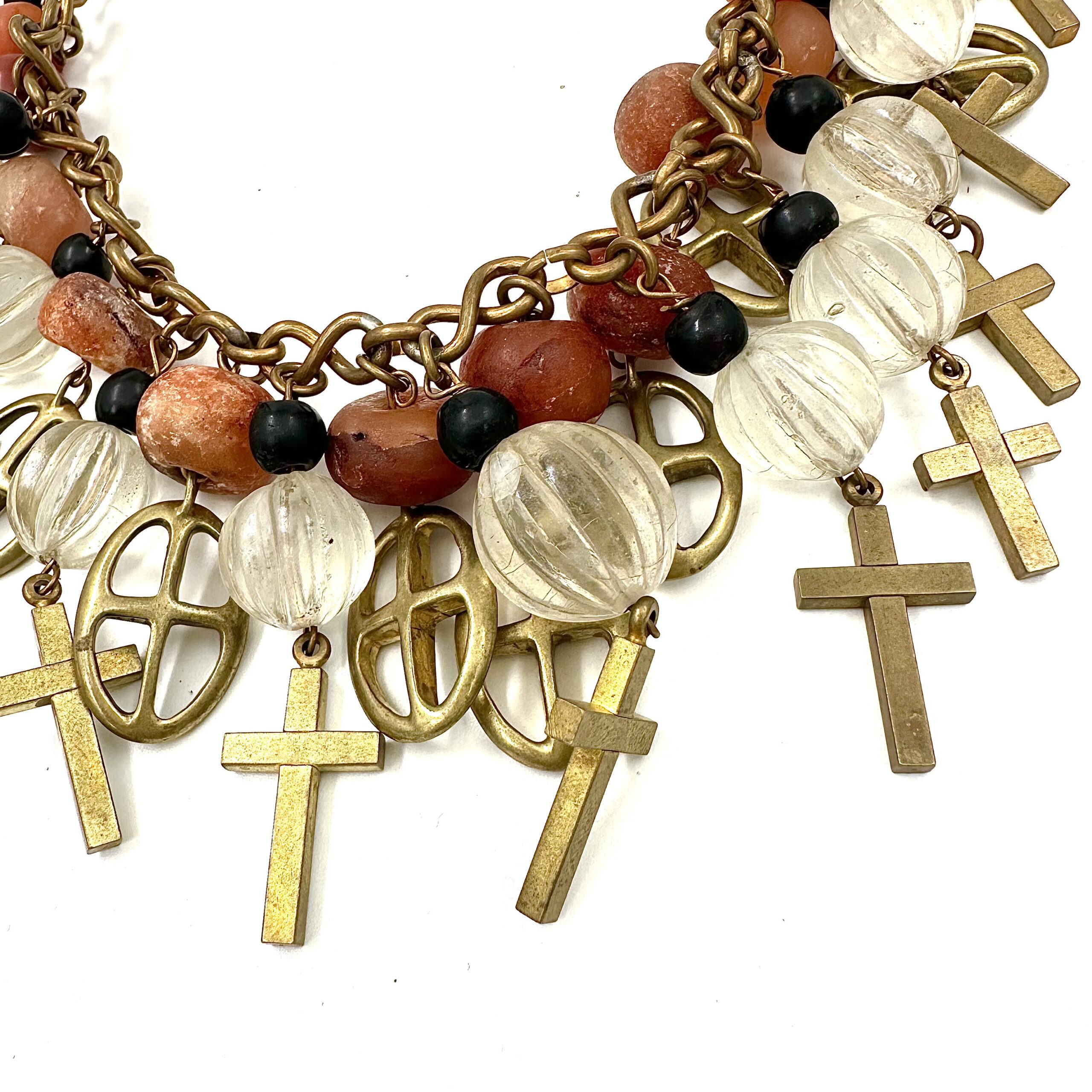 This rare Robert Lee Morris MultiMedia Fringe Choker is from the 1986-87 era and is a glorious mix of brass glass and stone in a dangling fringe-style necklace. The coloration is warm and comforting with clear glass melon beads and brownish-tan hand-drilled river stones, rough and golden mixed with dark black glass beads. Hanging intermittently are brass crucifixes and oval cellular crosses. Morris was obsessed with the cross design and worked with it for his entire career. There is one other of these necklaces on this website with gold-plated elements. As seen in the thumbnails this is a great necklace for layering with other like minded pieces.