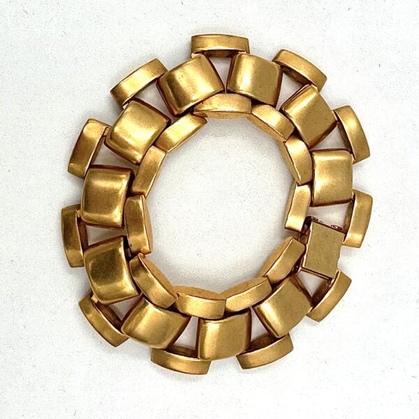 This handsome Robert Lee Morris Neo Tire Track bracelet is part of the men’s collection due to its masculine style. Soft and flowing, with a gorgeous matte gold plating on brass, this is easy to wear and comfortable. The clasp is a foldover style and very secure. It is called Neo tire Track as trying to name these abstract designs is hard to do! Because it could look like the tracks in the mud made by a tire….