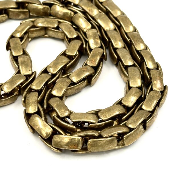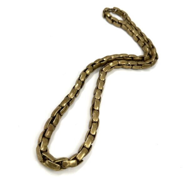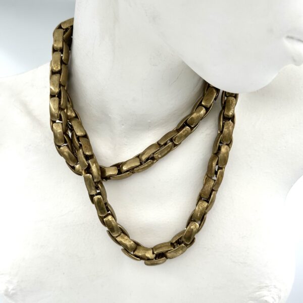 This Robert Lee Morris Oxidized Brass Braid Chain is a 36″ long construction with a subtle, invisible hook closure. It is quite hefty, being solid brass, and is nearly 16oz. It can be worn as one long burnished gold chain or doubled around the neck as seen in the thumbnails. Created in the mid-1980s as part of his continuing exploration of new ways to make unique signature chains, this is a luxurious piece of Wabi Sabi jewelry. (Jewelry with a used and worn character filled with soul).