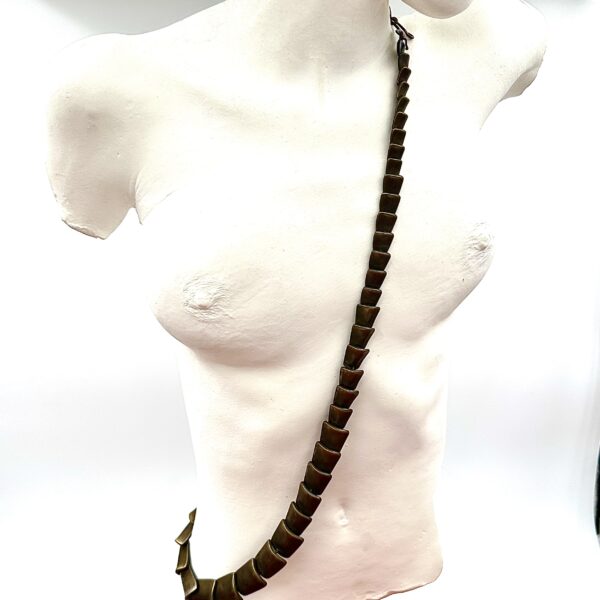 This Robert Lee Morris Oxidized Brass Snakescale Body Wrap is a very iconic and vintage masterpiece. Graduated and sinuously flexible, this body wrap can be worn many different ways, as there are 2 hooks that can grab and hold the scales anywhere along the entire length. Oxidized a warm burnished brown this is a rare but important addition to one’s collection of RLM jewelry. The brass castings are linked one over the next by a signature balled up rivet system. At 41″ long this necklace can be worn simply as a long look or doubled over a few times, or worn across the body or around the waist, over a sweater or just enjoy it hung from your bedroom mirror.