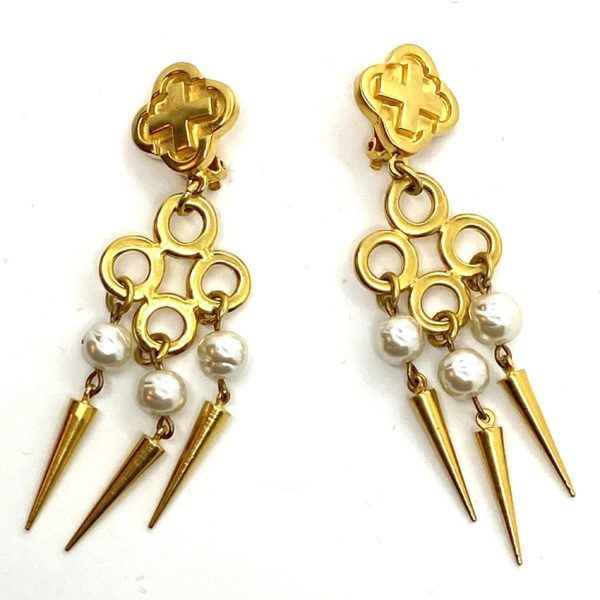 Created in the early 1990’s, this pair of clip-on chandelier earrings are gold plated brass with pearls. Continuing to develop cross themed jewelry, these beauties are forever classic and chic.
