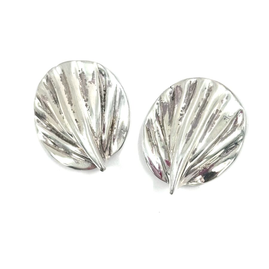 Robert Lee Morris Pinched Silver Shell Earrings are from 1981, when Morris was experimenting with realistic textures, draping warm wax over organic objects and casting them. The results are what looks like a softly molded shell, and it is worn with the fared end up, pointed end down, clip ons.