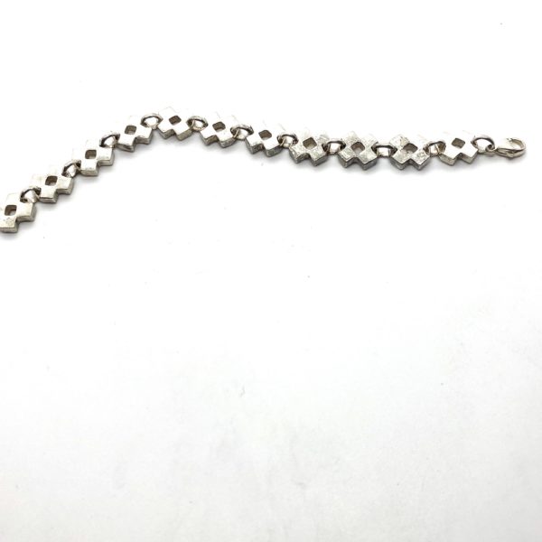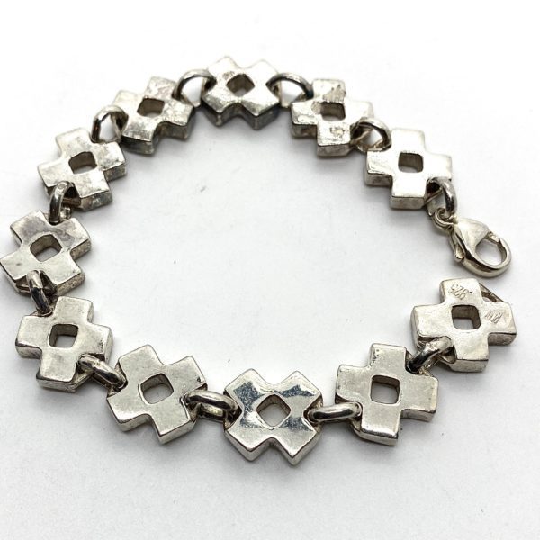 During the many years when cross form were so popular and omnipresent in fashion and hip hop, I added this oddball to my men’s collection, of solid thick crosses, or X’s with a square hole in the center. I ended up looking like the pattern Pinking Shears make when cutting fabric, leaving a ragged edge. This sterling silver cross bracelet is chunky, hefty and nice to wear.