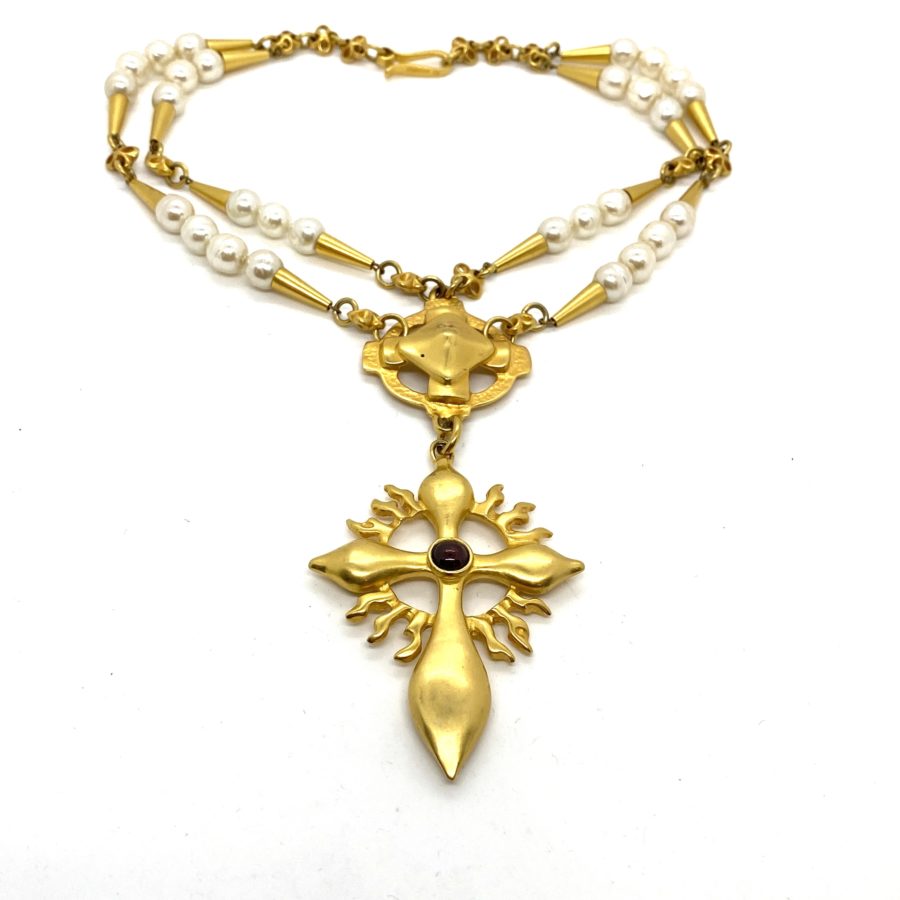 The large soft undulating cross pendant has a halo of radiating flames of light and a beautiful deep red garnet cabochon in the middle of it. It is hang ing from another cross form above it and hangs from double strands of pearls and golden beads. 18″ long, this is a showstopper rass.and a dramatic piece of fashion history. Gold plated b