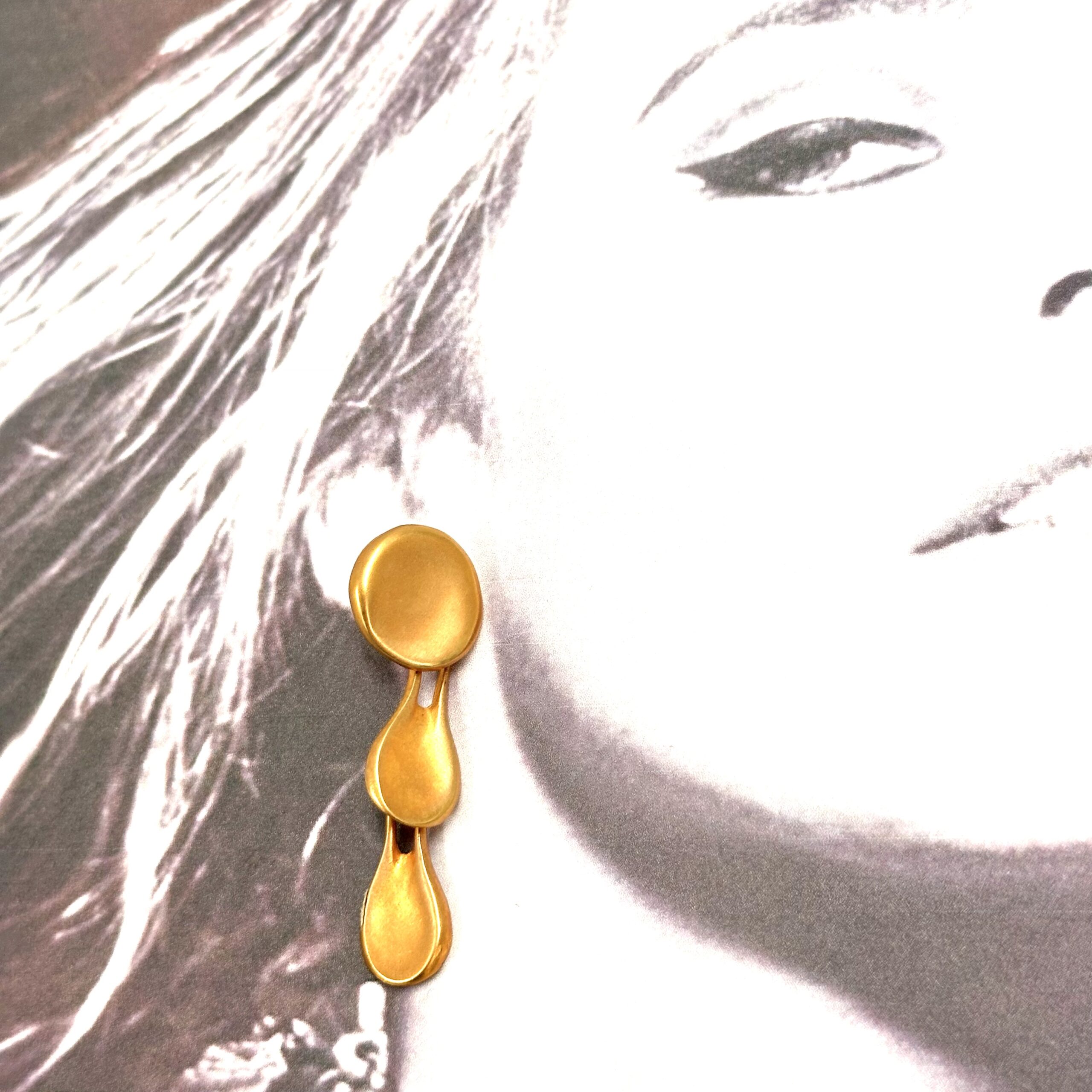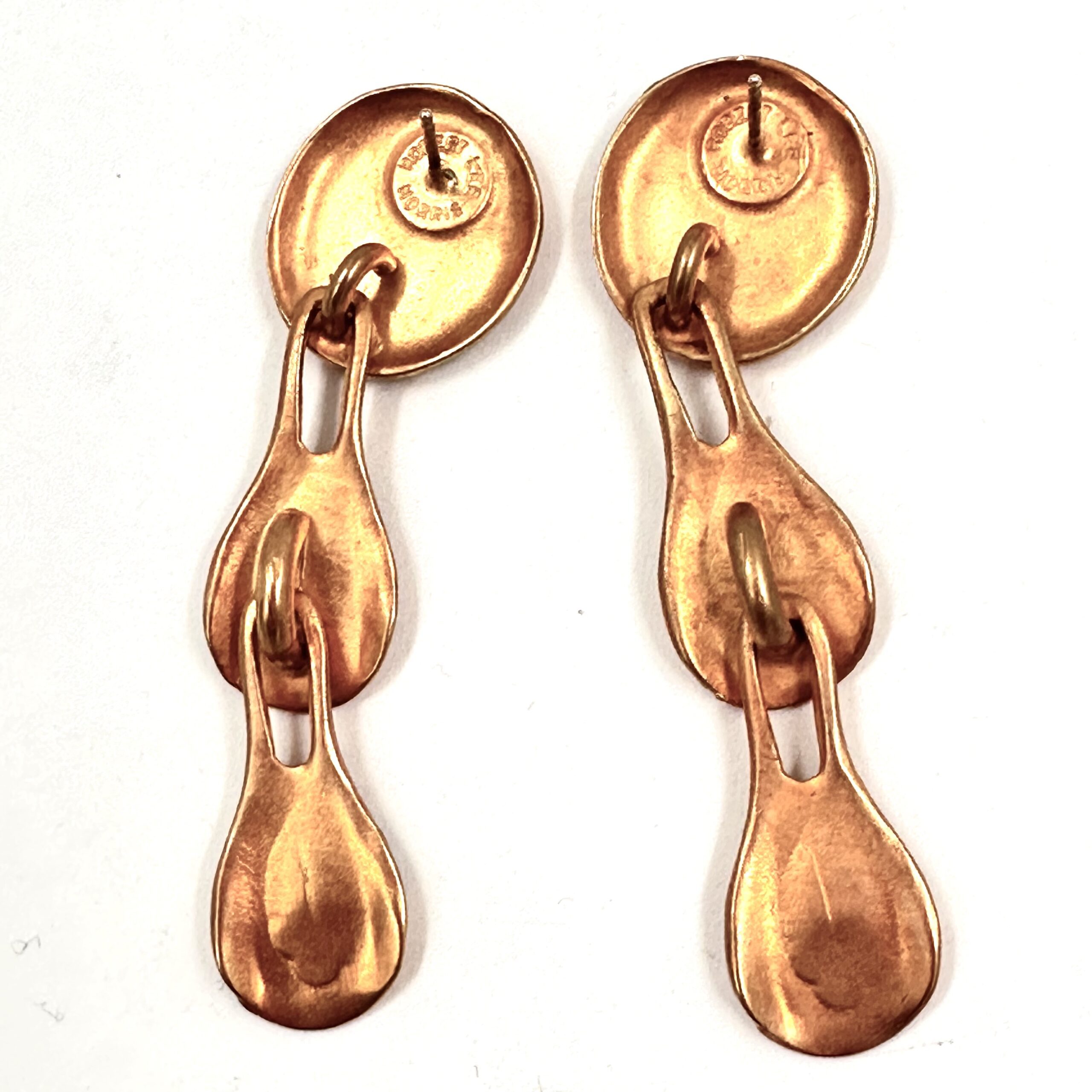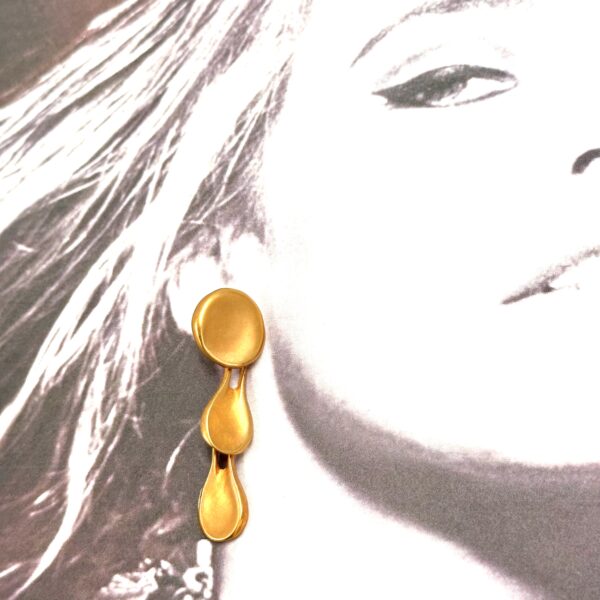 These Robert Lee Morris Raindrop Earrings are a nice lightweight but dramatically long gold pierced earring. Gold plated brass. The top is an iconic concave pebble form from which drip down two tear drop shapes.