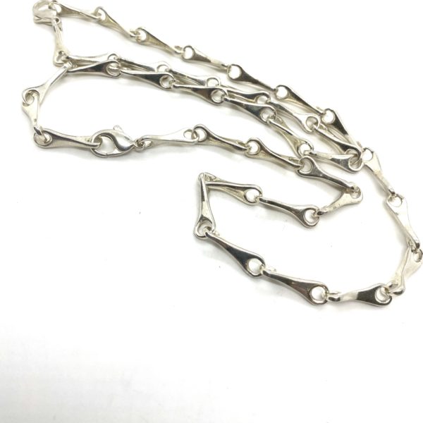 This simple chain necklace is long at nearly 30″, and is made of a twisted rod of silver that has a hole at each end for linking into one another. Based on designs I was playing with at the very start of my jewelry making career, in 1970. This is a men’s collection favorite.
