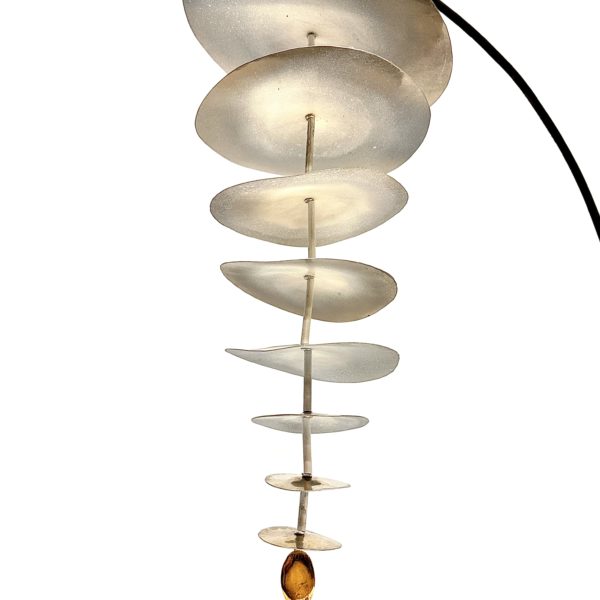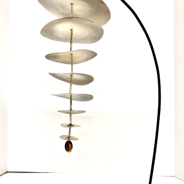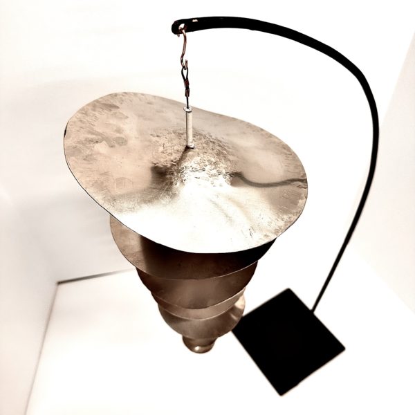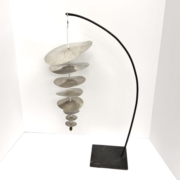 Robert Lee Morris Sculpture, #110 White Nickel Dustdevil Mobile, constructed of graduated sizes of forged nickel discs. The underside is white, and the reflection of the shiny nickel onto the white surface above each disc creates a special kind of magic. The lighting is moody, and the feeling of the suspended form in the air is calming. The stand is a black metal curved hanger and the end of the sculpture, at the bottom of the smallest disc, is a shiny brass seed form, a lovely ending to the plant like artwork. At 24″ tall, this piece is very versatile for placement in the home or office environment. Iconic in the use of the logo like disc, the creation of motion and fluidity is the hallmark of Robert Lee Morris work. The name Dustdevil is due to the abstract image of a whirling tornado of dust one sees out in nature.