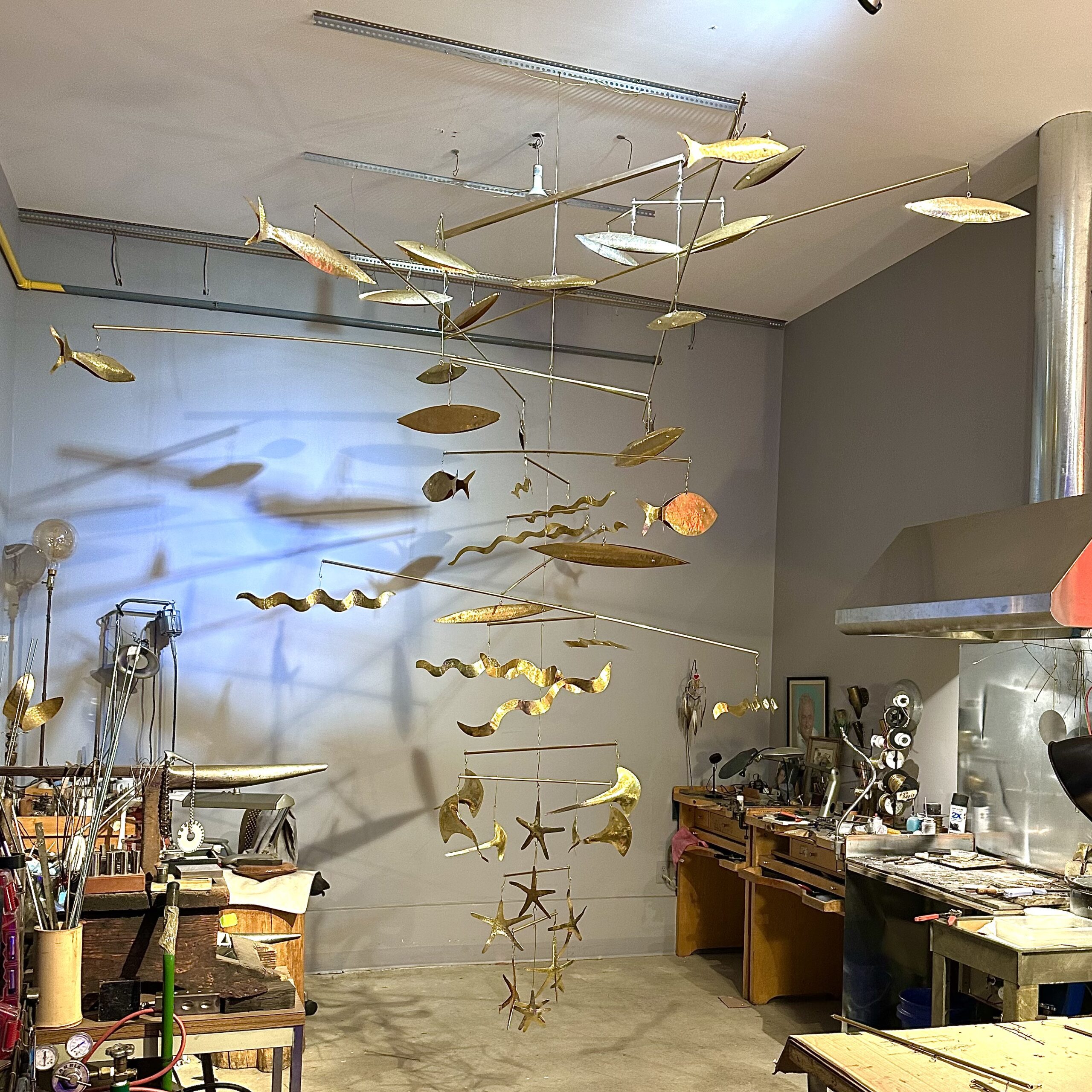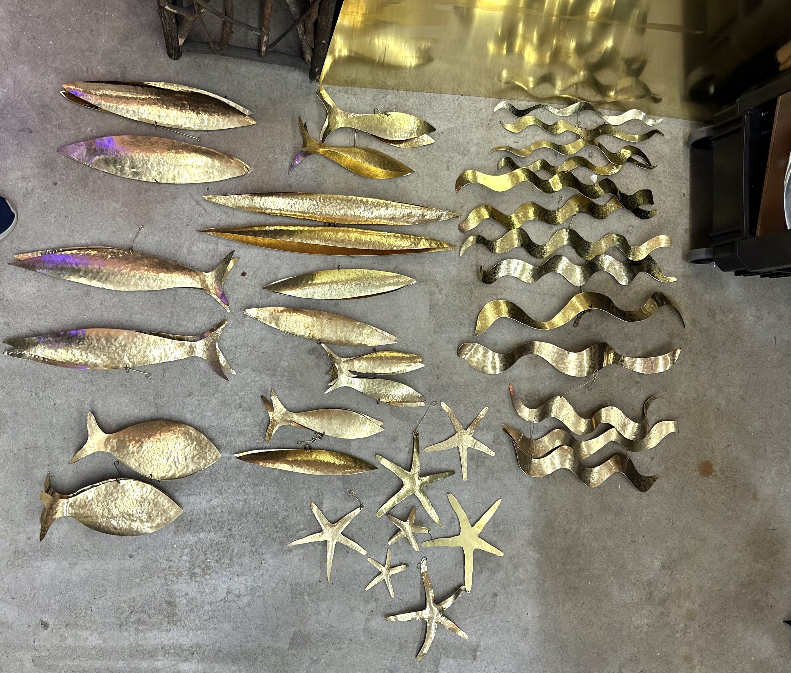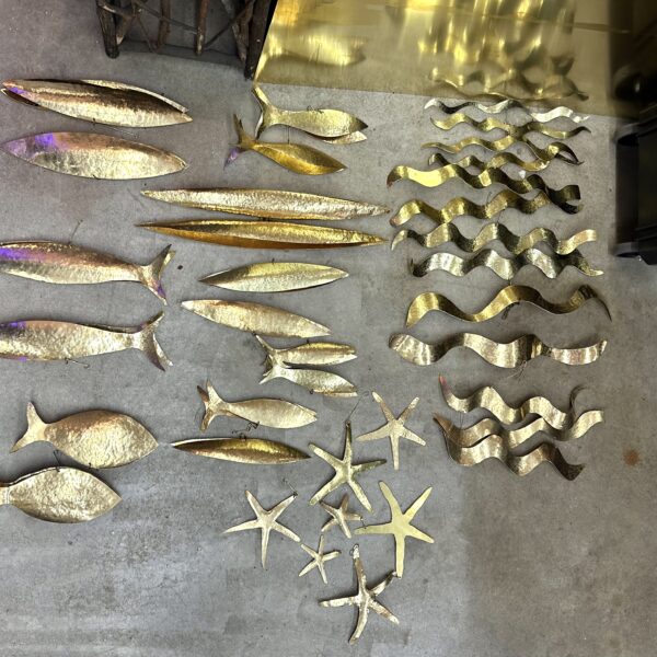This Robert Lee Morris Seaforms Mobile was recently installed in a Palm Beach home with a 24 ft ceiling. It is made entirely of brass, and features whimsically crafted fish, waves, sting rays and starfish.