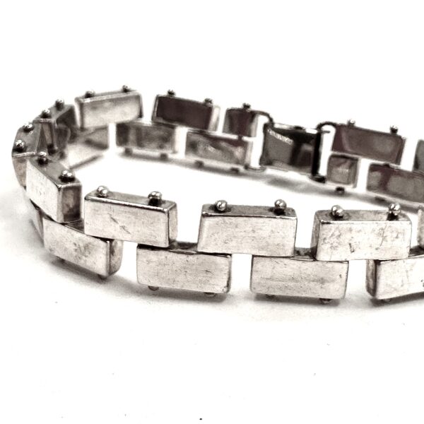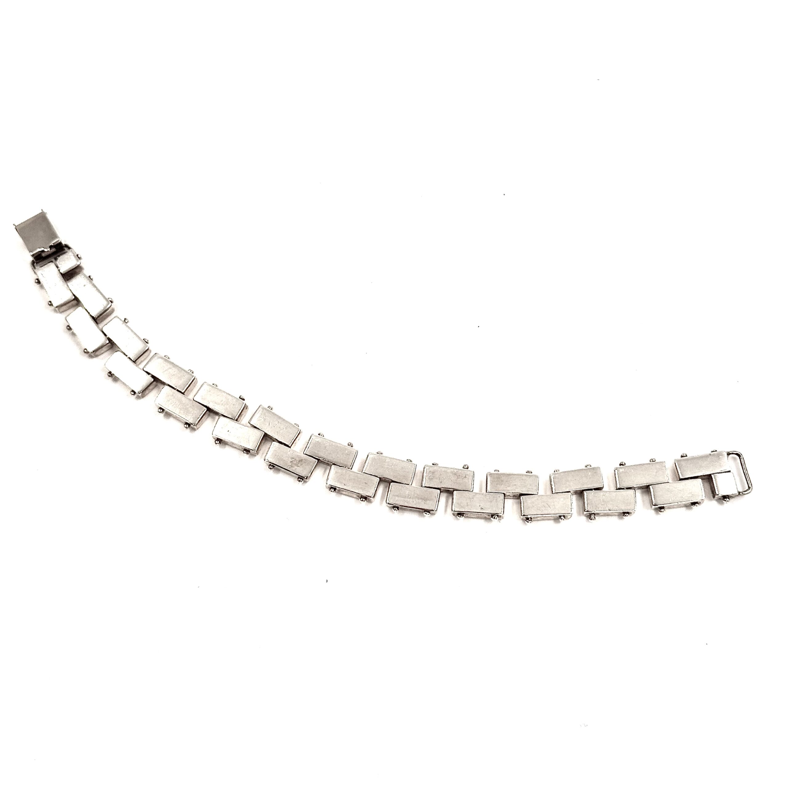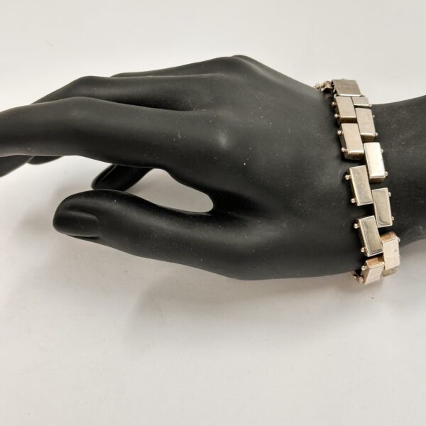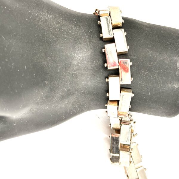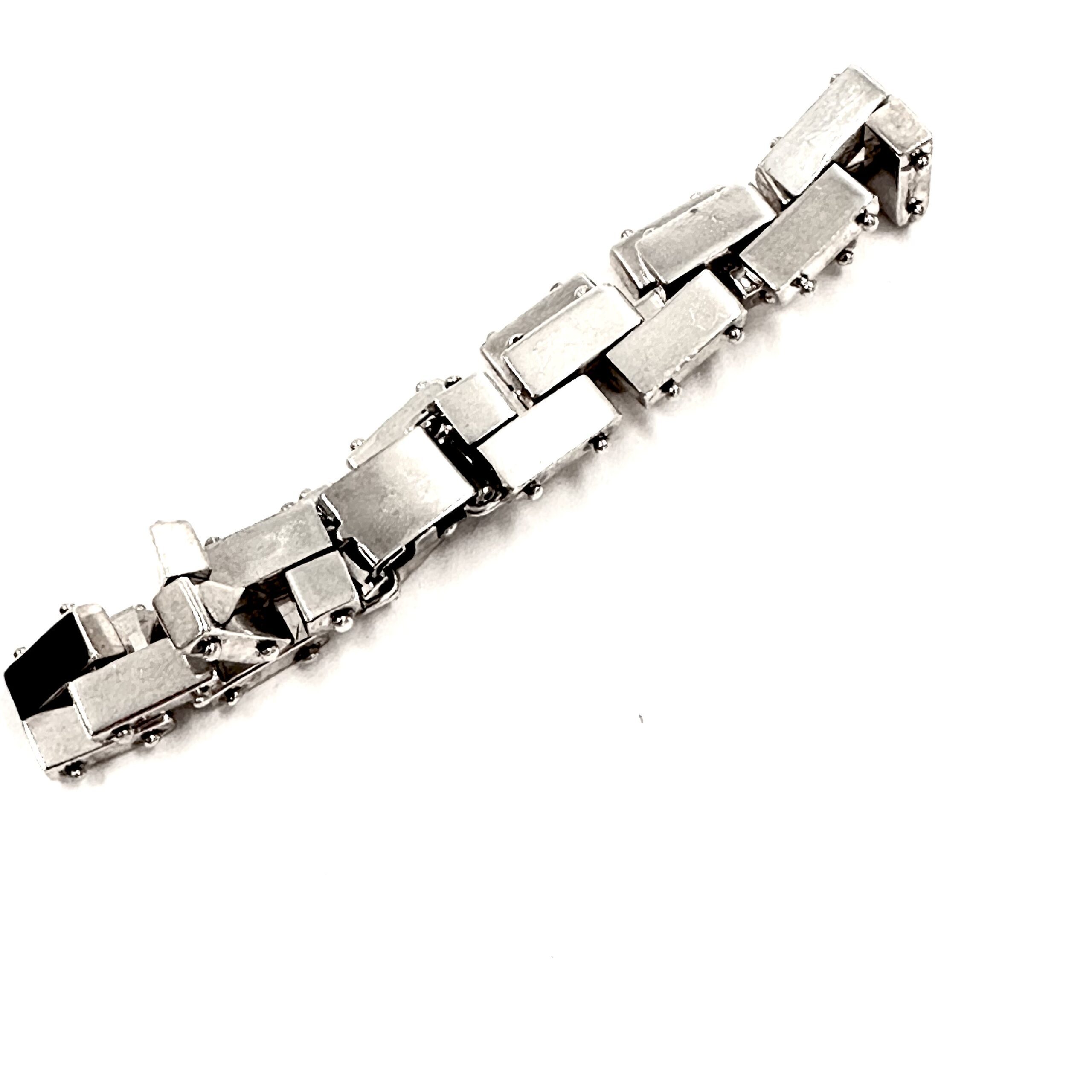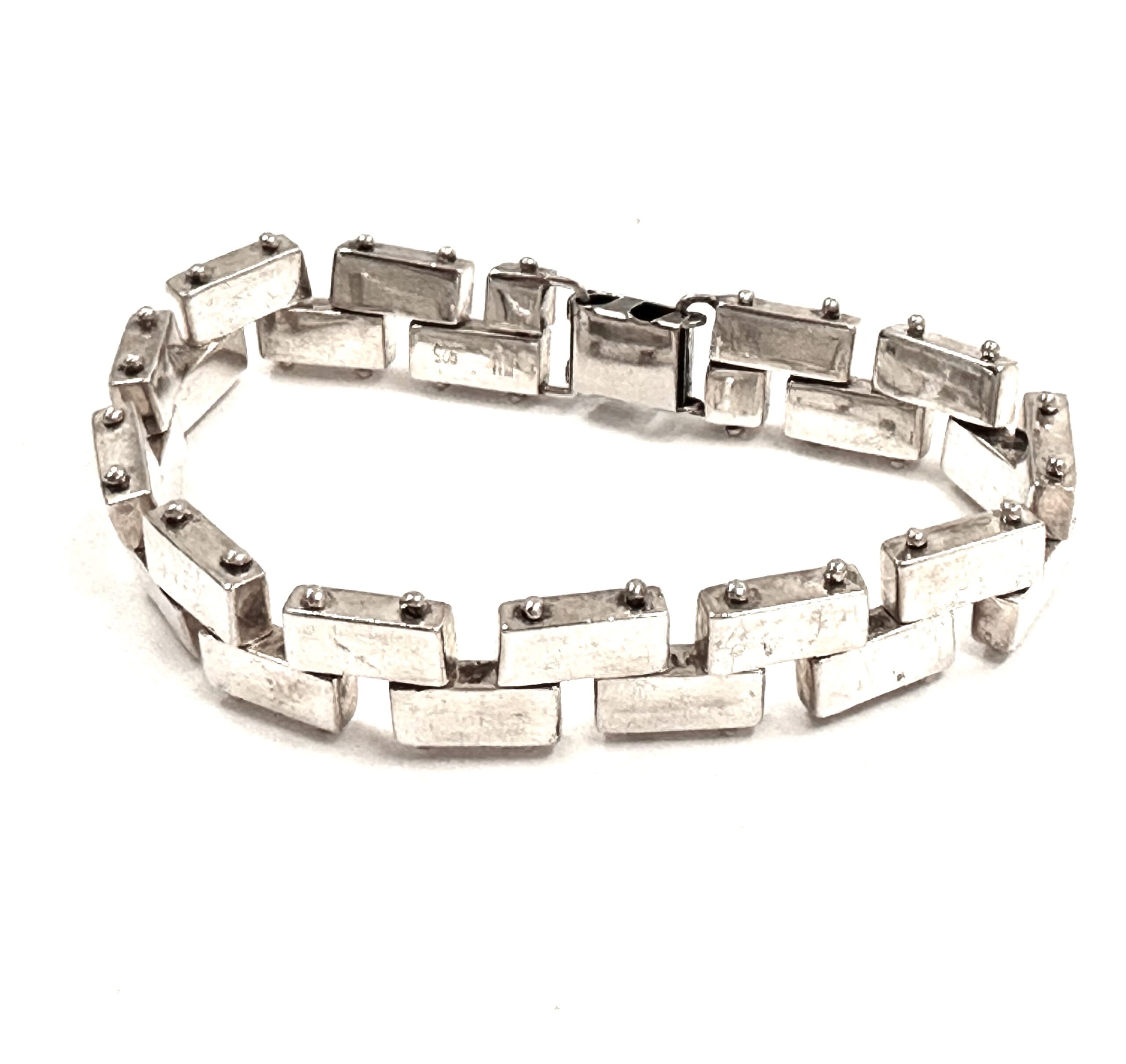The one of a kind Robert Lee Morris Silver 1×1 Mini Block Bracelet is locks heavy solid silver. The blocks or bricks, are pinned to one another with rivets and the bracelet moves beautifully. Nickel folder clasp. 2 ounces of silver.