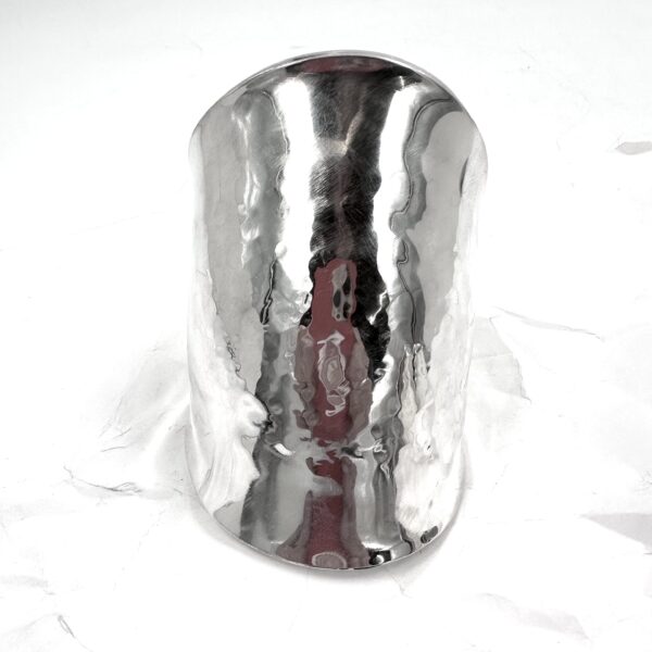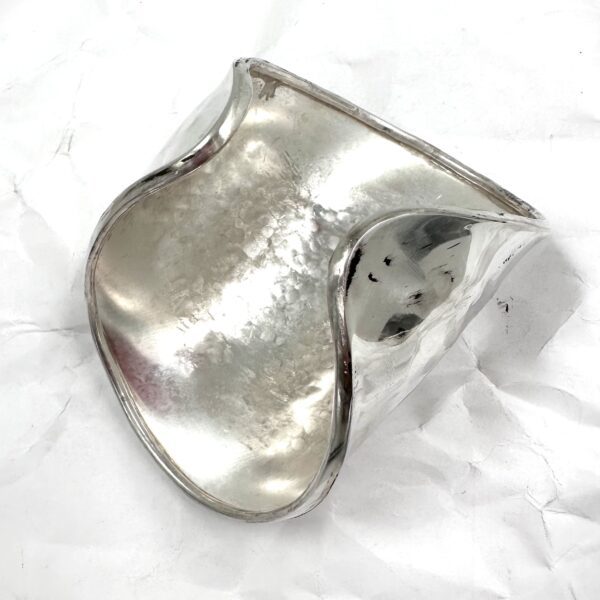 This Robert Lee Morris Silver Alpha Cuff #1 is handmade by Morris himself, and created in 2025. It is not a casting but a construction of sheet and wire, which is a classic iconic technique Morris has made his signature look. There are four similar cuffs all made during the same time periodic 2025 and this one is the second to smallest which is first on the left in the group shot in the thumbnails. The difference between the Alpha and Gamma cuffs is the length.