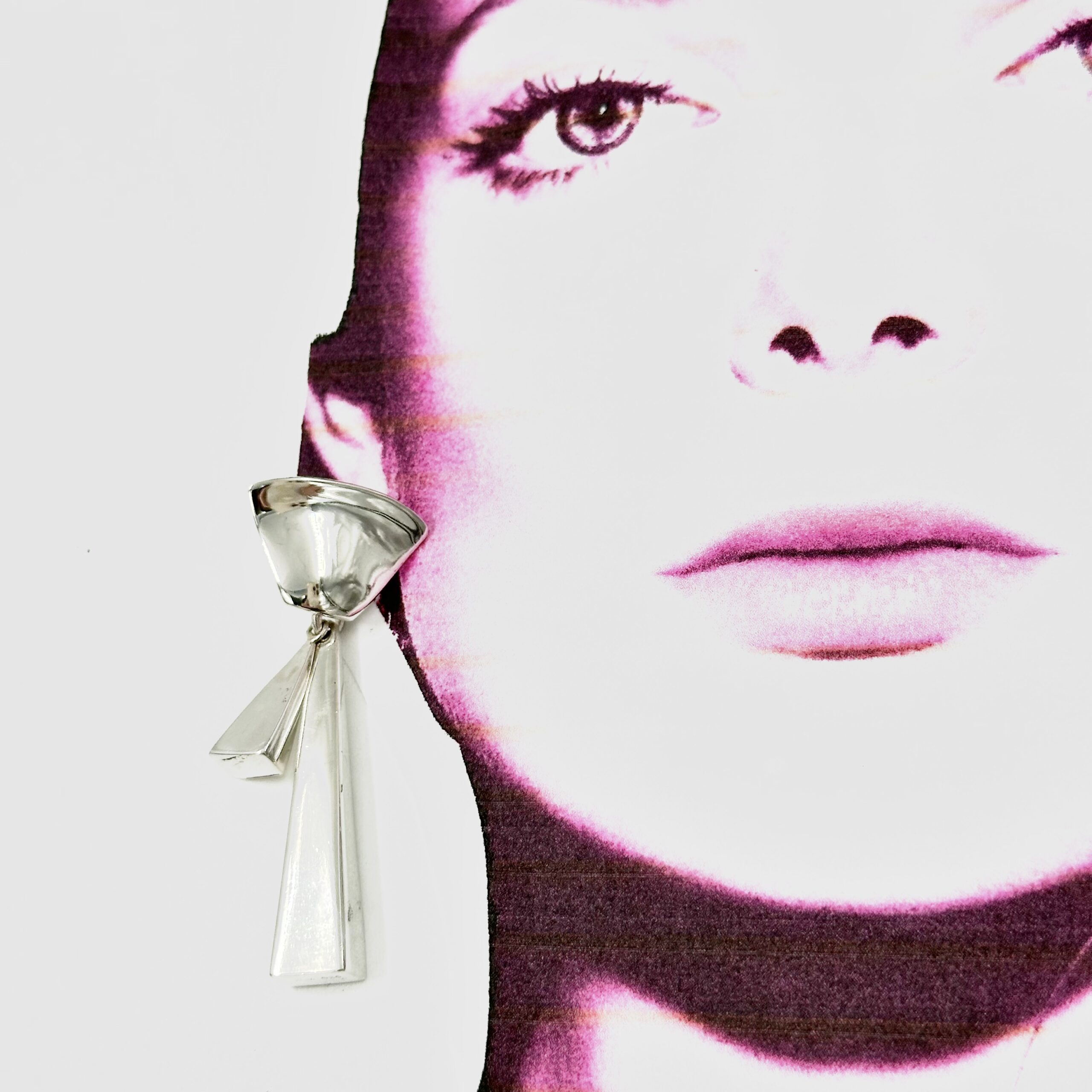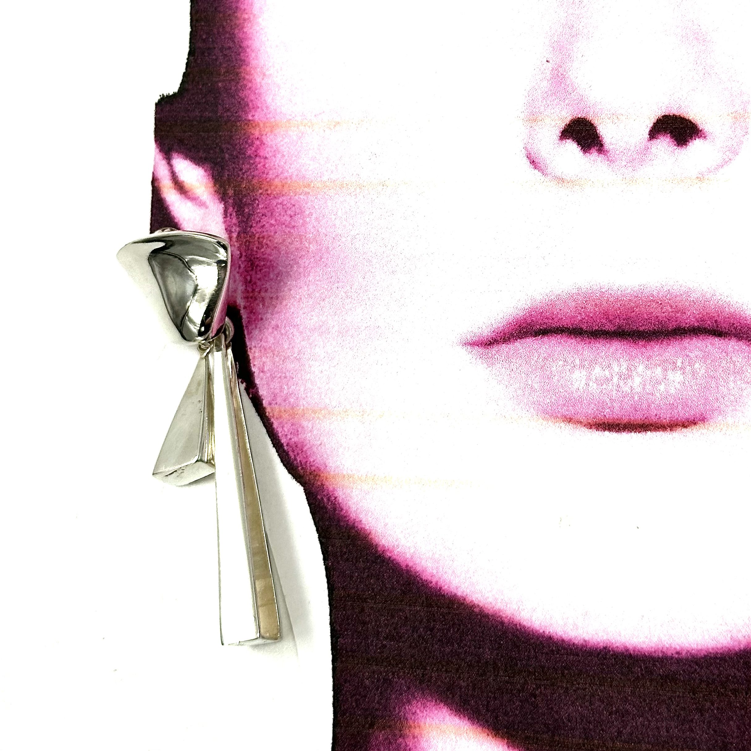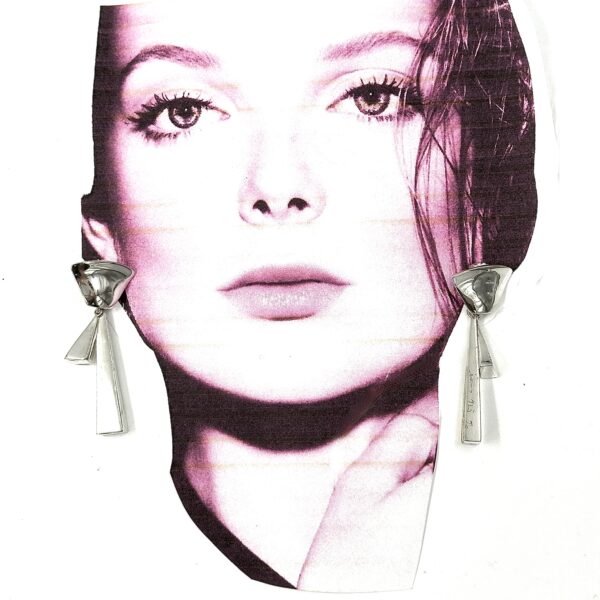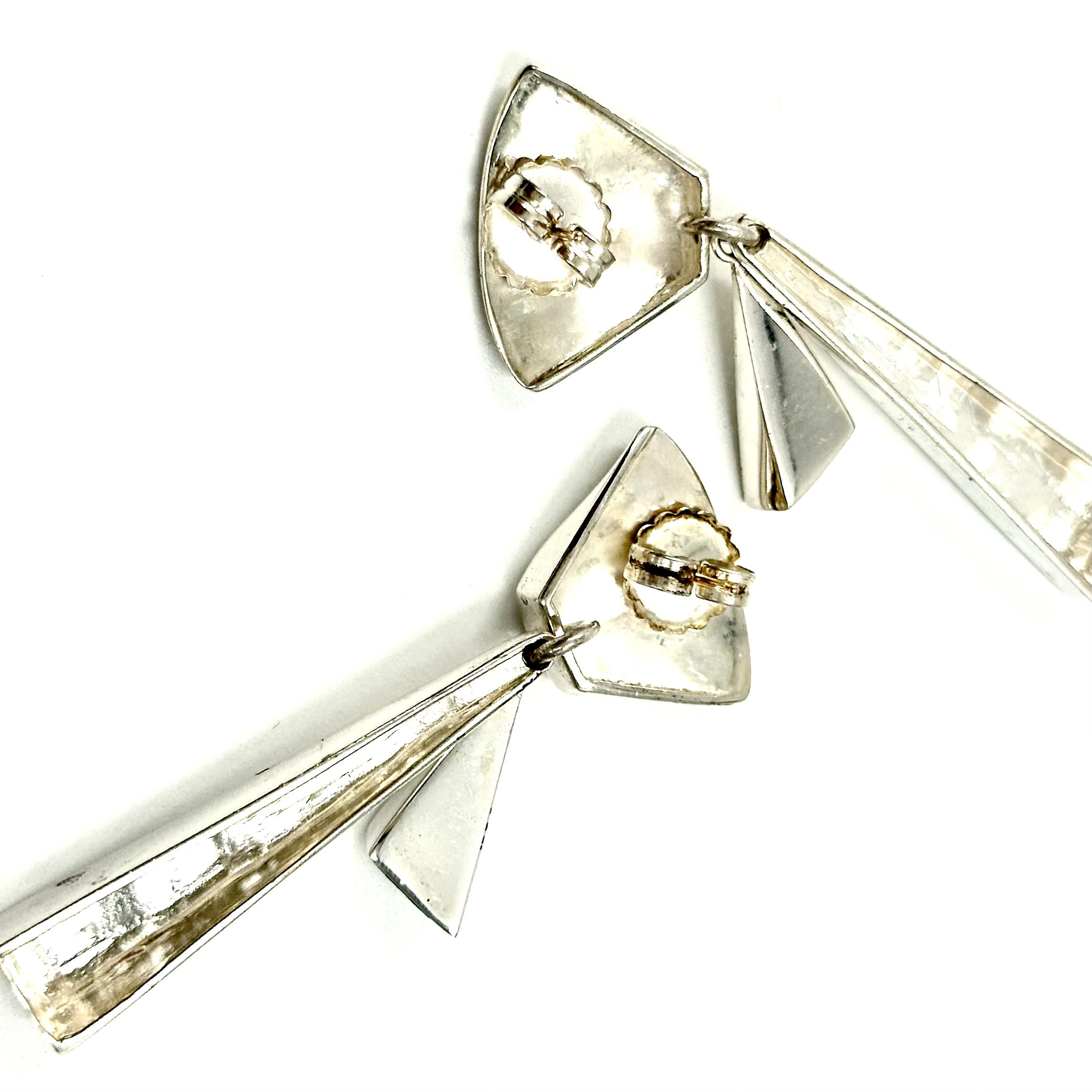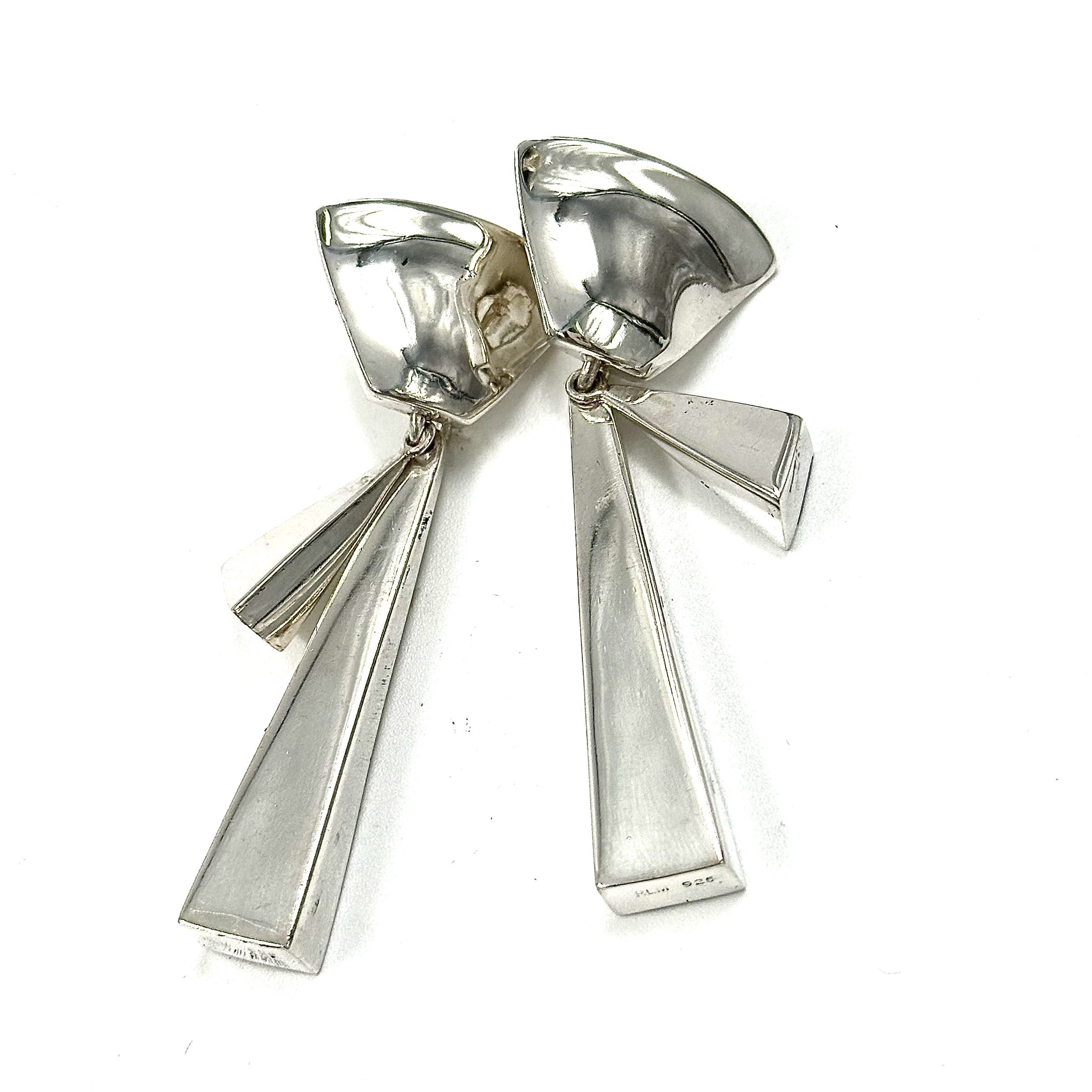 Thia pair of Robert Lee Morris Silver Architects Chandelier Earrings was from 2009-10 era. Morris was balancing his organic forms with his love of sleek futuristic architectural shapes. Here is a blend of the organic top and the angular sleek timbers that hang below.