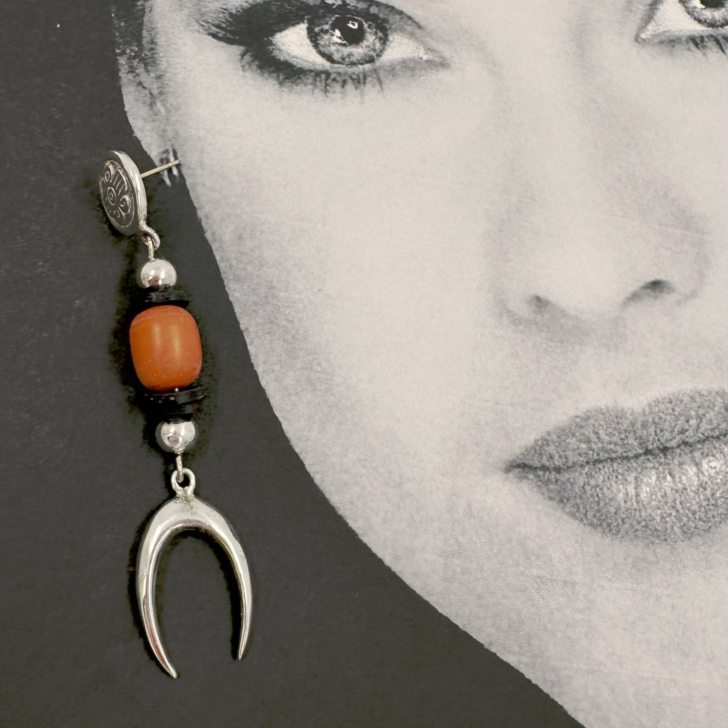 This one of a kind pair of Robert Lee Morris Silver Crescent Drop Earrings are tribal and fierce looking. The top of the earring has an engraving of an Aztec symbol, ย use of black coconut shell and an amber bead to create a rhythm. Pierced and dramatic.They are completely experimental prototypes.