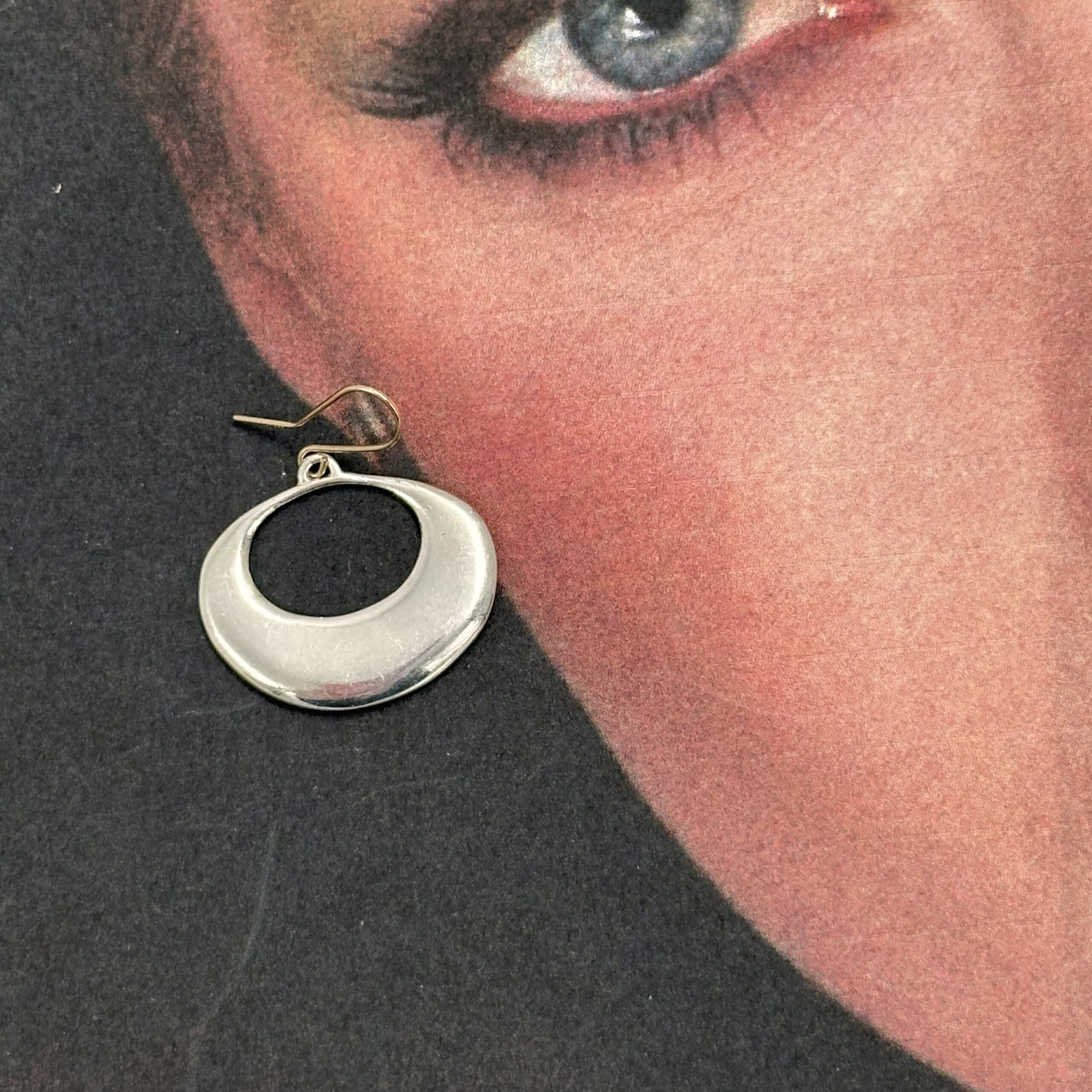 These Robert Lee Morris Silver Crescent Hoop Earrings are sculpted in shiny gleaming silver and hang from 14k wires. Very thin at the top and bolder at the bottom of the curve, these are dynamic everyday wear pieces.
