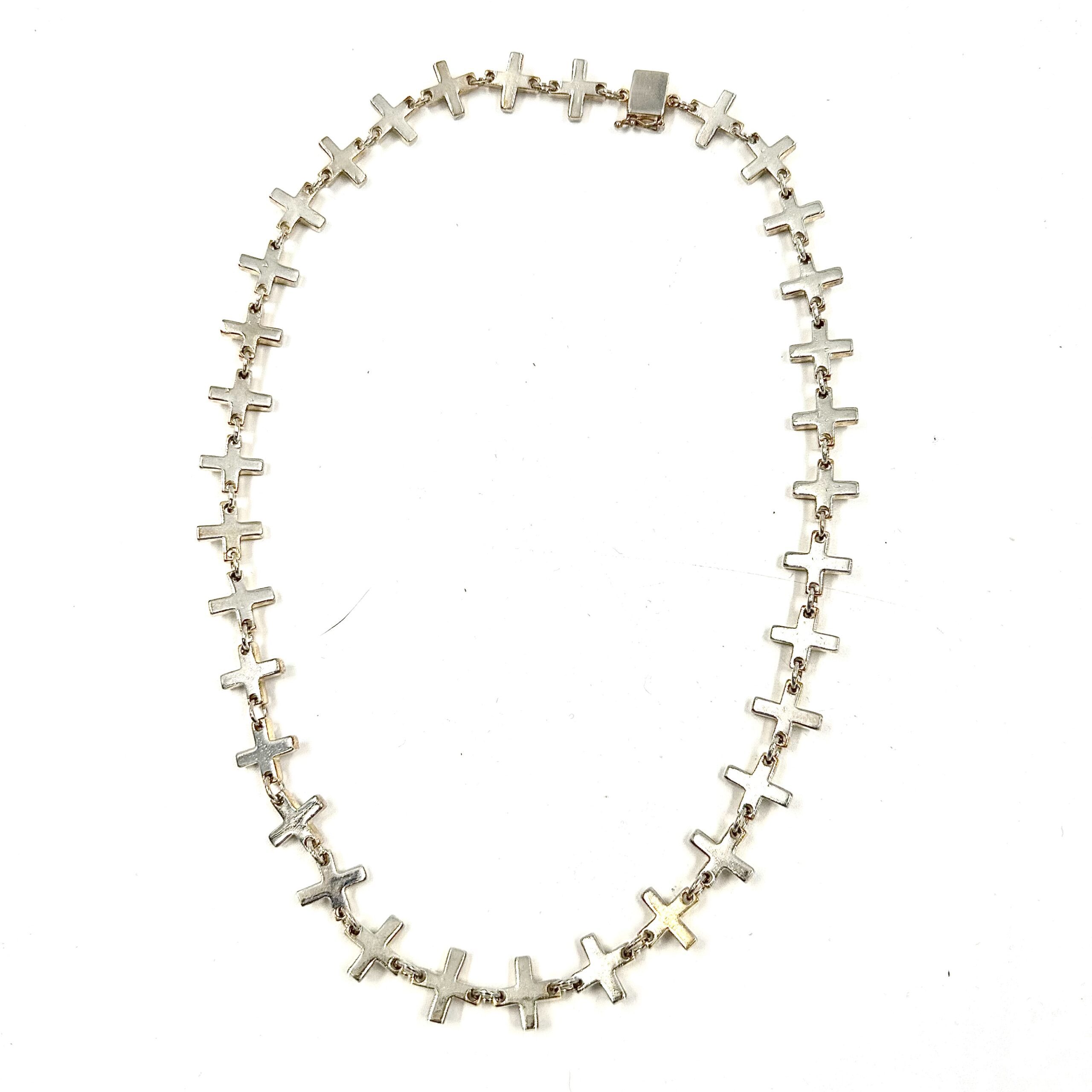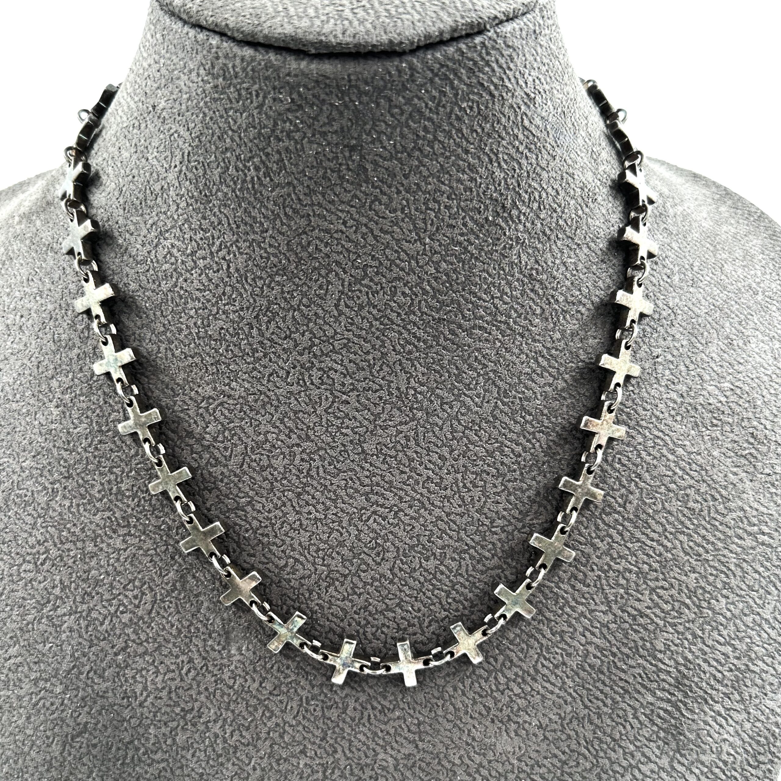 The Robert Lee Morris 20″ Silver Cross Necklace is one of the most popular and iconic pieces in Morris’ history. Solid sterling silver, this design was beloved both as a bracelet and as a necklace, and in many varying lengths. It was often purchased in longer lengths so people could wrap it around their wrists multiple time for a drop dead cool look. Long cross necklaces were worn by celebrities especially in the music industry. Classic and clean, this is the last silver cross necklace in stock. It is shown in the thumbnail shot with a longer gold plated one and a shorter brass one to show how the three colors look combined.