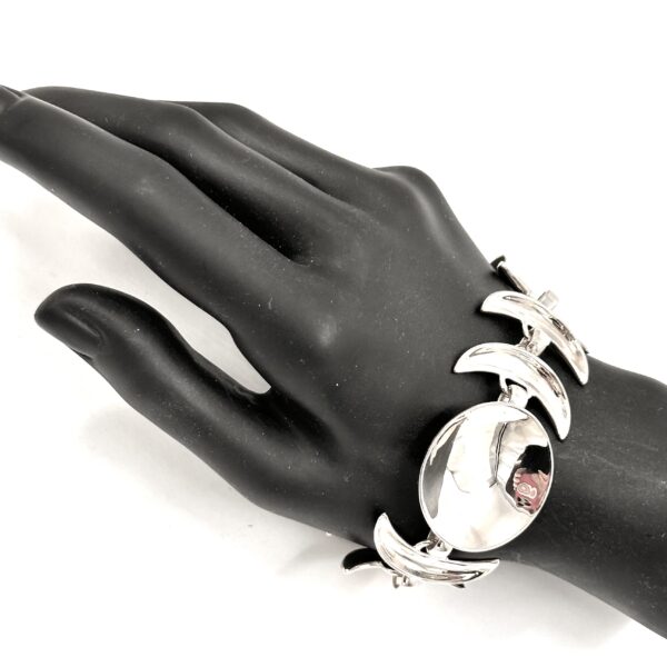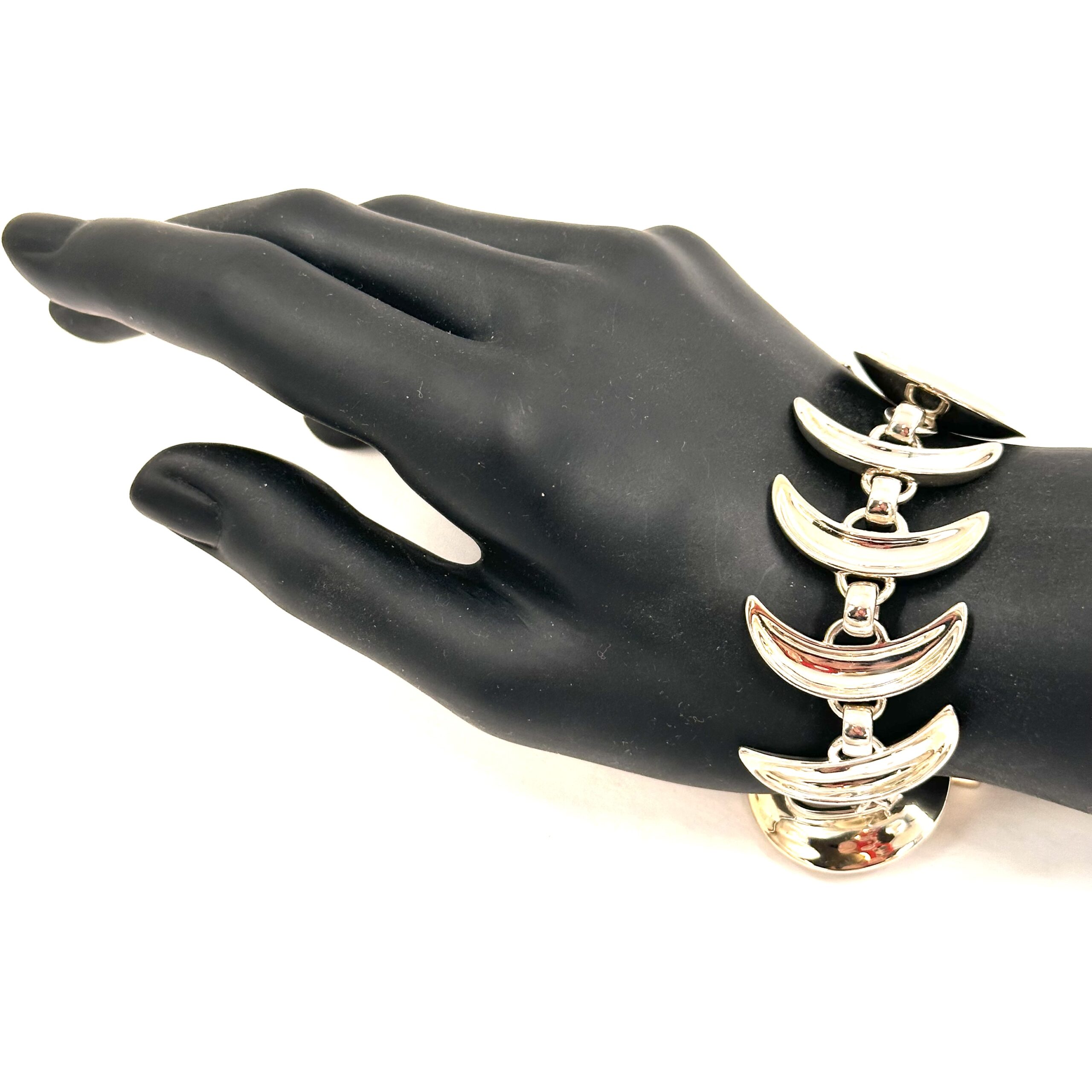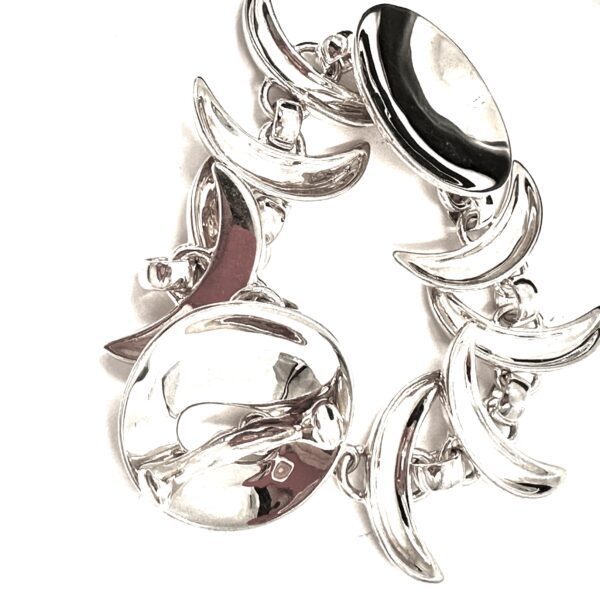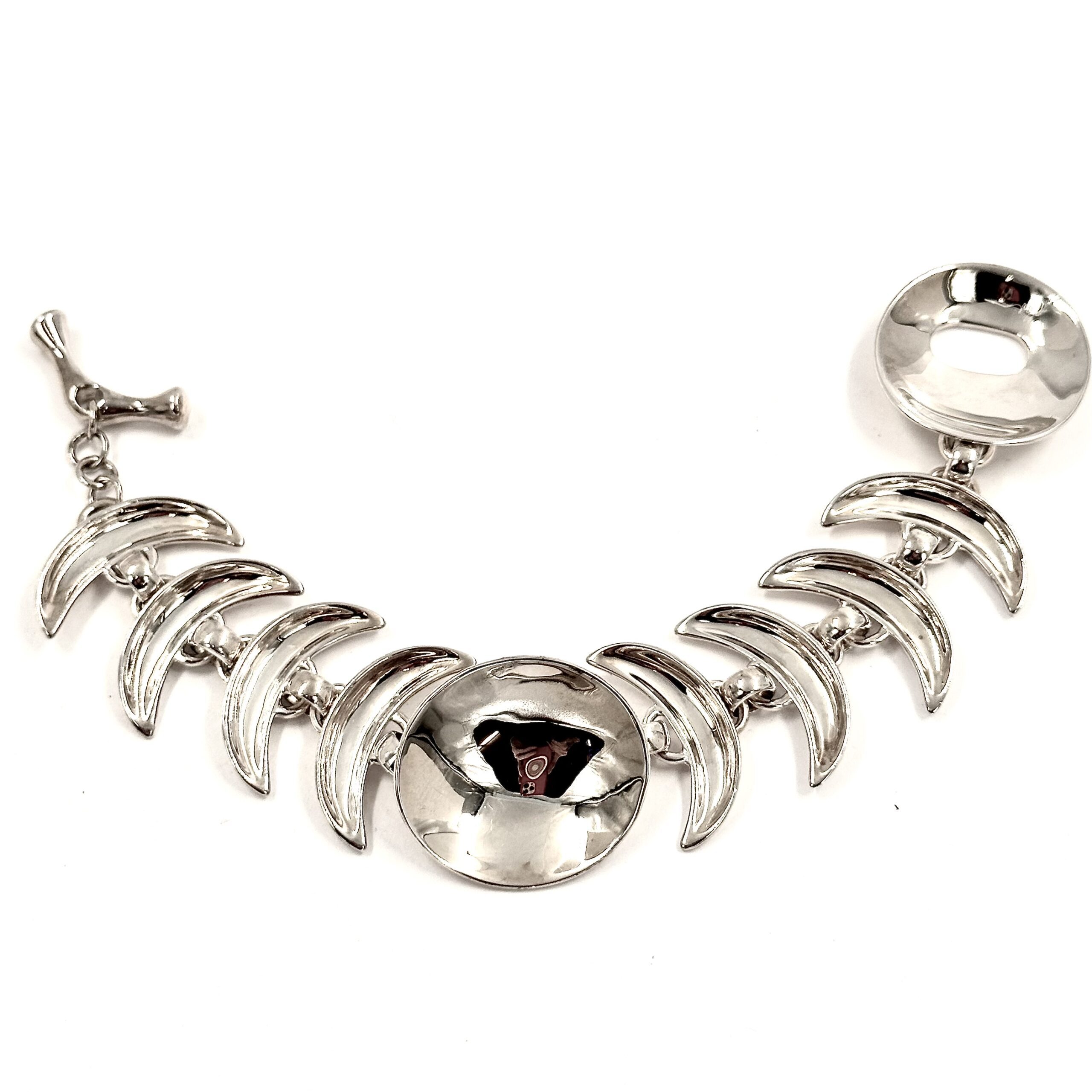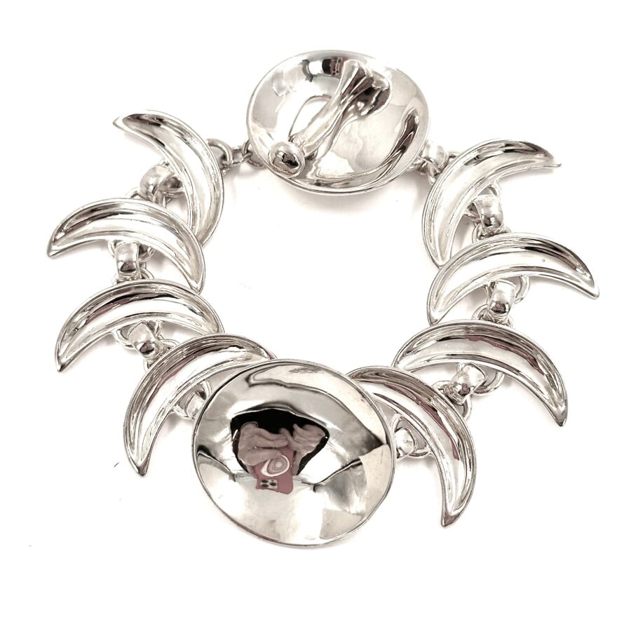 The ย very shiny Robert Lee Morris Silver Echo Link Bracelet is about concentric circles when a stone is dropped into still water. The concave shape faces towards and catches the light making this a very sparkly bracelet. Very strong sculptural components make this piece very femine but strong.