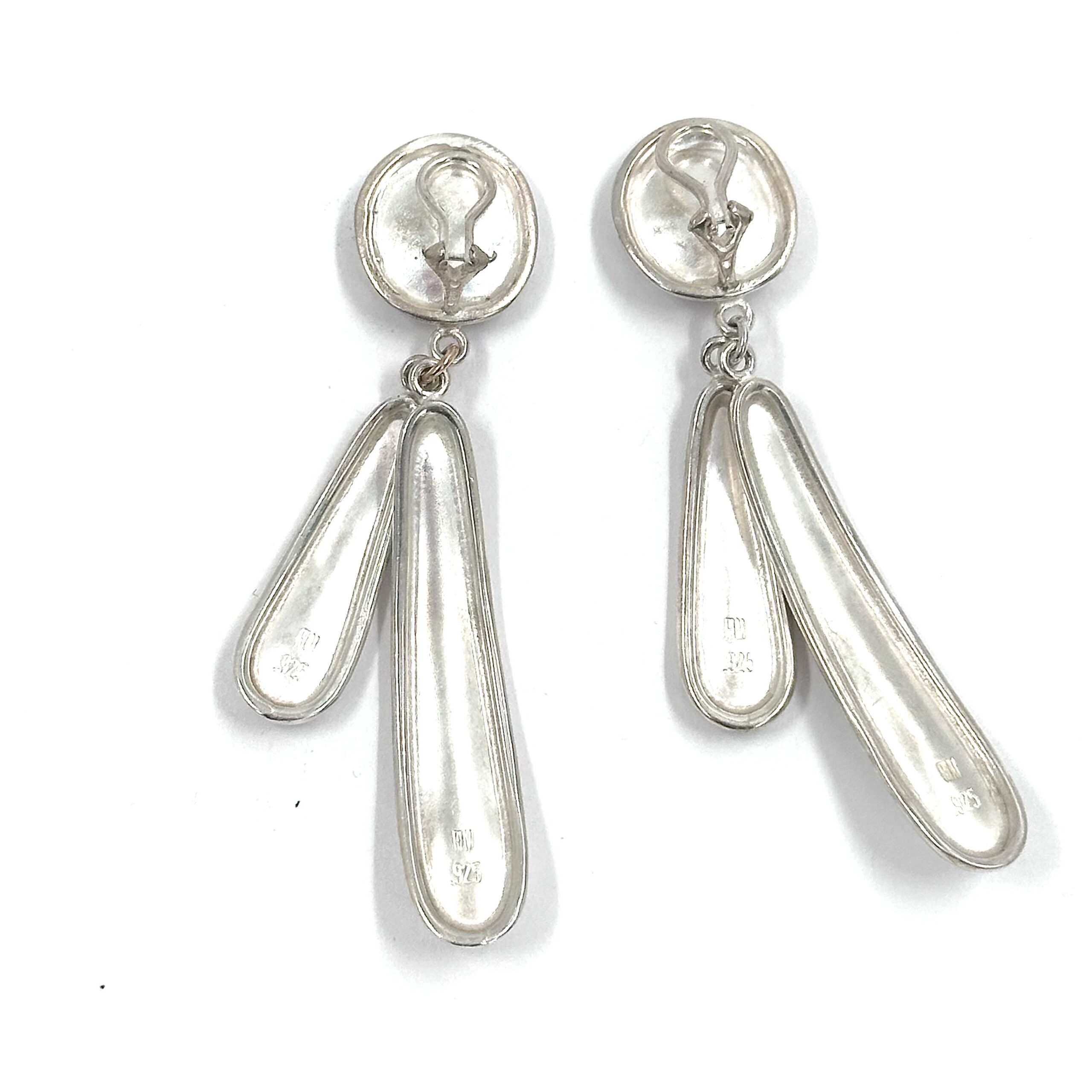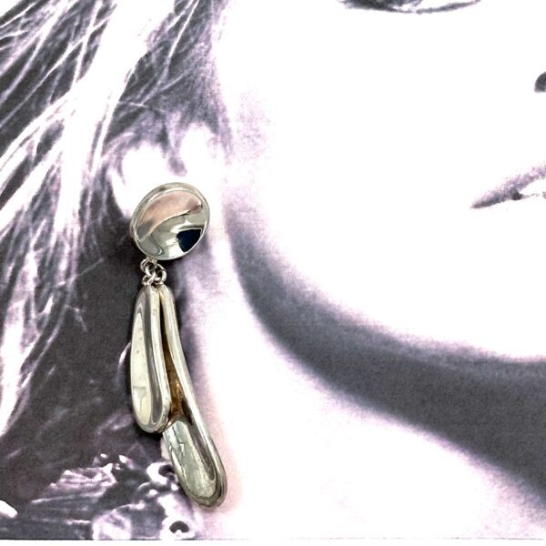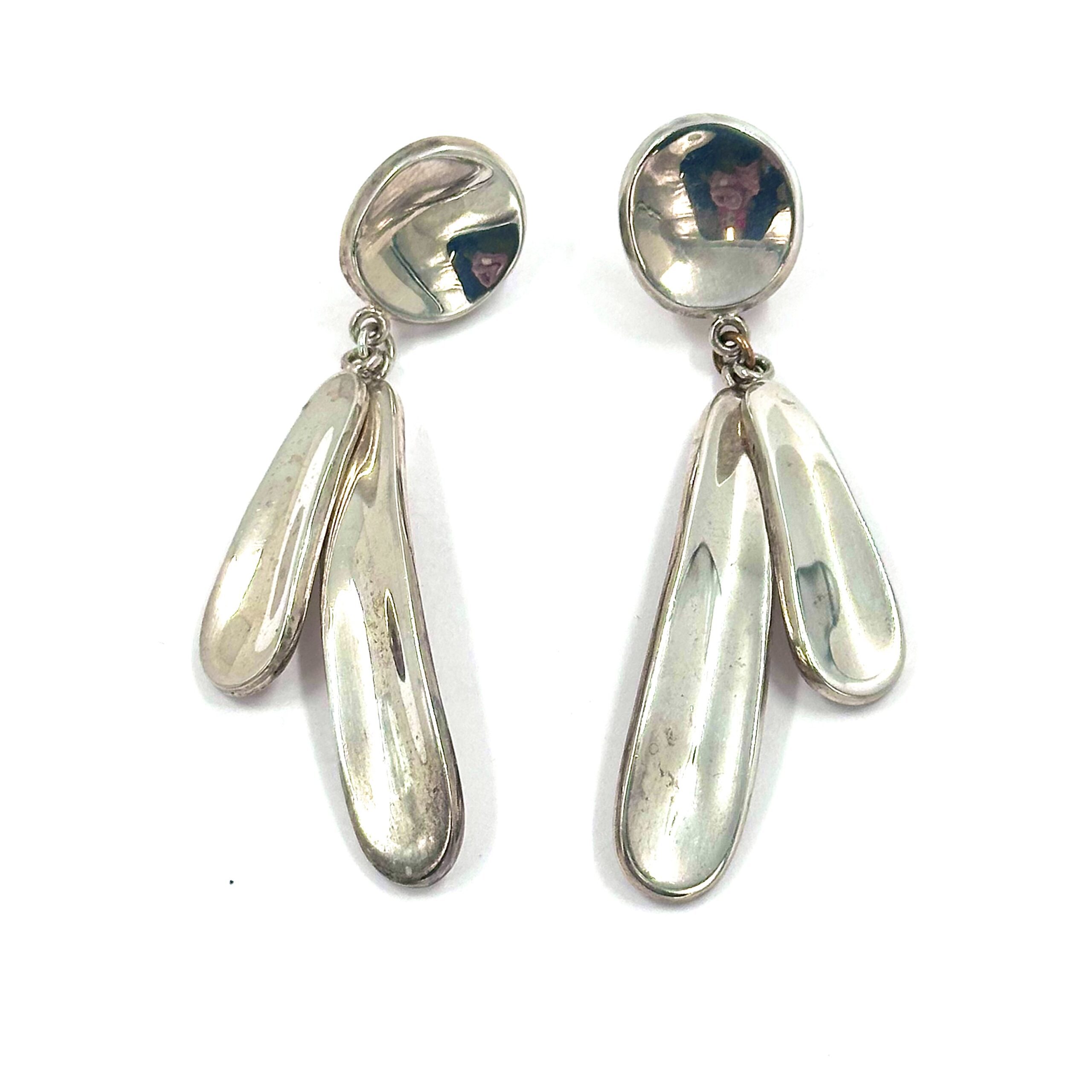 The Robert Lee Morris Silver Falling Leaves Chandelier Earrings are a sexy cluster of long ovalized concave shapes. Gleaming silver with thick edges and smooth surfaces make this a very modern design. French clips.