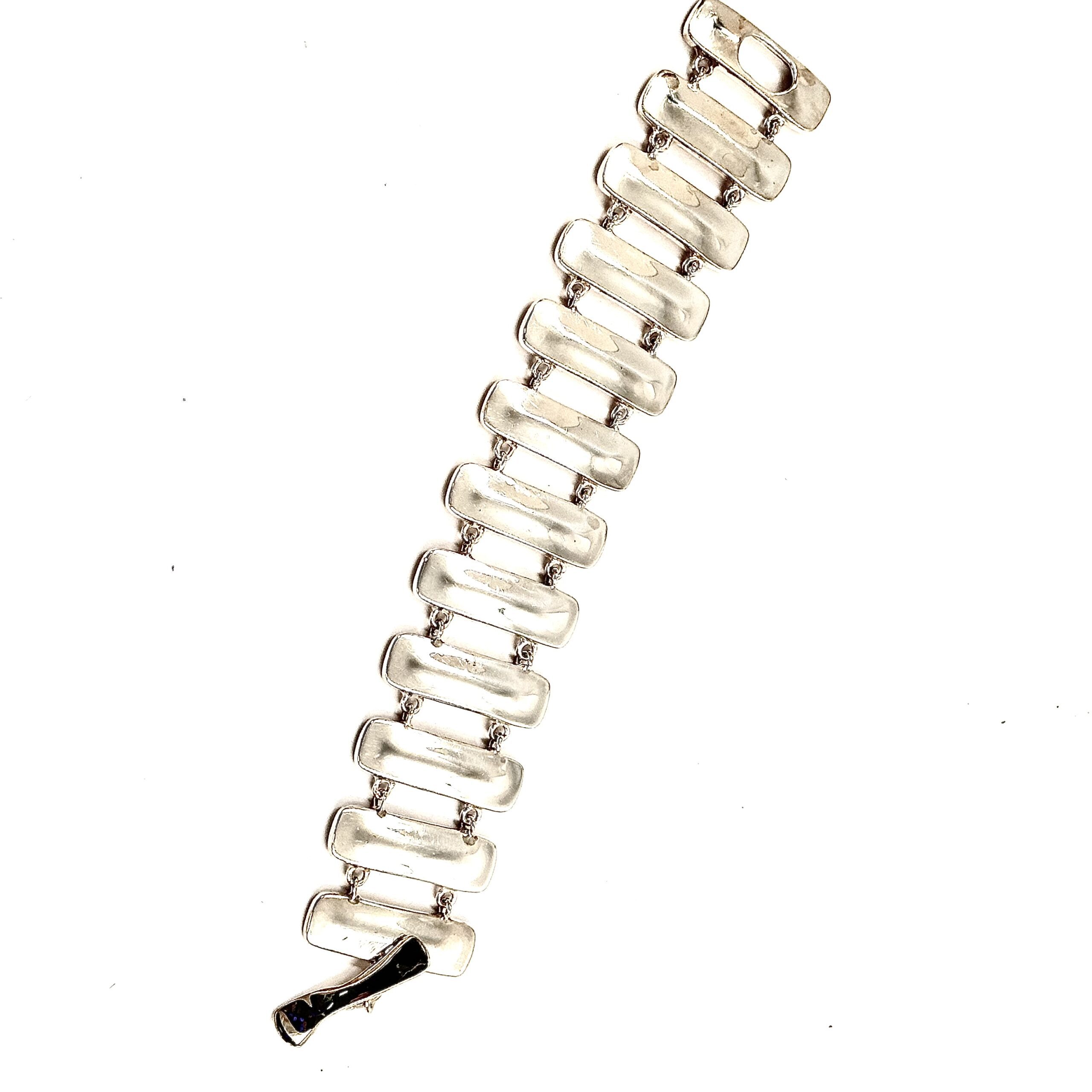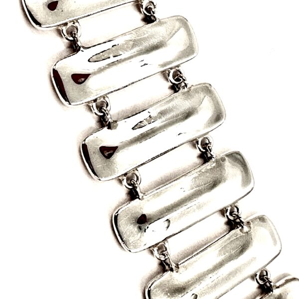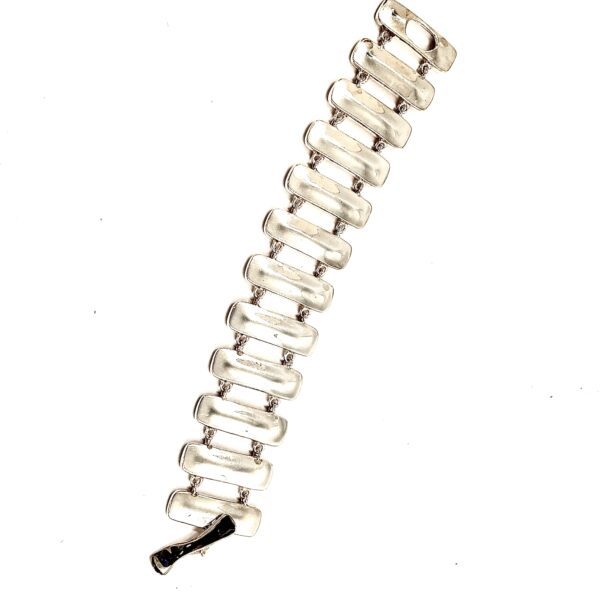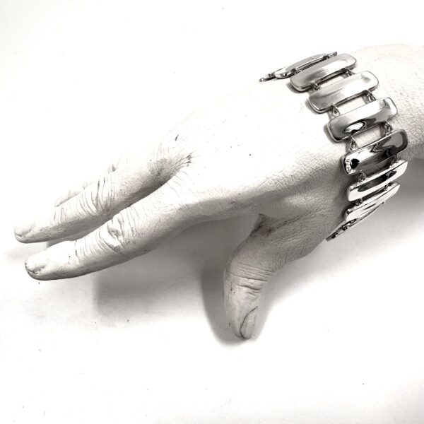 This gleaming Robert Lee Morris Silver Fence Link Bracelet is handsome and sleek. The toggle clasp is discrete and clever fitting into the last bar. The link is iconic RLM with a raised convex surface and thick edges revealing the original sheet and wire construction.