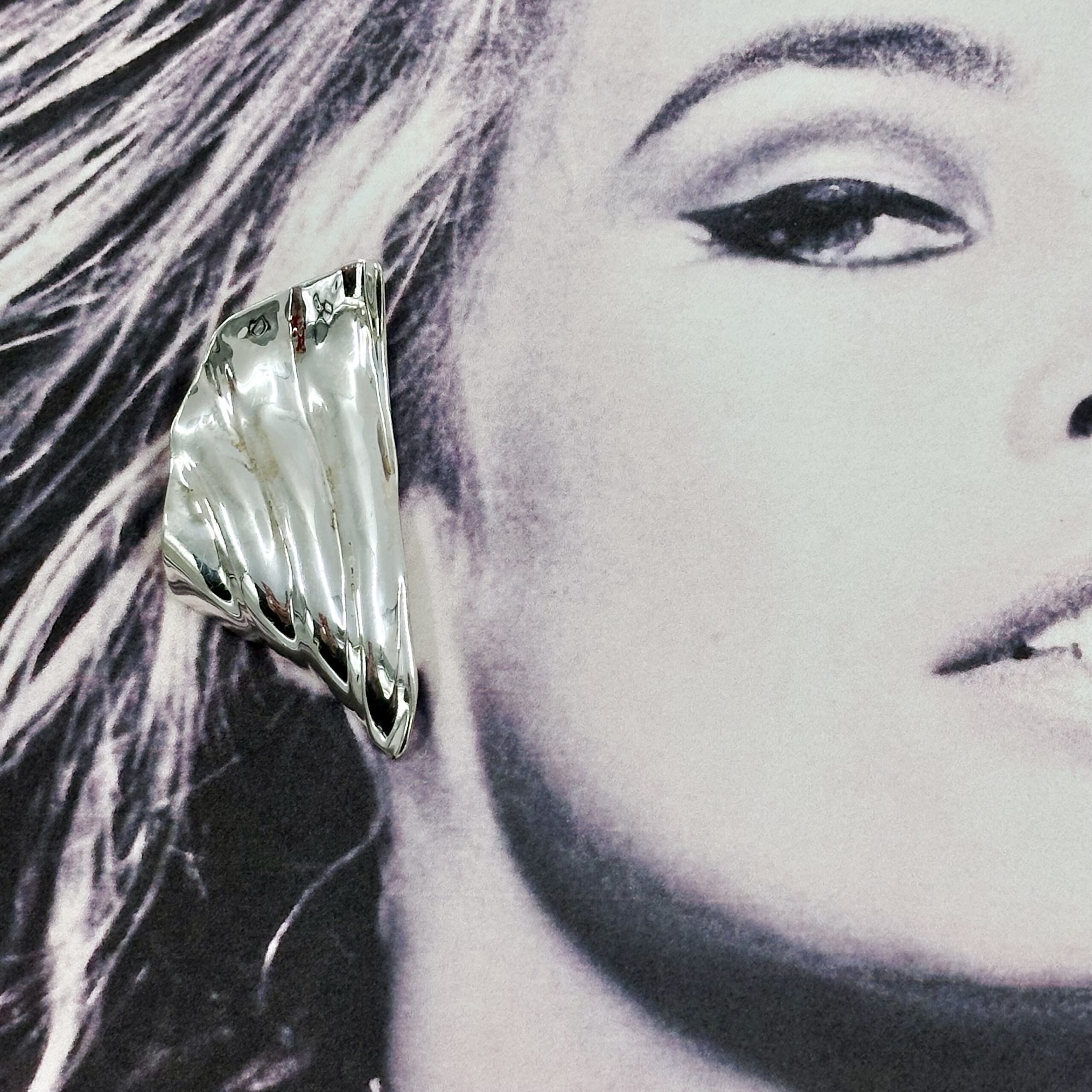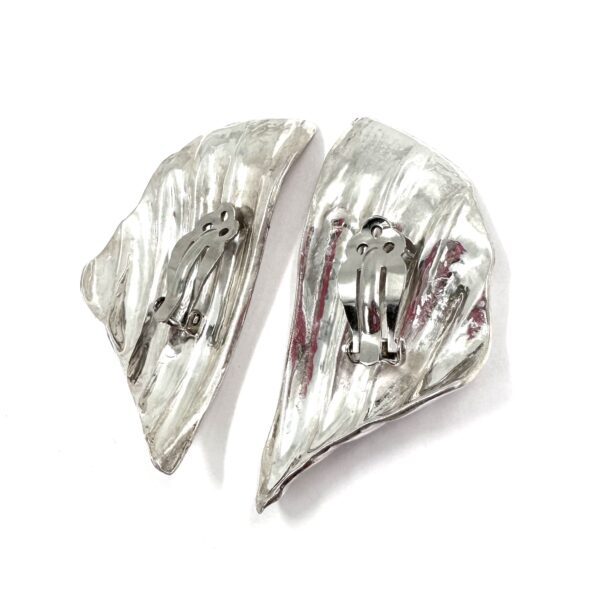 The Robert Lee Morris Silver Fin Earrings were created in 1982 for use in a KANSAI Yamamoto runway show in Paris Tokyo and New York. This fish like form was one of the many icons made to accessorize the Japanese masters visions. Formed by molding soft wax over seashells. Clips