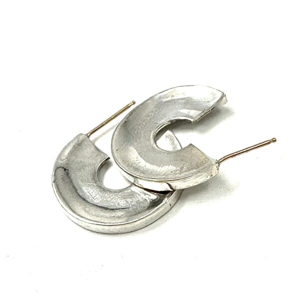 These Robert Lee Morris Silver Flat Hoop Earrings are small, sleek and modern. The 14k posts and the wide flat edge make these very clean design. ย Less than an inch across.