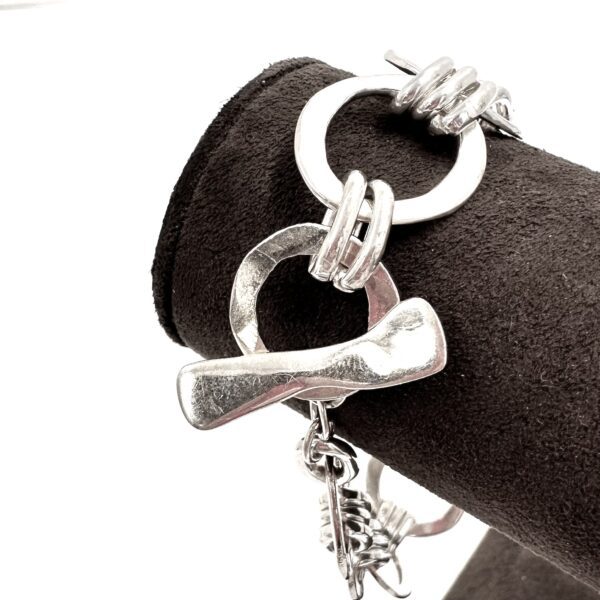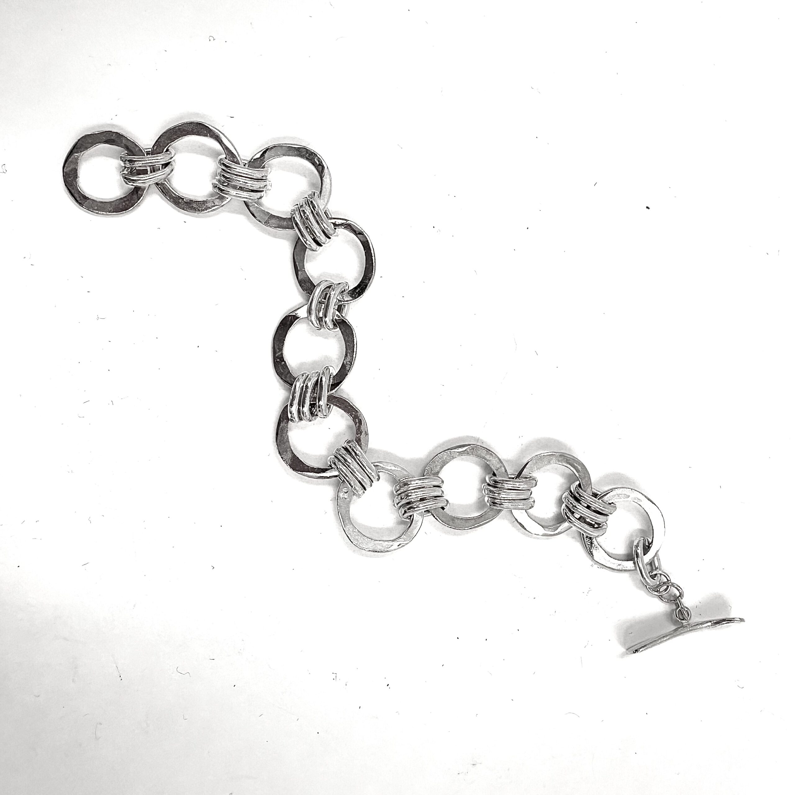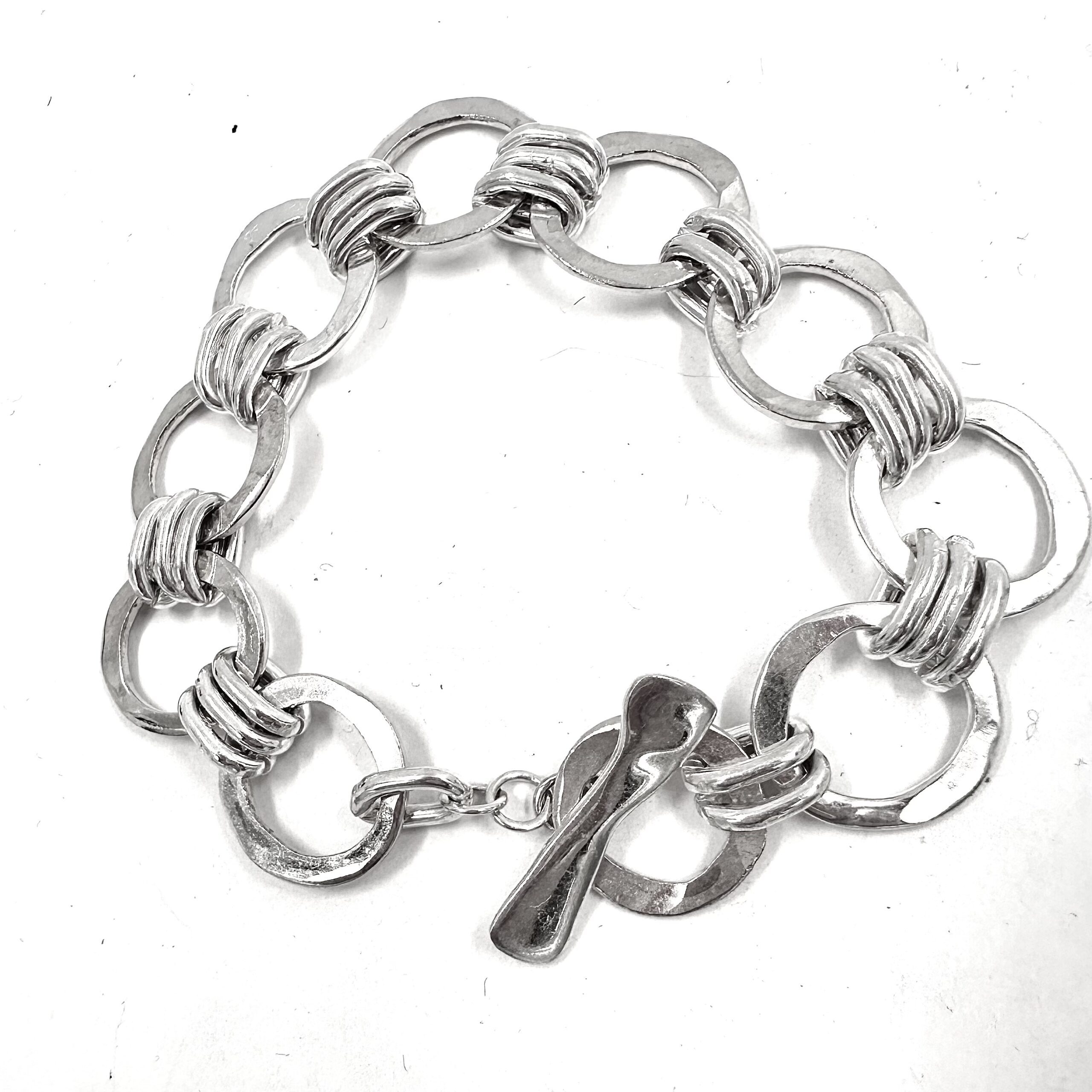 This Robert Lee Morris Silver Forged Circle Link Bracelet is made of individual sterling silver rings that were forged flat and reveal all the hammer marks. Joined together by three ovalized rings, and closed with a forged toggle bar this bracelet is unisex, and classic.