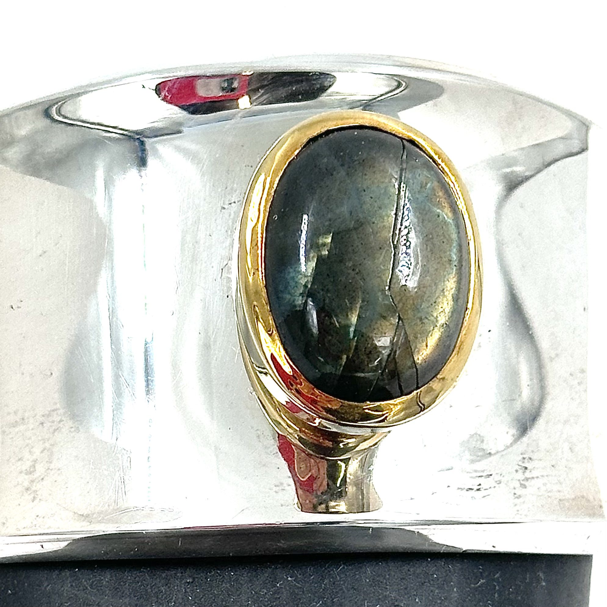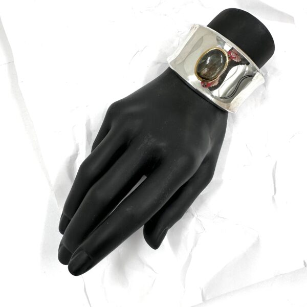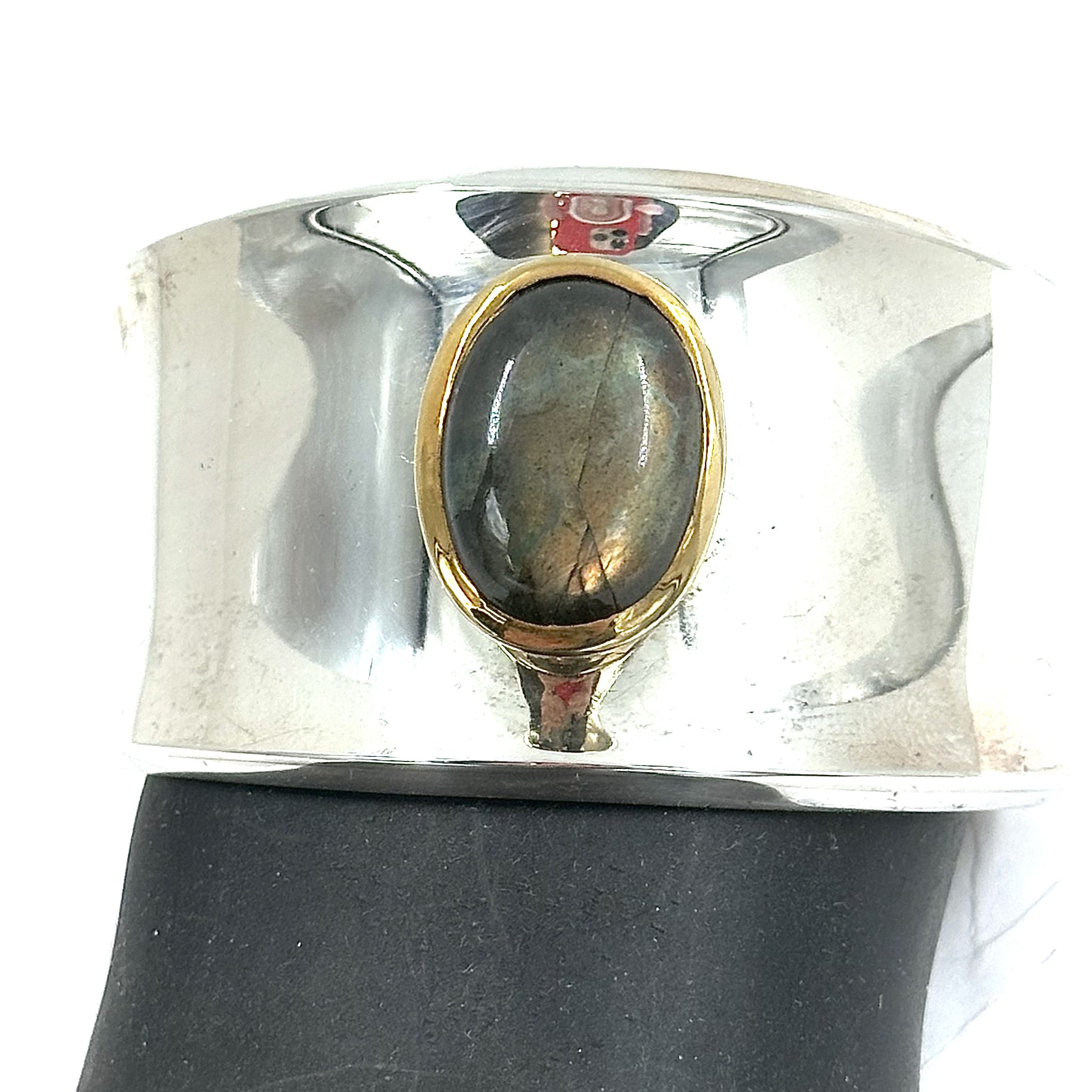 This one of a kind Robert Lee Morris Silver Labradorite Cuff features a large oval stone set in a chunky 18k gold bezel that hovers over a simple concave silver form. The dark grey blue stone has ย very bright chatoyancy. Morris rarely set stones in any of his jewelry so this one is quite rare.