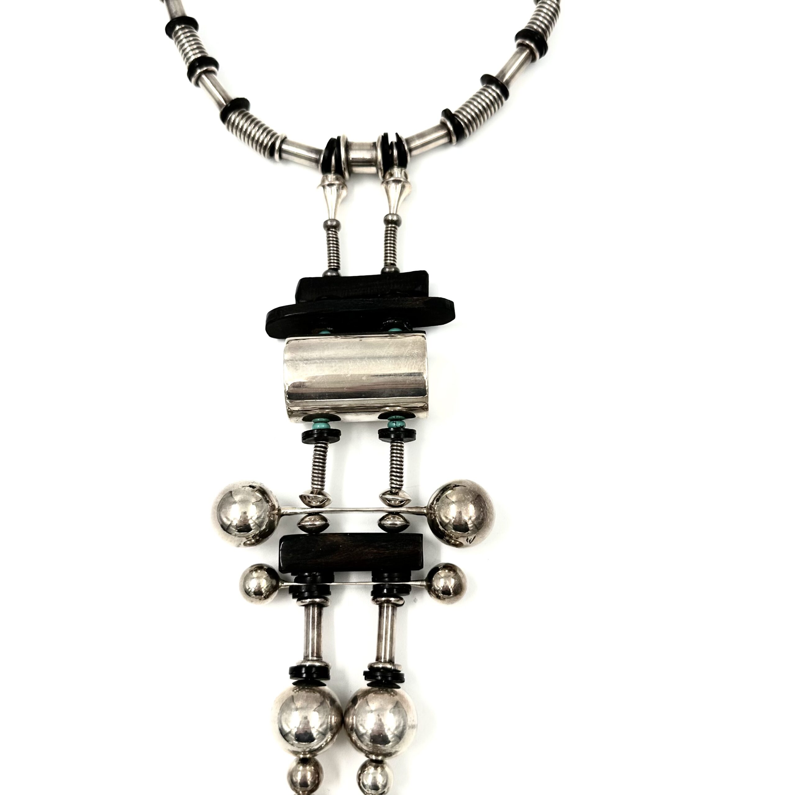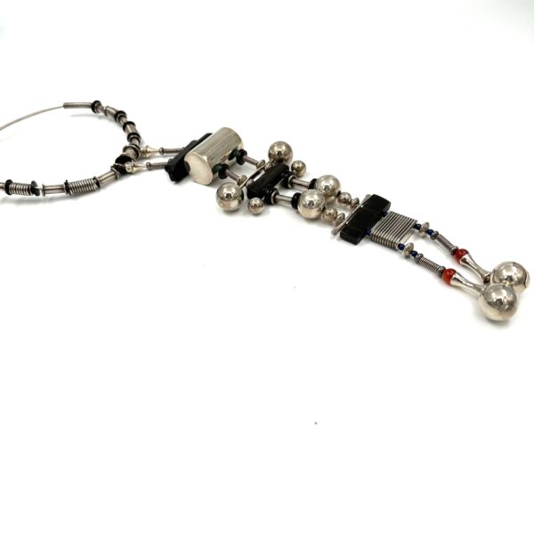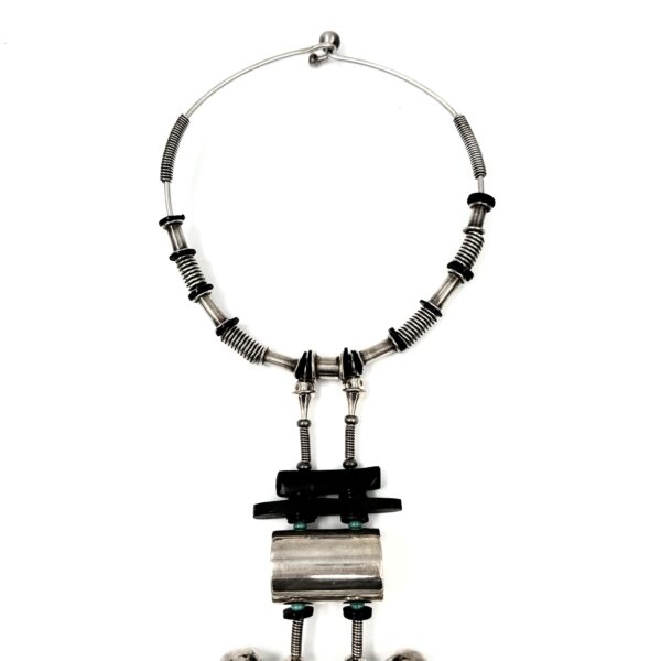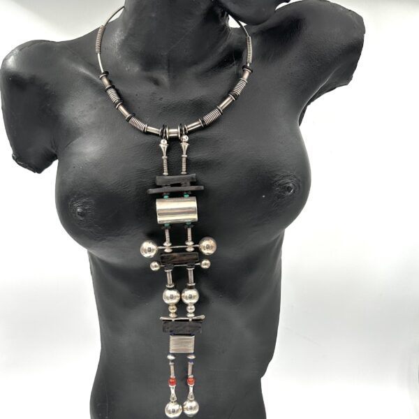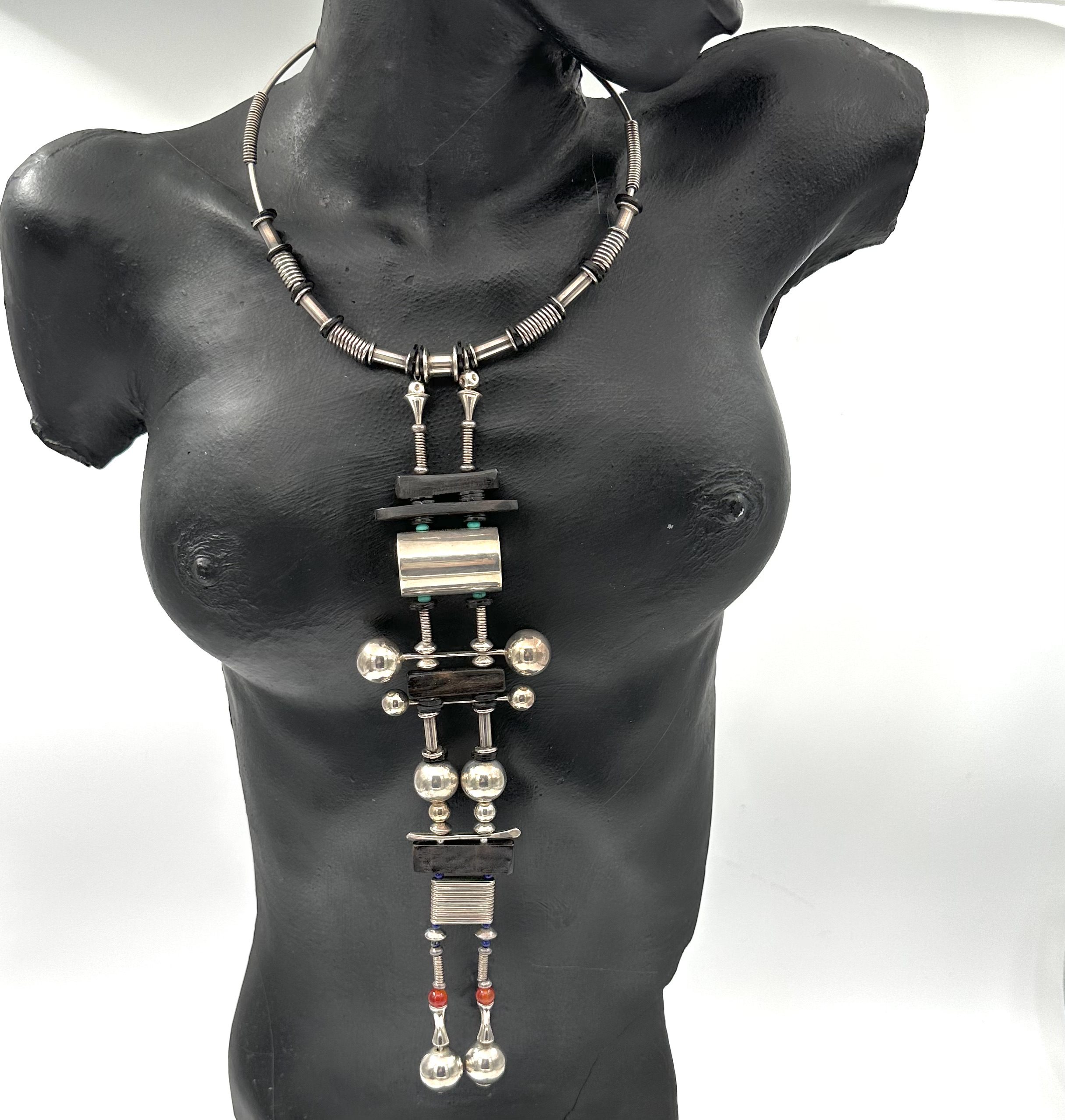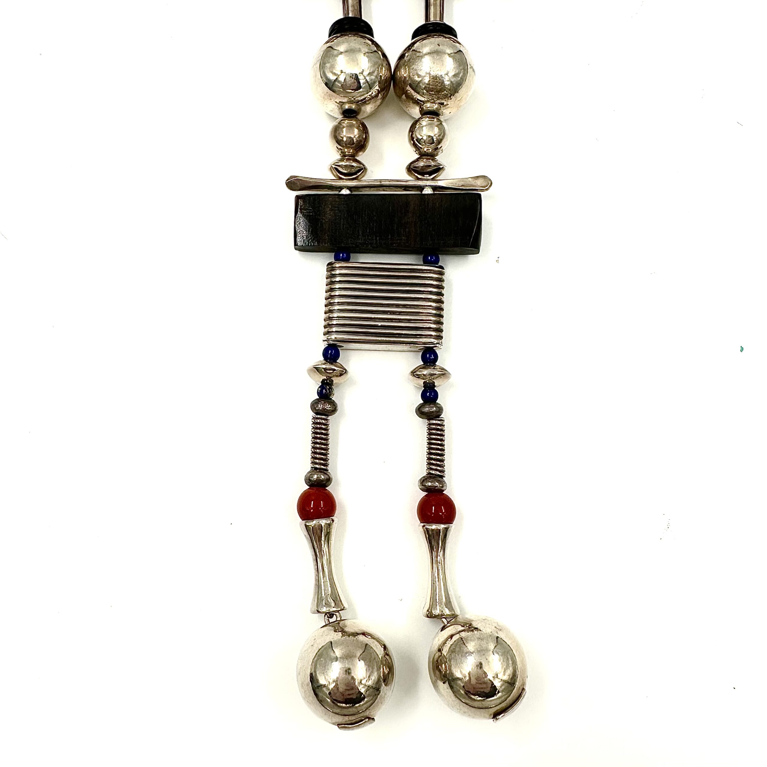 This Robert Lee Morris Silver Double Line Pectoral Necklace is a re-interpretation of a 1973 necklace that was shown in Morris’ one-man show at Sculpture to Wear in the Plaza Hotel. Donna Karan wanted to use many of Morris’ vintage silver necklaces from the mid to late 1970’s in her 2005 fall runway show, and rather let her use the original version, (which was delicate and breakable) he made this new version. It is part of Morris’ fascination with the “percussion” theme, using silver, ebony and brass in a rhythmic pattern, A little like music, jazz, or African drumming, he made several pieces that juxtaposed ebony and silver. Also very inspired by the sculptures of Louise Nevelson, Morris showed his love of tribal moods in his early work. This necklace is a silver wire that is embellished with many styles of wrapped wire and tubing, and is the frame to hold the two long vertical strands of constructed sections as seen in the photo. The endings are two silver balls that hang and move with the body. Slight touches of color, turquoise, carnelian, and lapis are a nod to classic Egyptian jewelry colors.