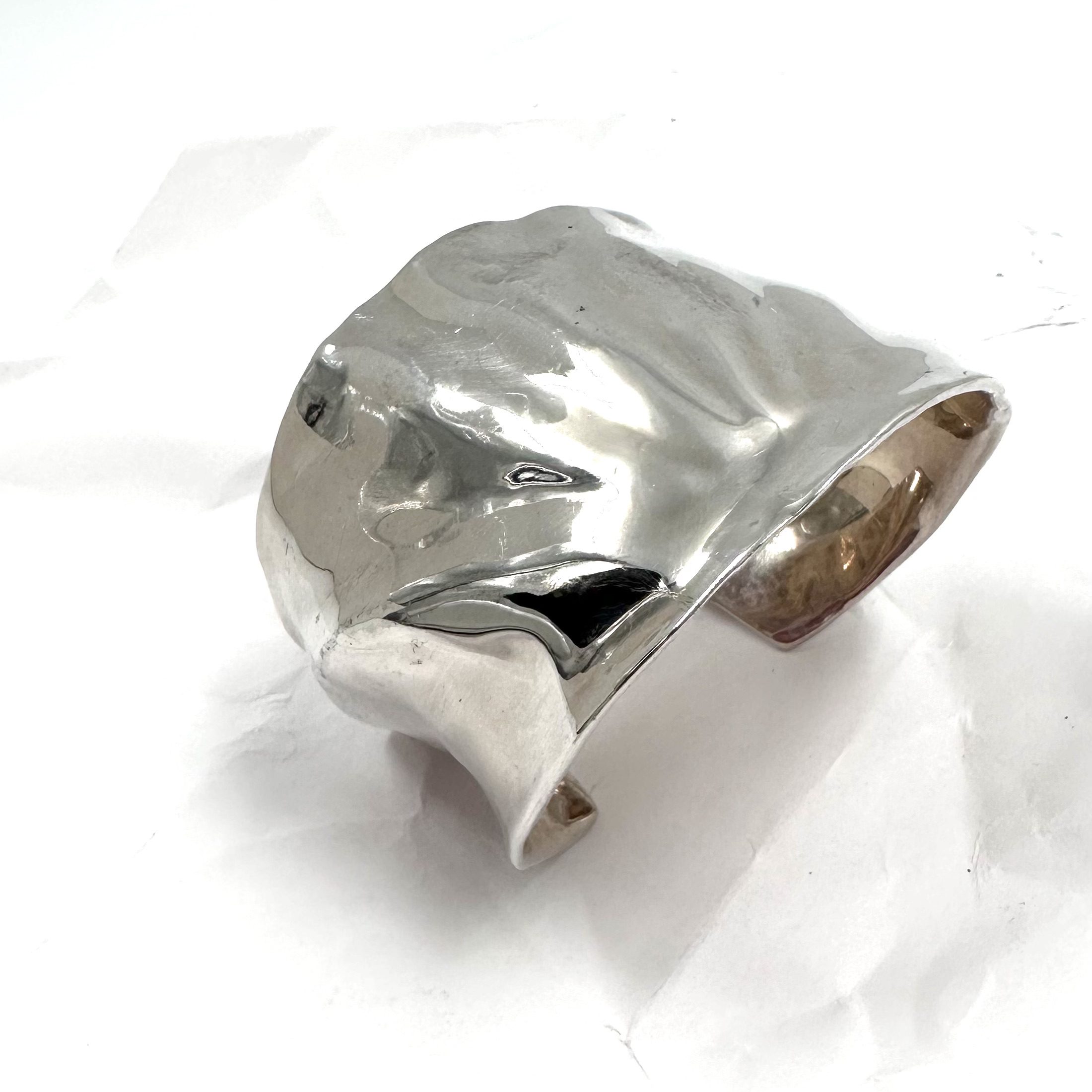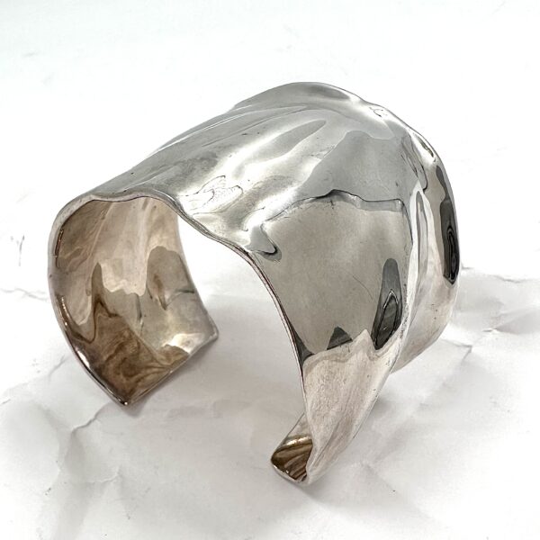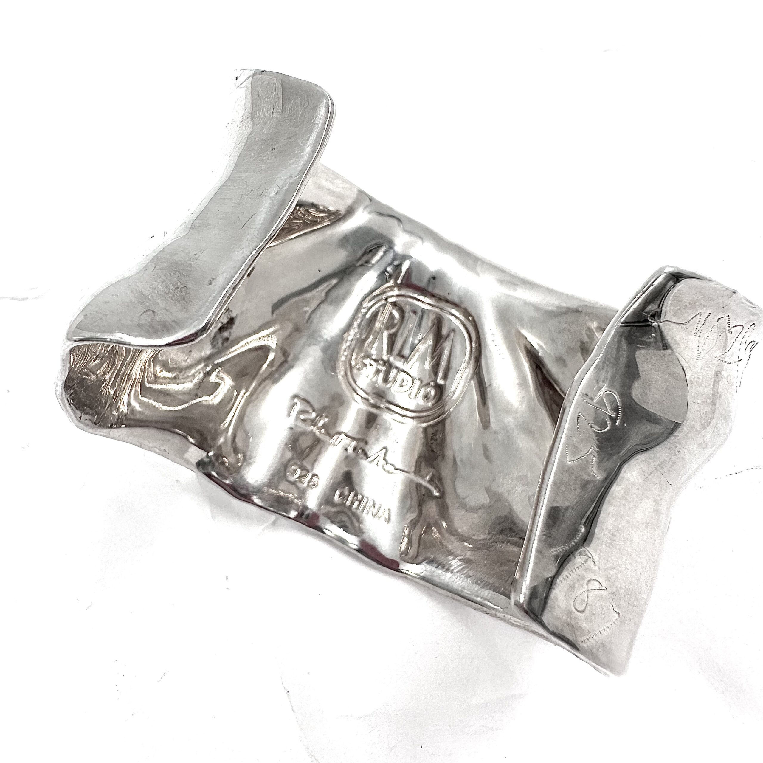 This Robert Lee Morris Silver Shell Cuff is from the Studio collection for QVC 1round 2004. It was created by pressing soft wax sheet onto a genuine seashell to get this form. Inside the very noticeable logo for RLM Studio 925 made in China is prominent.