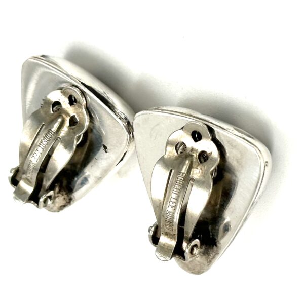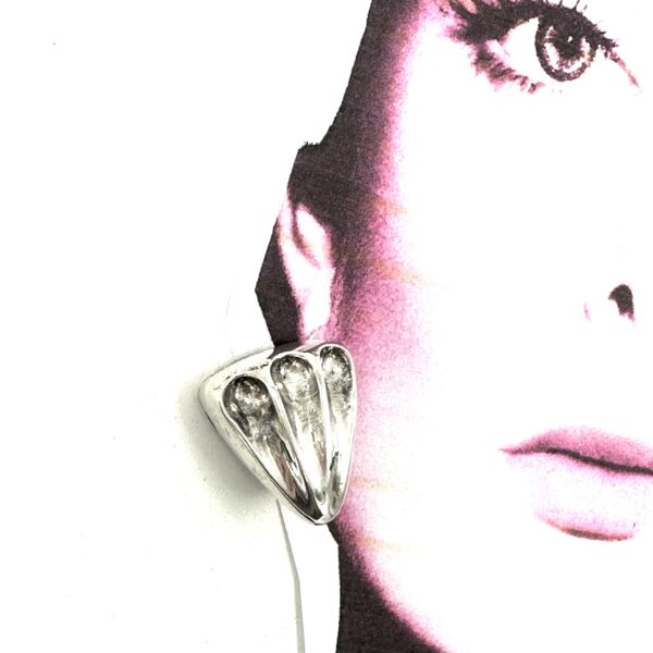 These Robert Lee Morris Silver Triangular Button Earrings are defined by three deeply carved ridges that create an aerodynamic look. Clip ons, they are elegant and can be positioned at exactly the right angle on the ear.