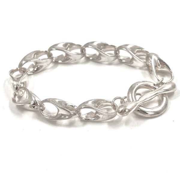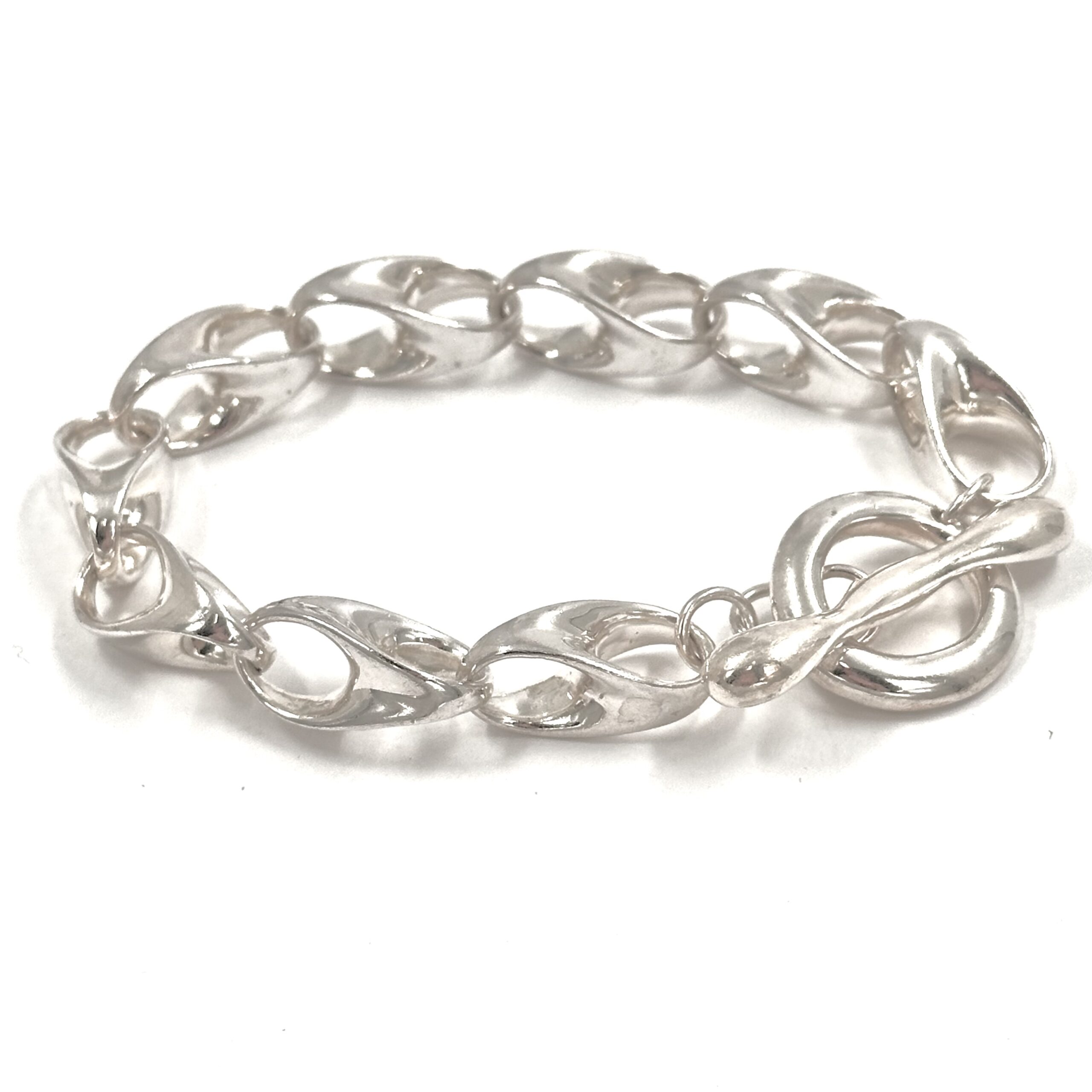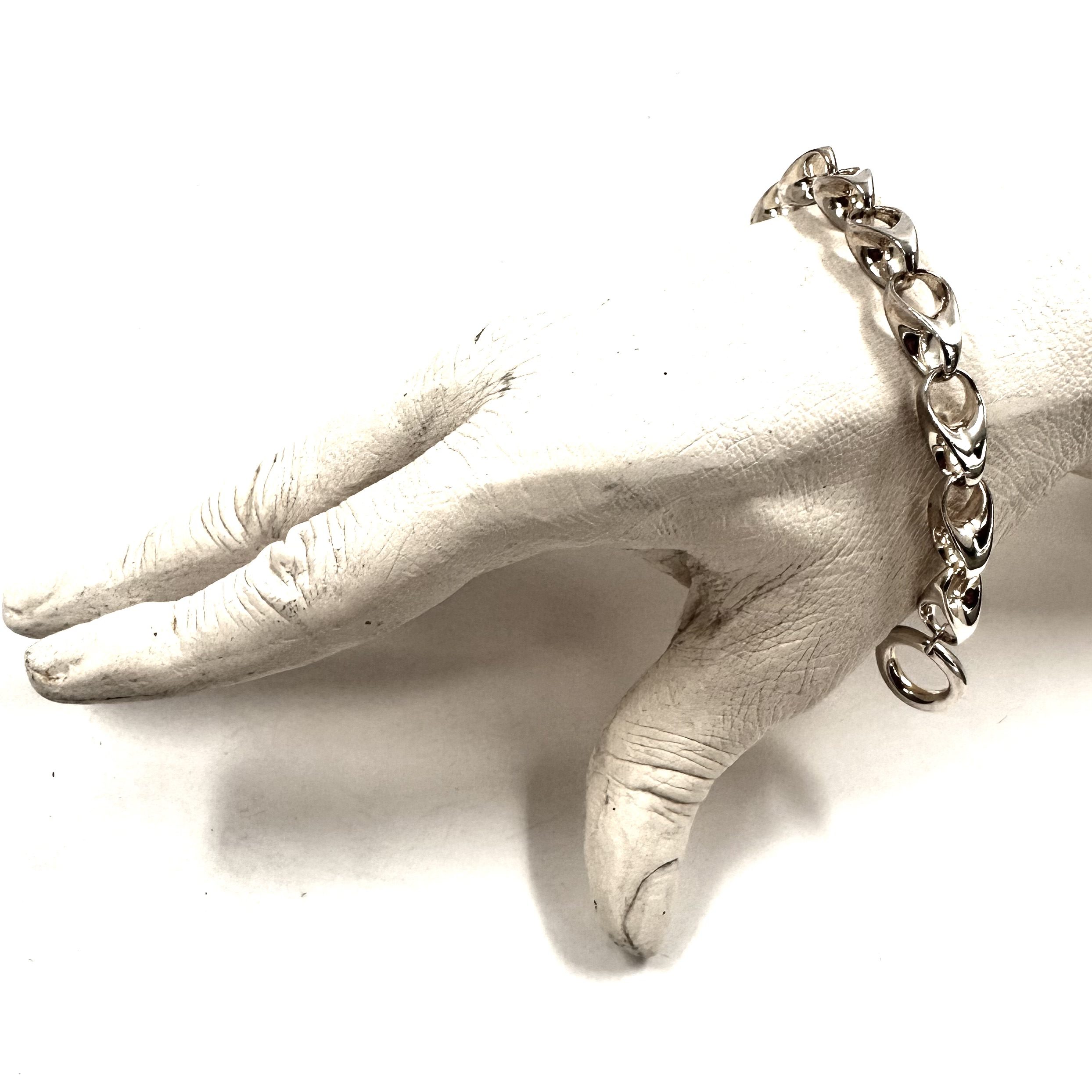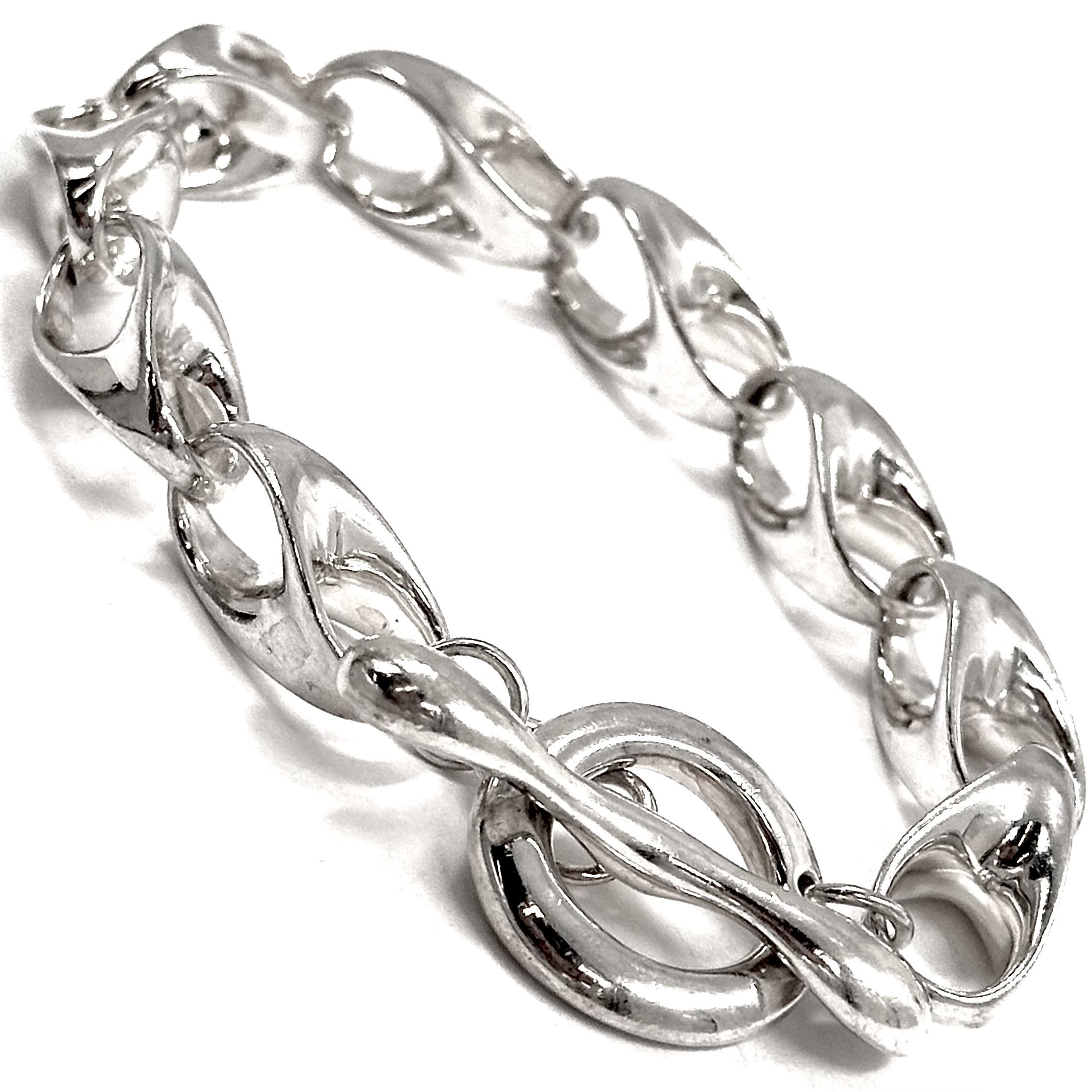The Robert Lee Morris Silver Whisper Chain Bracelet is an example of how Morris carved newly invented links to make his work as original as possible. This is Whisper Chain, one of several iconic links that were part of the wide design vocabulary. Airy, sculptural and bone like, this chain is very unique and lovely to wear. It has a substantial toggle and ring clasp.