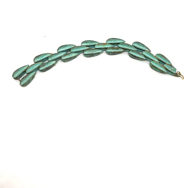 Ionic and classic RLM this bracelet , a small dart linked bracelet, is in bright verdigris color, on brass. Â Verdigris is the color of brass, Â or copper when oxygen interacts with the metal a salt, or oxide is formed, which becomes green. This process is speeded up through the use of chemicals that turn shiny brass the needed color of green. The small dart bracelet is a classic design from 1980 using cast forms that resemble the end feathers of a throwing dart.