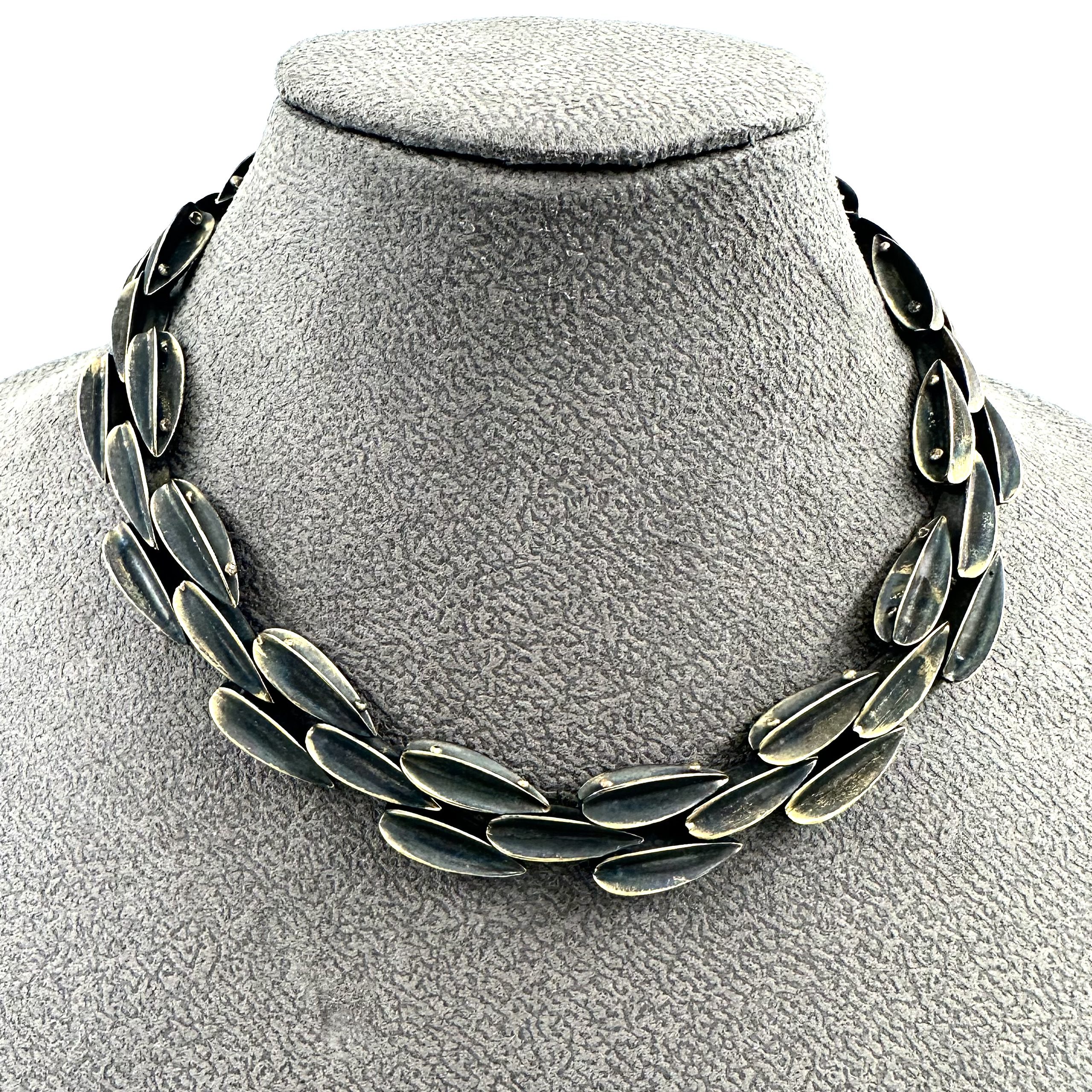 The Robert Lee Morris Small Oxidized Brass Dart Necklace is a dramatic vintage piece from the early 1980’s. The design is based on the feathers of a throwing dart. This is an architectural form that is four sides tapered to a point and Morris found that it was a building block for an entire new collection. The darts could be linked together with riveted pins that allowed for a flexible chain to be built. The fact that the four sides were flat and polished created a sparkle effect that turned this group into a successful diamond like appearance. In all the various sizes and materials, the Dart collection became very popular as earrings, bracelets and short to long necklaces. This piece is a n oxidized brass with burnished edges and glows with a warmth.