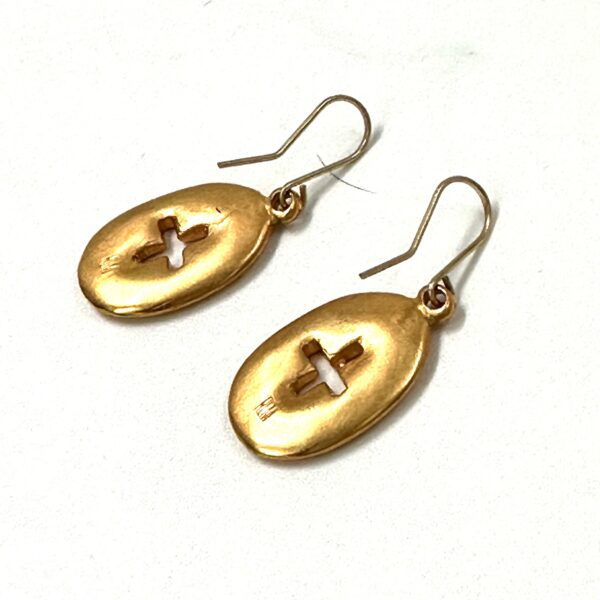 The SMALL EARRINGS section of the Robert Lee Morris earring archives is not very big. Robert Lee Morris is usually known for larger bolder dramatic earrings, and what this group is about is small, dainty, easy to wear with shepherd hook dangles. Easy to throw on and wear for a touch of beauty at the ears, but nothing too dramatic. These Robert Lee Morris Small Watermelon Cross Earrings are a perfect everyday lightweight earring. Matte gold plated brass. 14k gold wires.