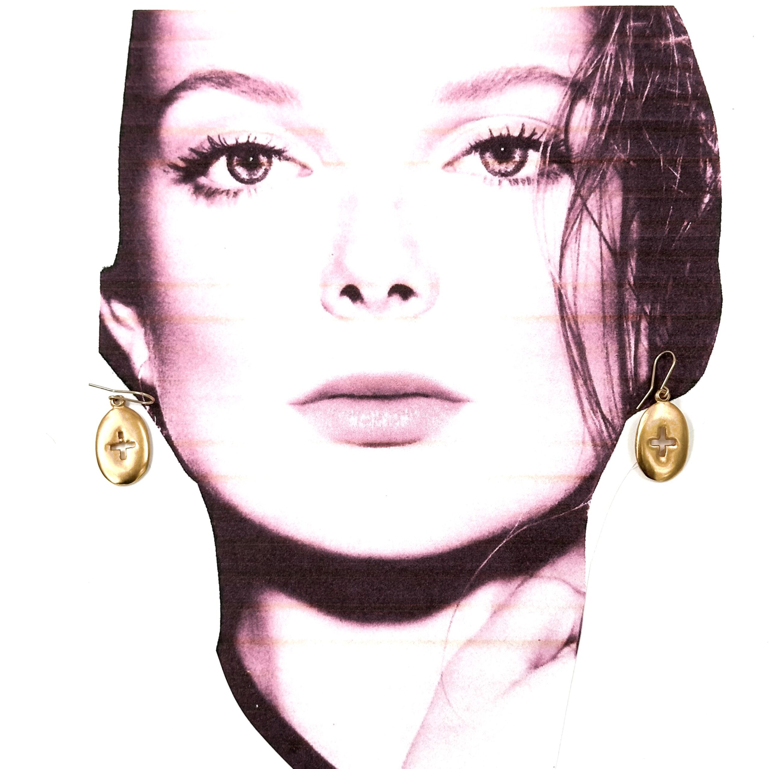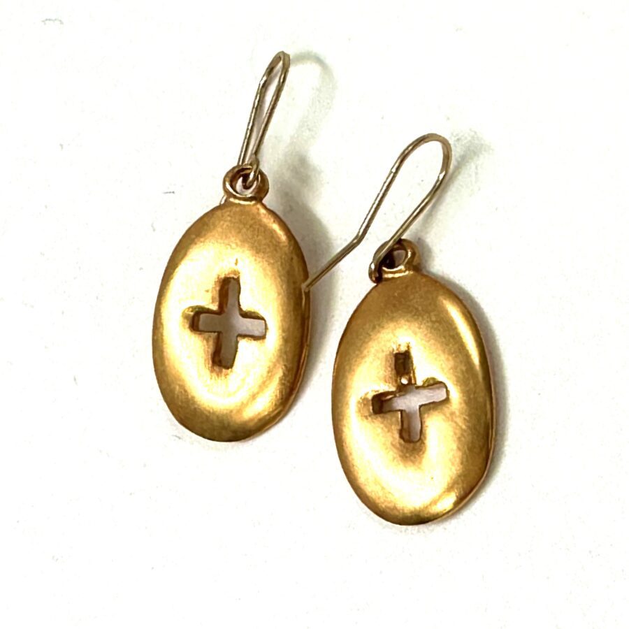 The SMALL EARRINGS section of the Robert Lee Morris earring archives is not very big. Robert Lee Morris is usually known for larger bolder dramatic earrings, and what this group is about is small, dainty, easy to wear with shepherd hook dangles. Easy to throw on and wear for a touch of beauty at the ears, but nothing too dramatic. These Robert Lee Morris Small Watermelon Cross Earrings are a perfect everyday lightweight earring. Matte gold plated brass. 14k gold wires.