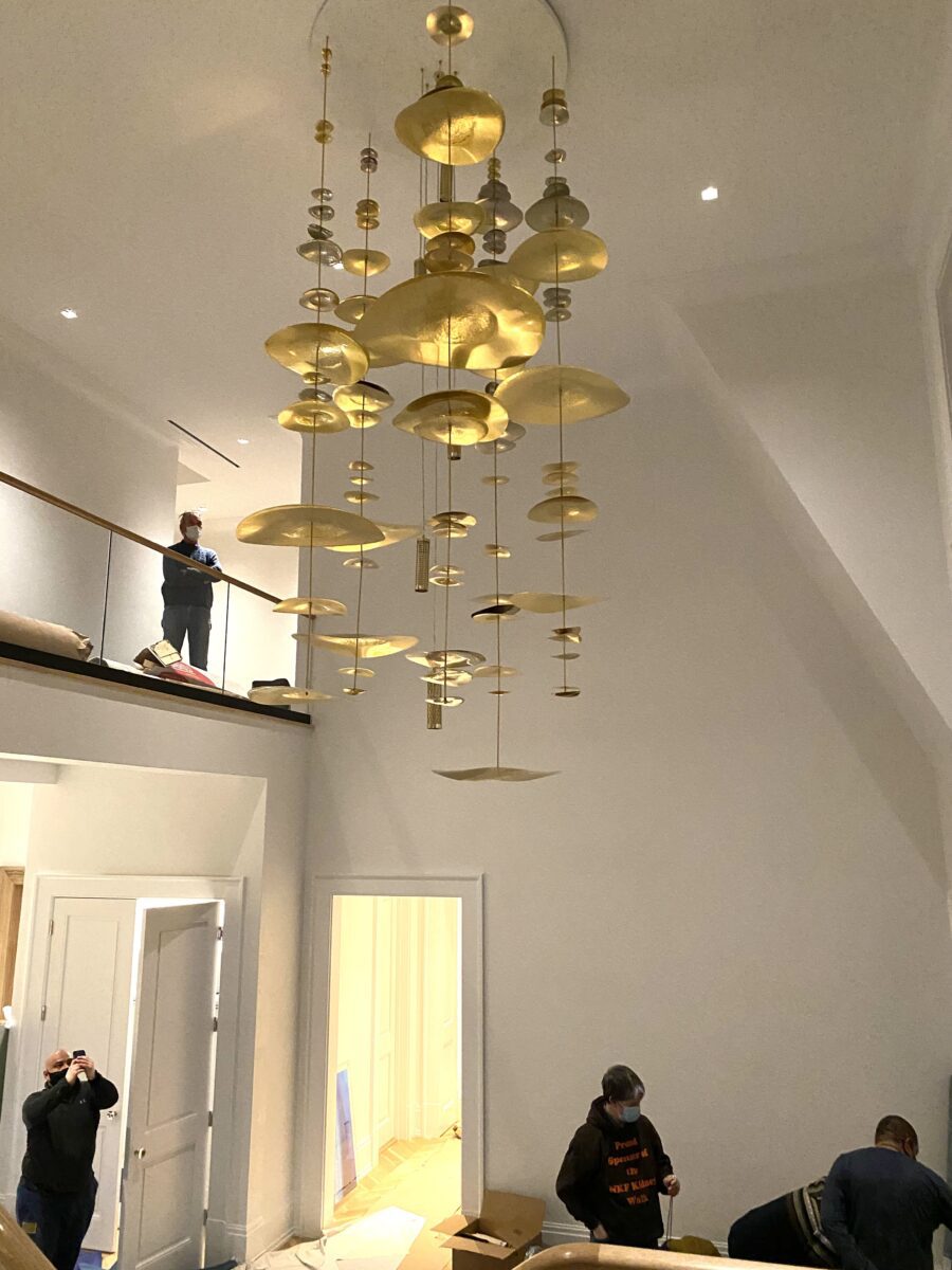 This Robert Lee Morris Squadron Chandelier is a 11 foot long construction of brass for a new home in Sagaponack NY, installed in 2022. It is a spectacular arrangement of Iconic horizontal forged brass discs with an asymmetrical spacing that is like a Eucalpytus plant.