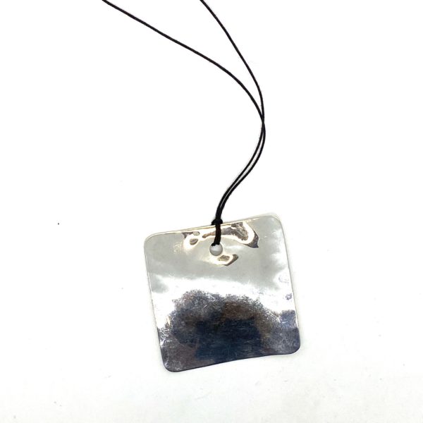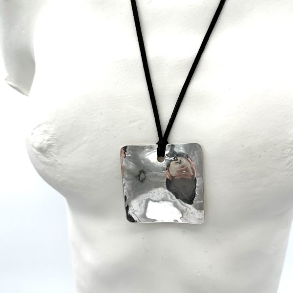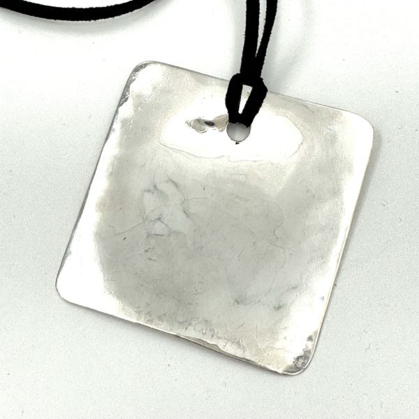 This is one of the key shapes and forms in my Mandala collection from 2002, a square Sail pendant on black linen cord. The Sails, were round, square, triangular and oval, and one side was convex and the other concave, made to look like they were cloth sails in the wind. Featured on the cover of my book The Power of Jewelry, this is a bold and Zen-simple form that is very easy to wear at any length desired.