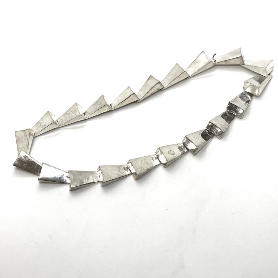 .This is another architectural design, one of a kind, that plays with the idea of Liquid Geometry, making hard angles soft and fluid to wear on the body. It is striking, bold and long, made in the early 1980’s it does have signs of wear but is quite striking visually. Hollow forms, that give the appearance of being chunky and solid.