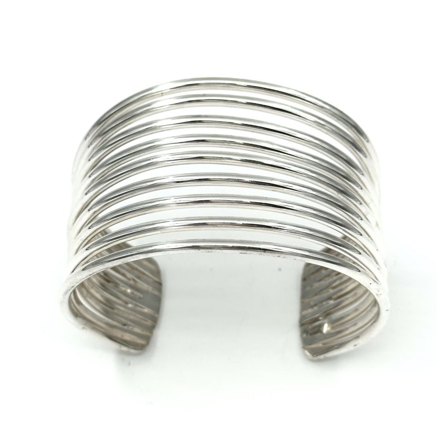 This wide and dramatic Robert Lee Morris Sterling Silver 9 Wire Cuff is classic and dramatic. Like a silver slinky, this cuff is airy and yet bold, with a very classic iconic look of RLM. It is chunky and has a nice weight to it, at 2.5 oz of silver. Great addition to any chic wardrobe.
