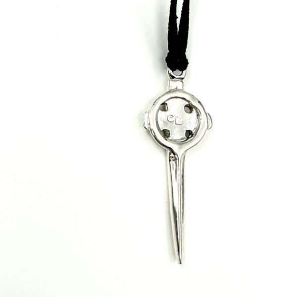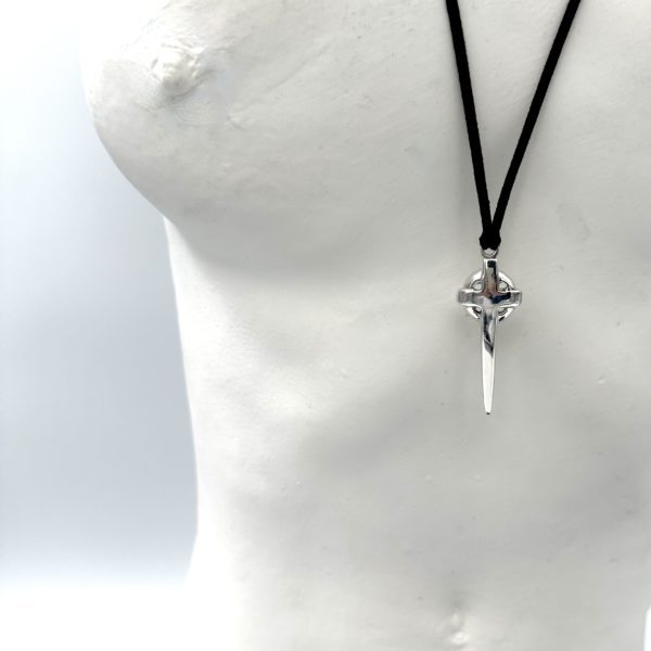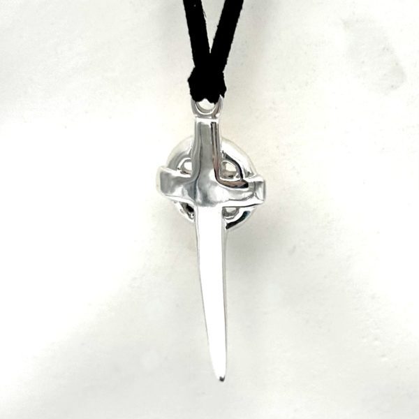 This elegant Robert Lee Morris Sterling Silver Celtic Cross Dagger Pendant was inspired by a trip to Ireland and the Hebrides Islands. The classic Celtic cross design is basically a plus sign within a circle. The inspirations were of ancient stones carved into these powerful shapes in a variety of ways. This pendant is a mixup of the celtic cross and a sword, or sharpened staff. Like the stones that dotted the Irish countryside, this silver piece carries the romantic vibes of myths and legends around the United Kingdom.