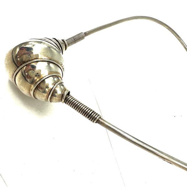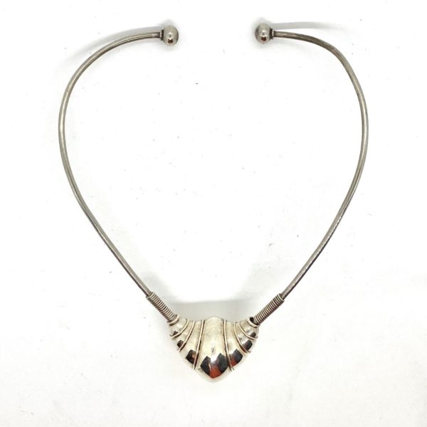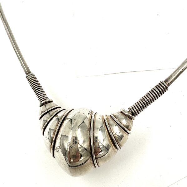 This Robert Lee Morris Sterling Silver Clutcher Necklace is extremely early, from 1973-74. Â It is a founding member of the NAUTILUS family, based on Sacred Geometry, and the spiral form of the Nautilus shell. Hollow, and in mint condition, this is a major collector’s item. The silver wires that clasp around the neck are just flexible enough to allow for the spring action that holds it in place.